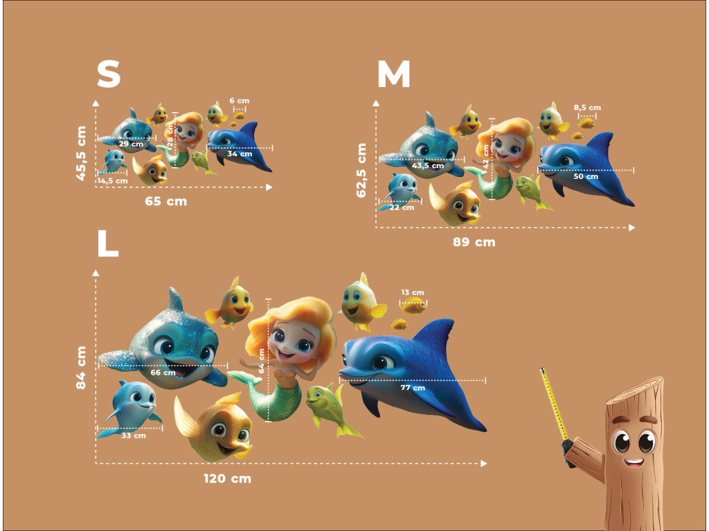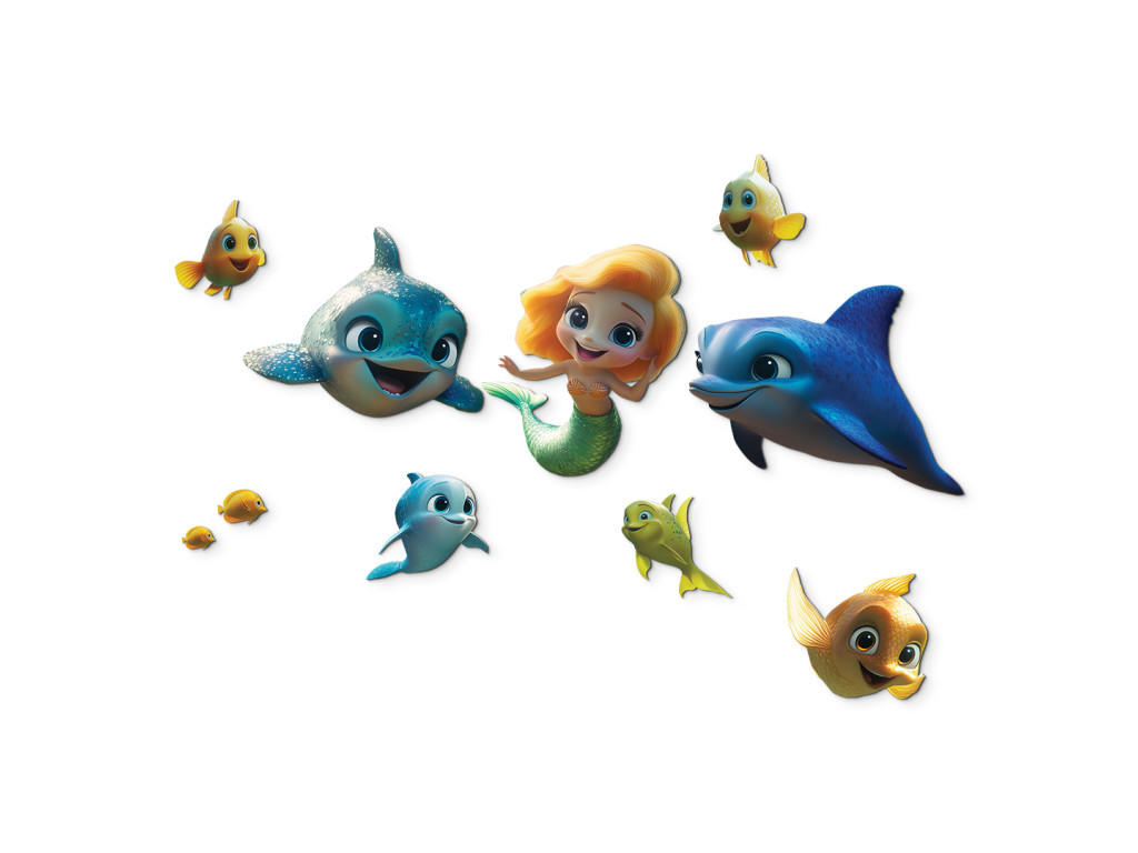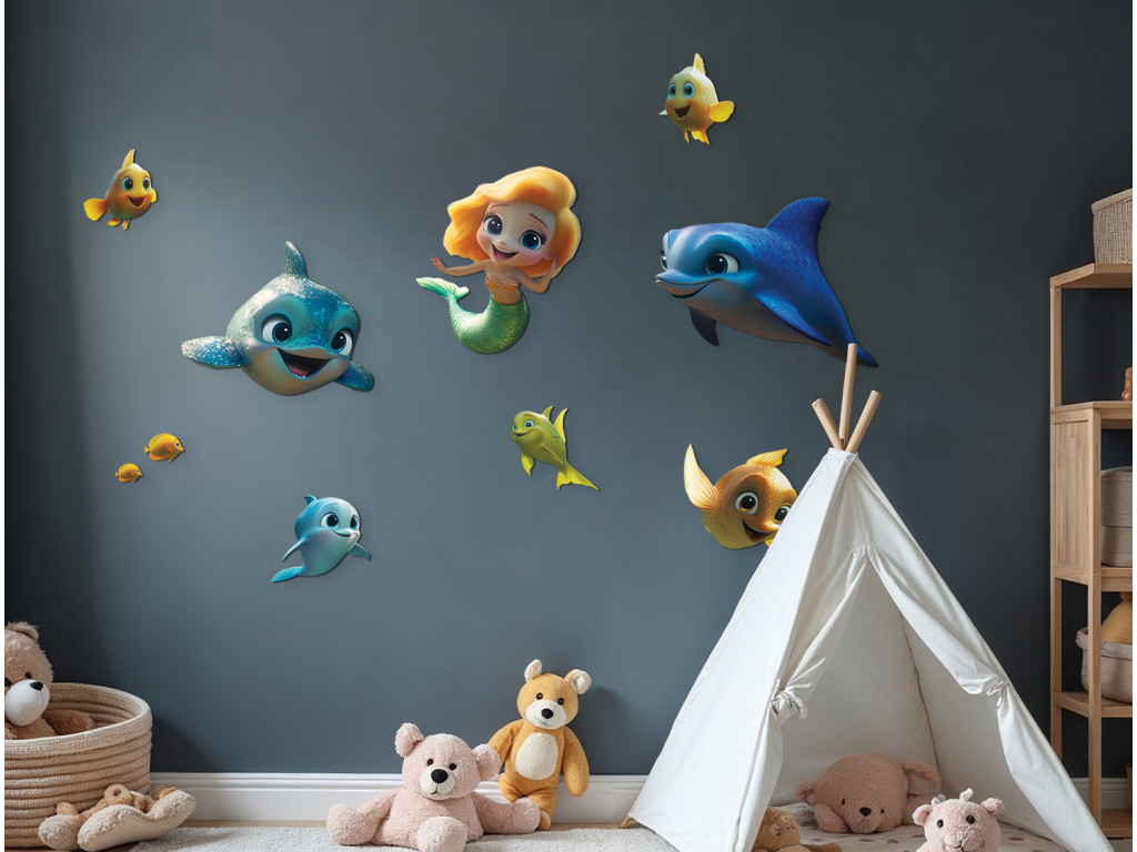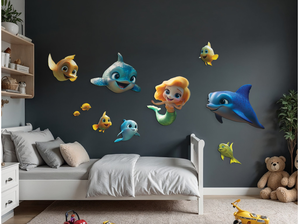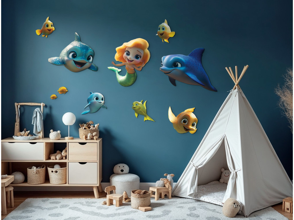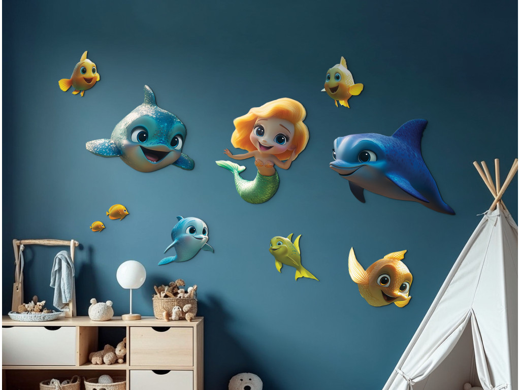 Cette décoration murale joyeuse transporte les enfants dans un monde sous-marin coloré rempli de personnages de contes de fées. Le rôle principal est tenu par une sirène aux cheveux orange et à la queue verte, accompagnée de deux dauphins bleus et de poissons colorés. La scène est ludique et onirique, idéale pour égayer n'importe quelle chambre d'enfant.