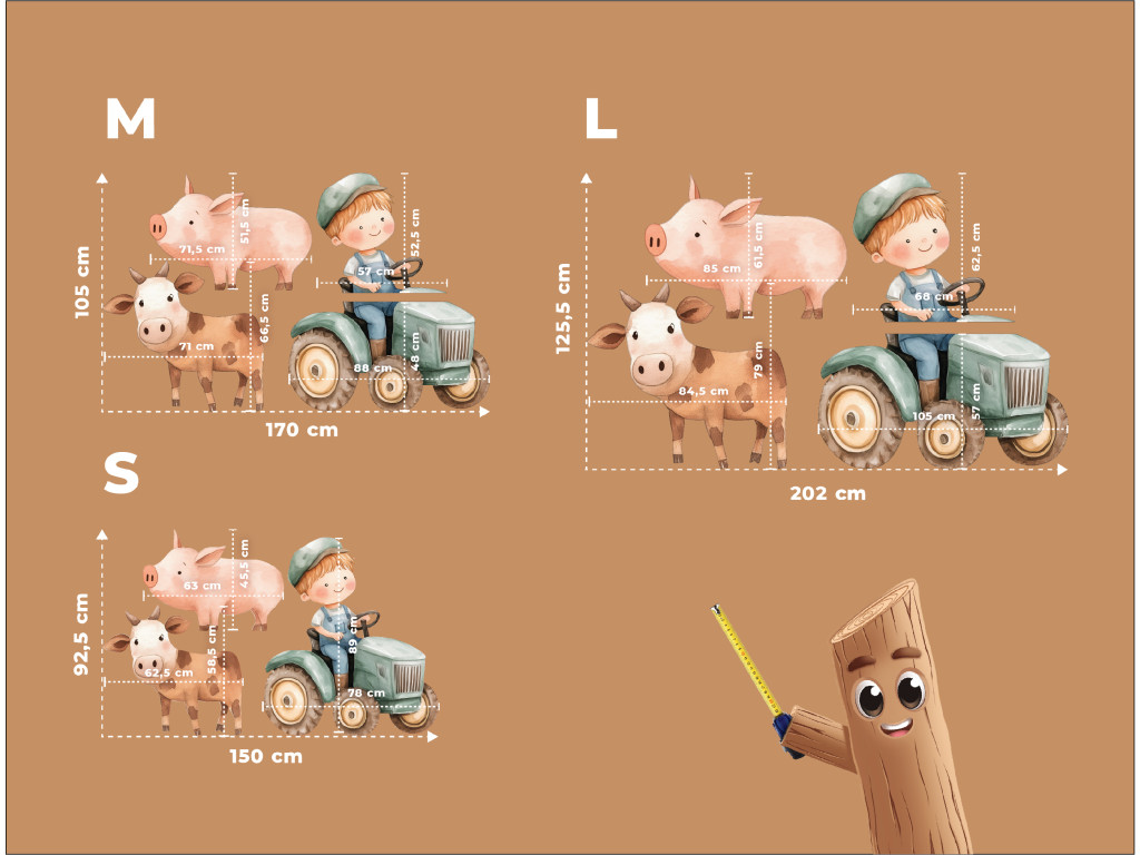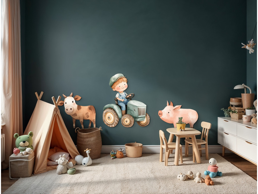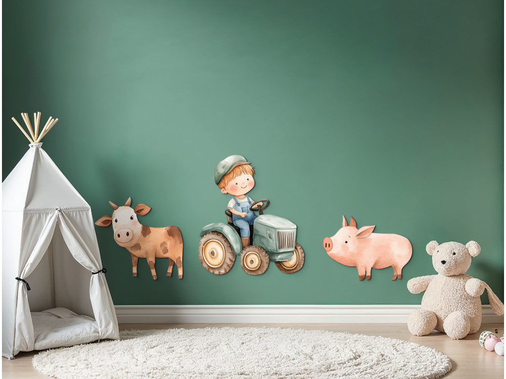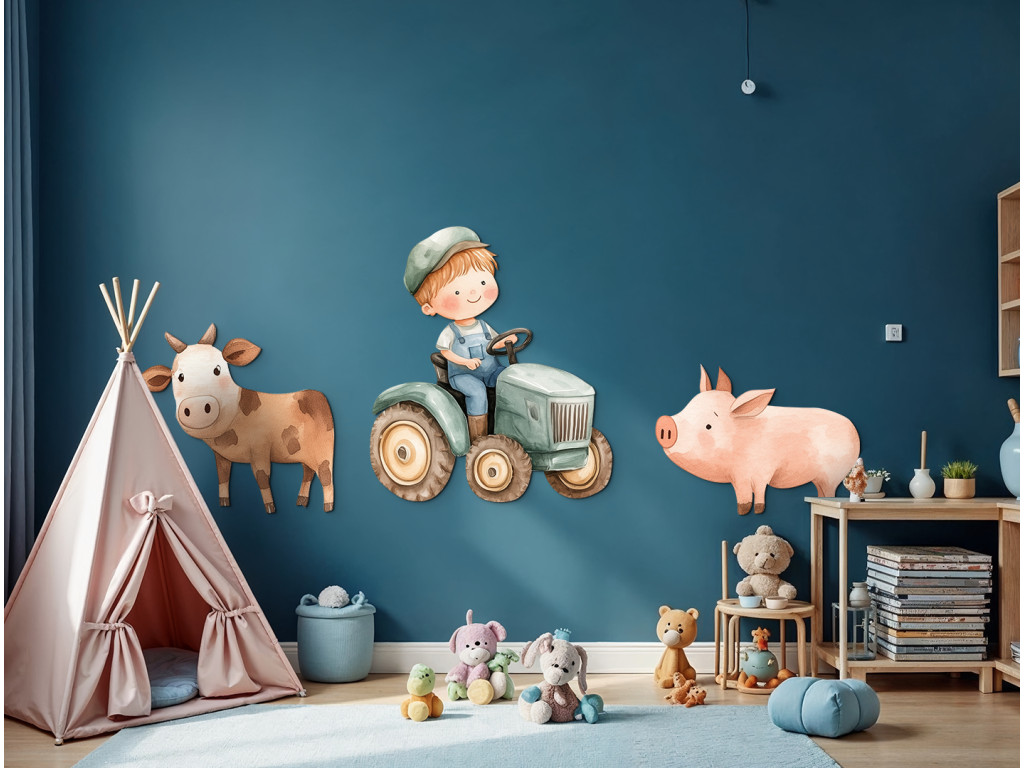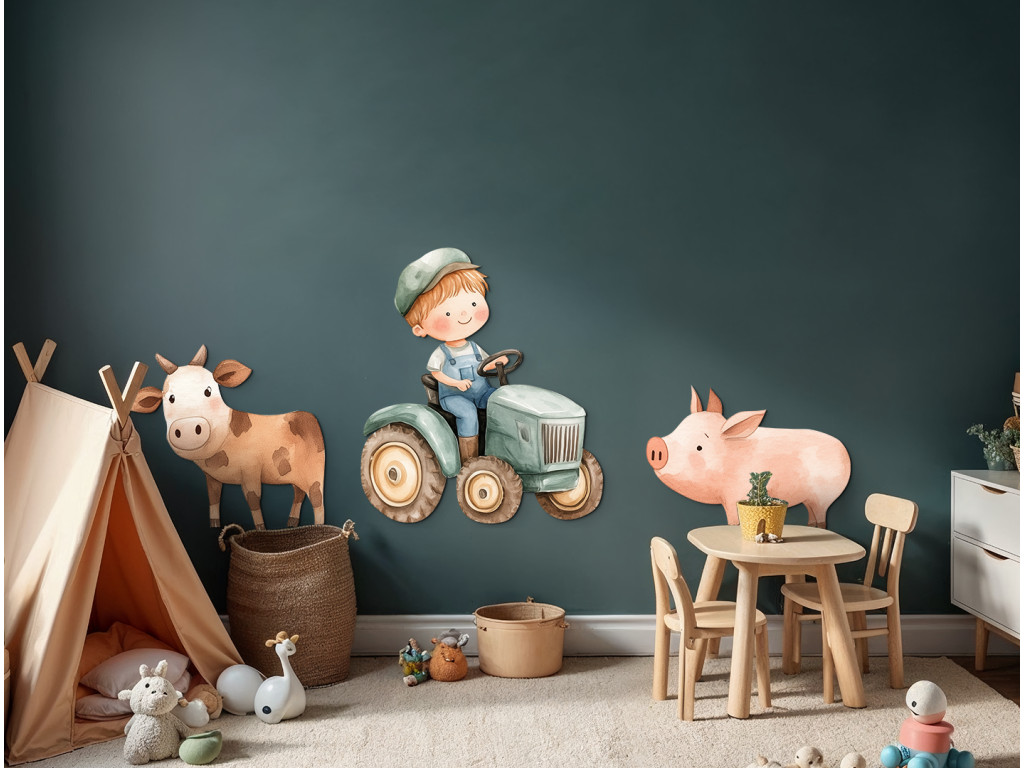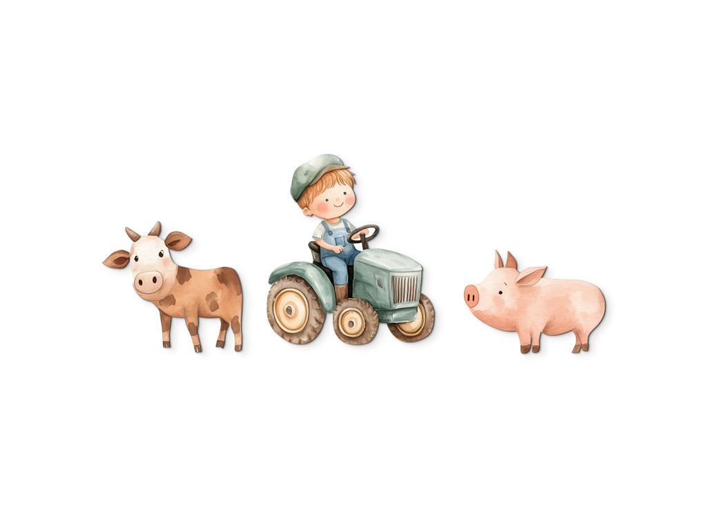 Le petit fermier conduit joyeusement son tracteur, accompagné d'un cochon et d'une vache, ses deux fidèles compagnons de la ferme. Cette jolie illustration est pleine de couleurs, de mouvement et de vie rurale. Une décoration idéale pour la chambre d'enfant de tous ceux qui aiment le monde de la ferme et les animaux.