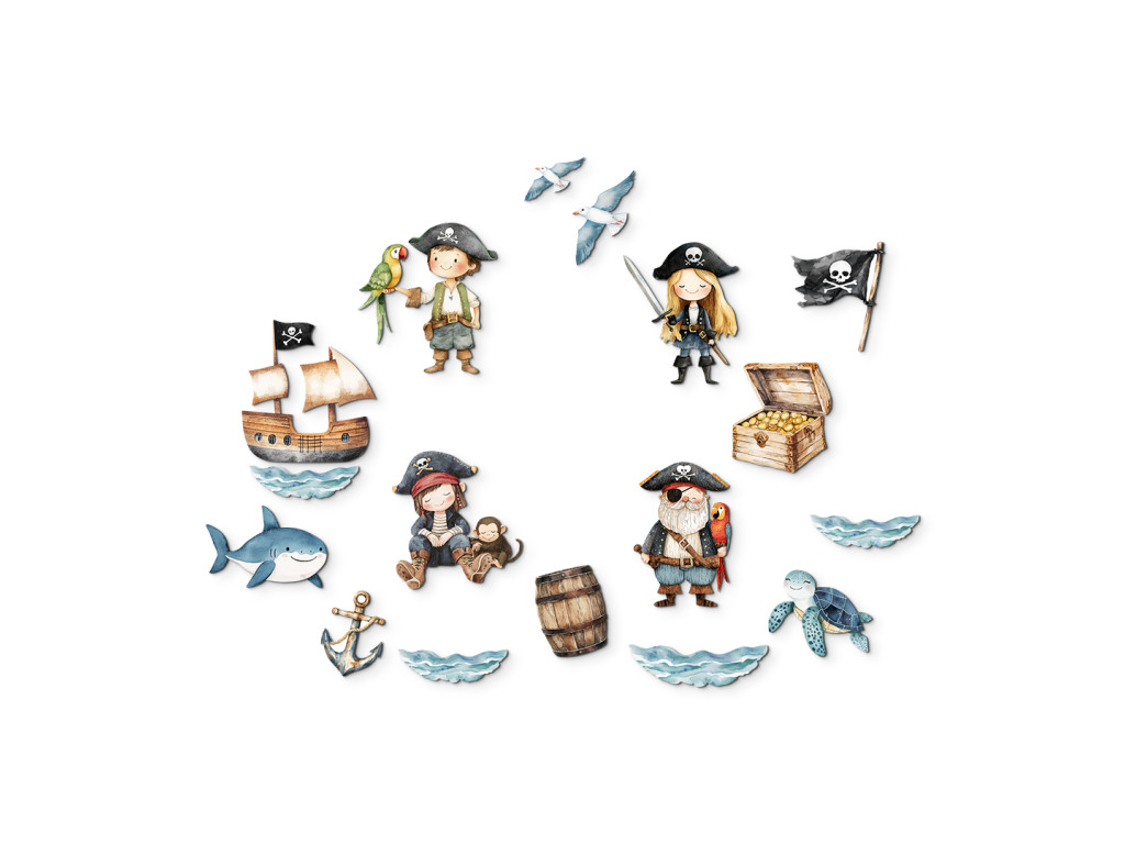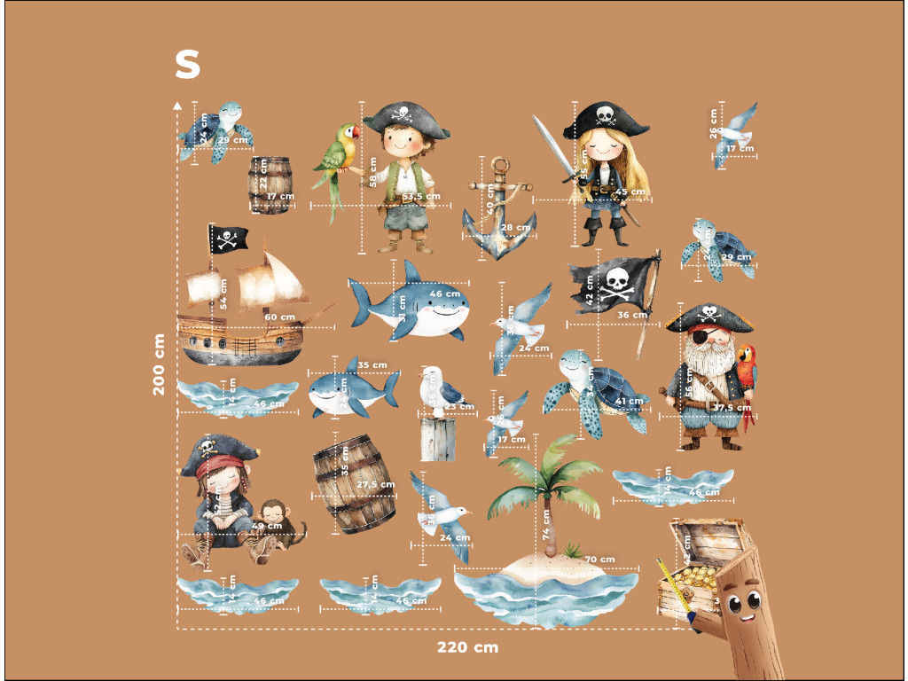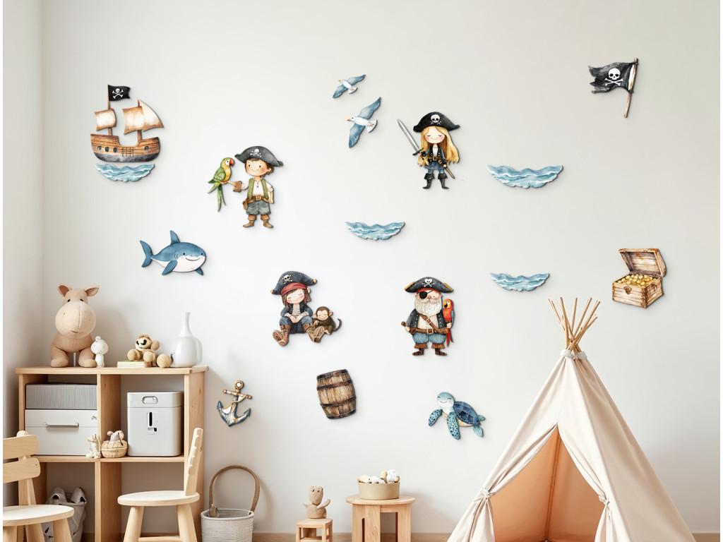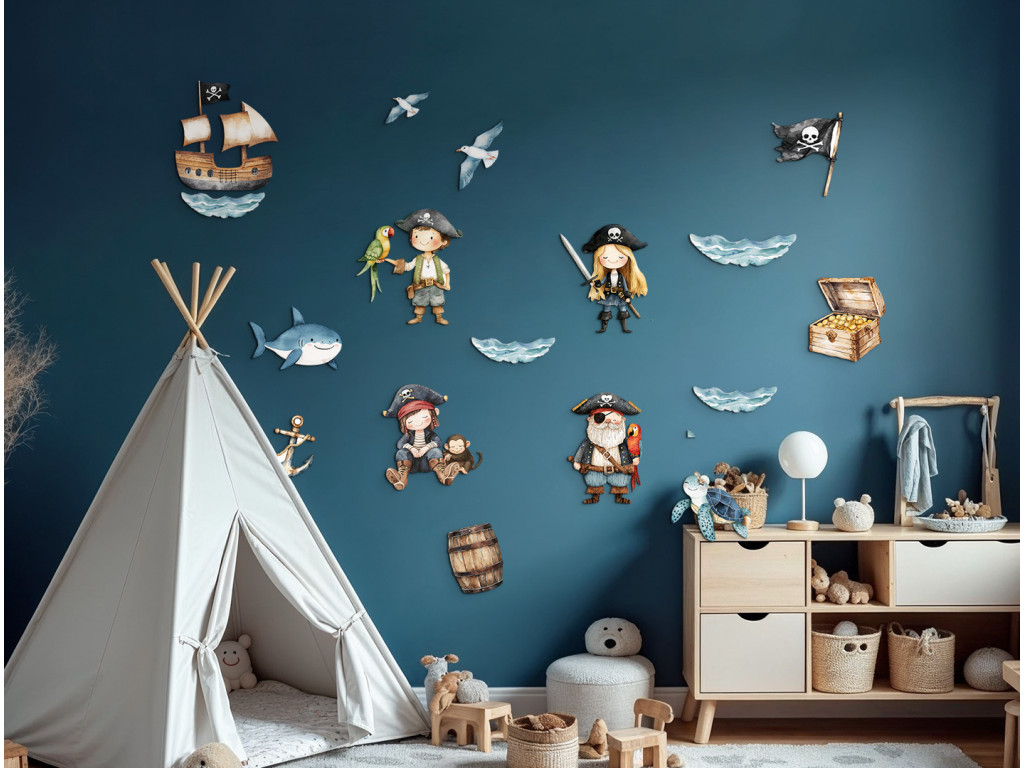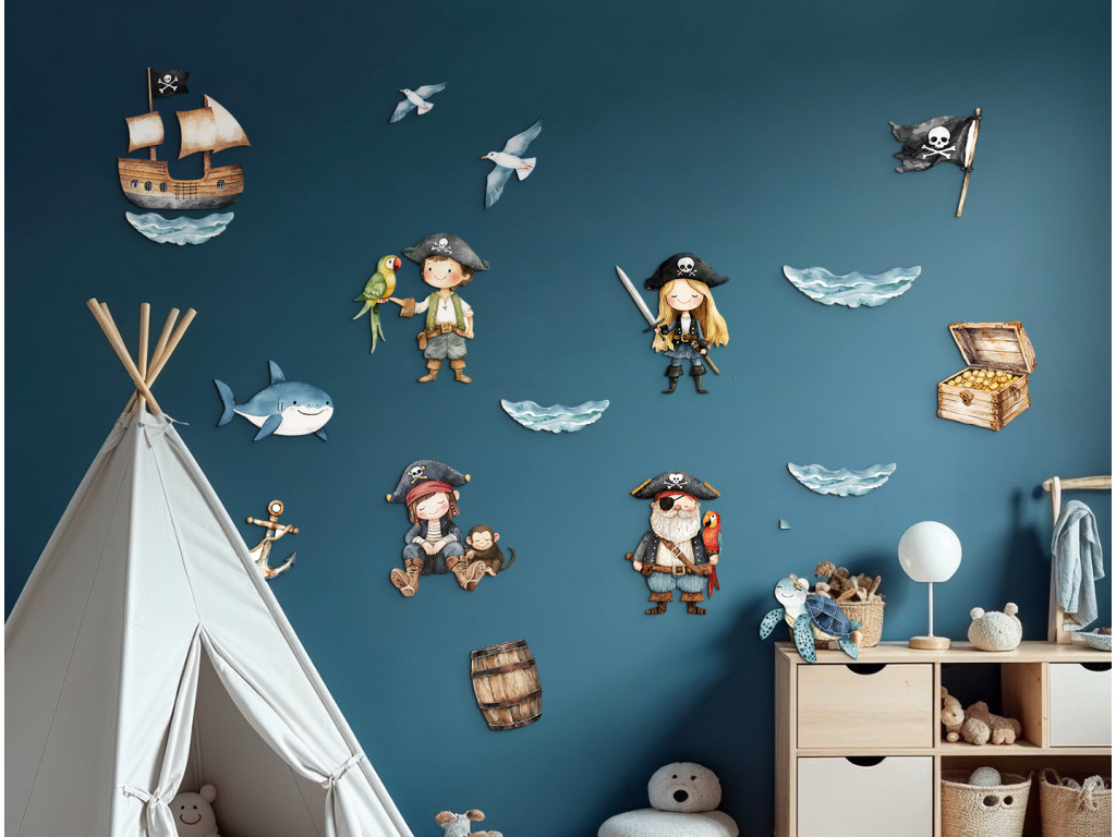 Une décoration illustrée de manière ludique et pleine d'aventures, où quatre pirates enfants découvrent le monde océanique. Des baleines, des poissons et d'autres créatures marines nagent autour de leur bateau, créant ensemble une scène joyeuse et colorée. Un excellent complément à la chambre d'enfant pour les petits aventuriers.