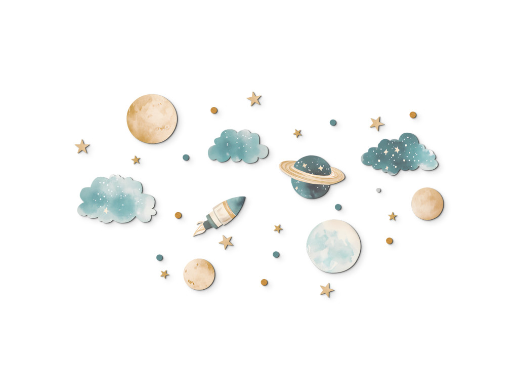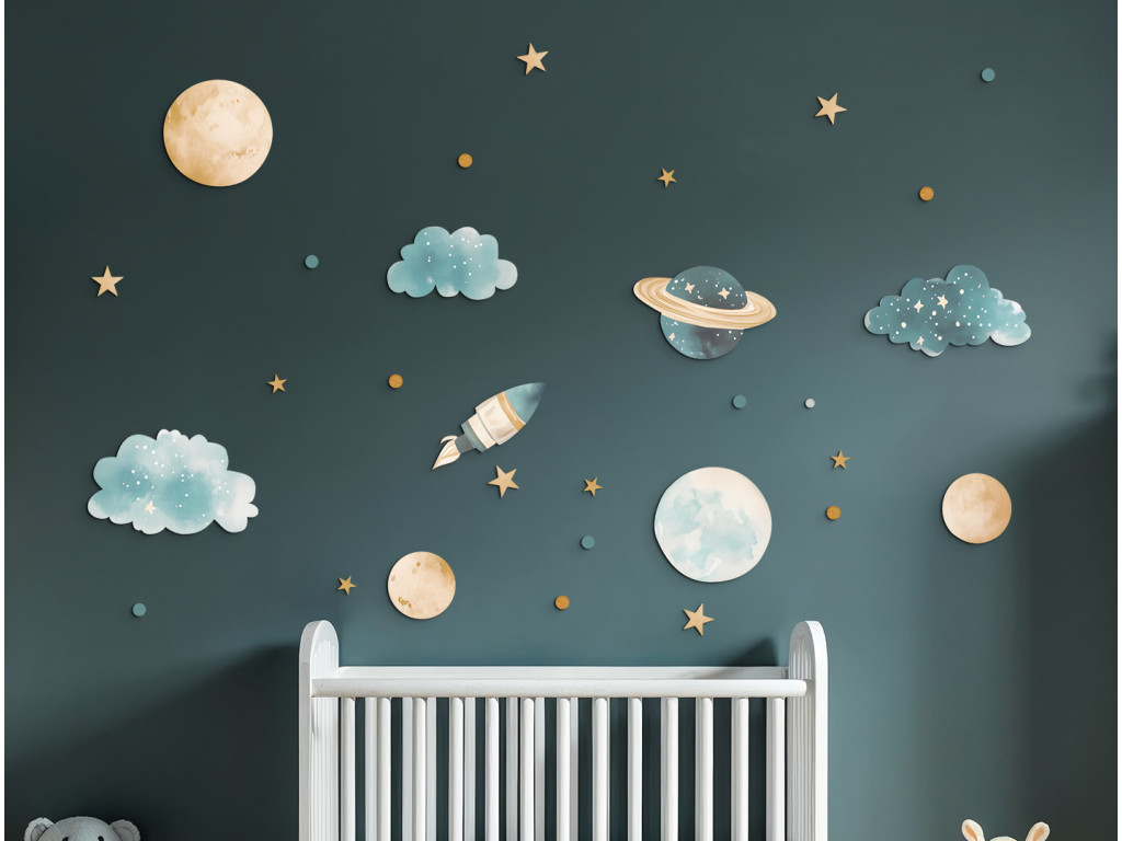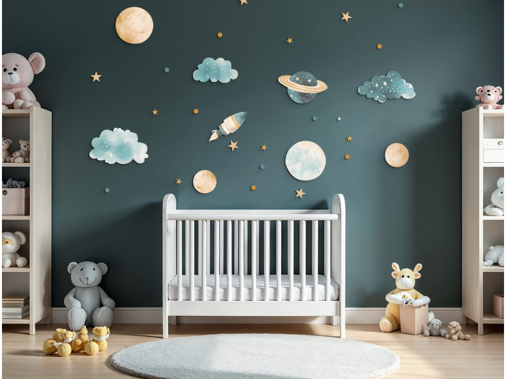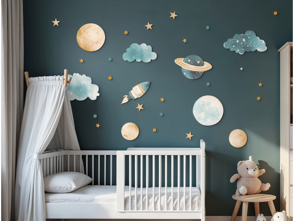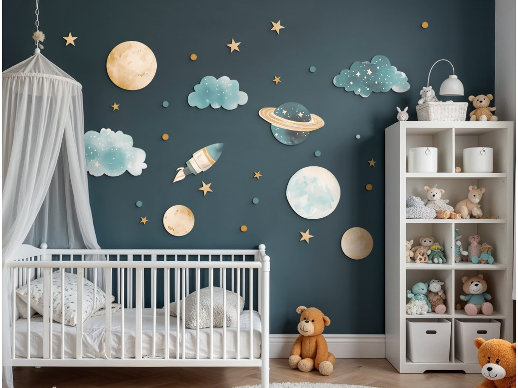 Ensemble décoratif avec des motifs de planètes, fusées, nuages et étoiles dans des couleurs pastel douces. Idéal pour créer une atmosphère calme et onirique dans une chambre d'enfant avec une touche d'aventure spatiale.