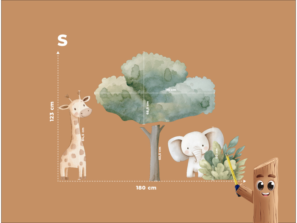 Une girafe délicate se tient tranquillement sous un grand arbre, tandis qu'un petit éléphant jette un regard timide depuis derrière un buisson. L'illustration aux tons naturels atténués dégage une impression de calme et d'amour – une décoration idéale pour une chambre d'enfant avec une touche naturelle.