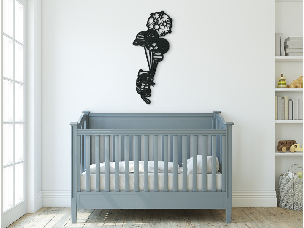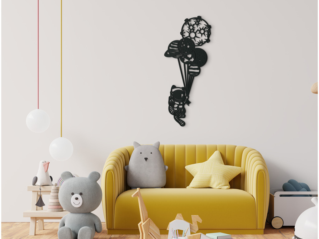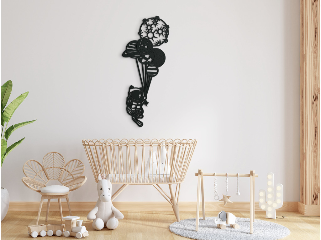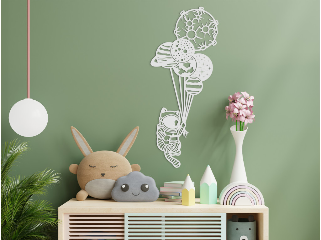 L’astronaute tenant des planètes comme un bouquet de ballons apportera une atmosphère féerique à la chambre d’enfant. L’autocollant en bois est idéal au-dessus d’un lit, d’un bureau ou d’une commode. Il convient aux chambres d’enfants modernes et classiques. Le tableau en bois illuminera chaque pièce.