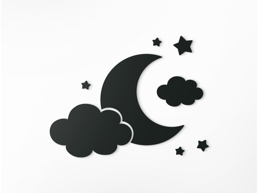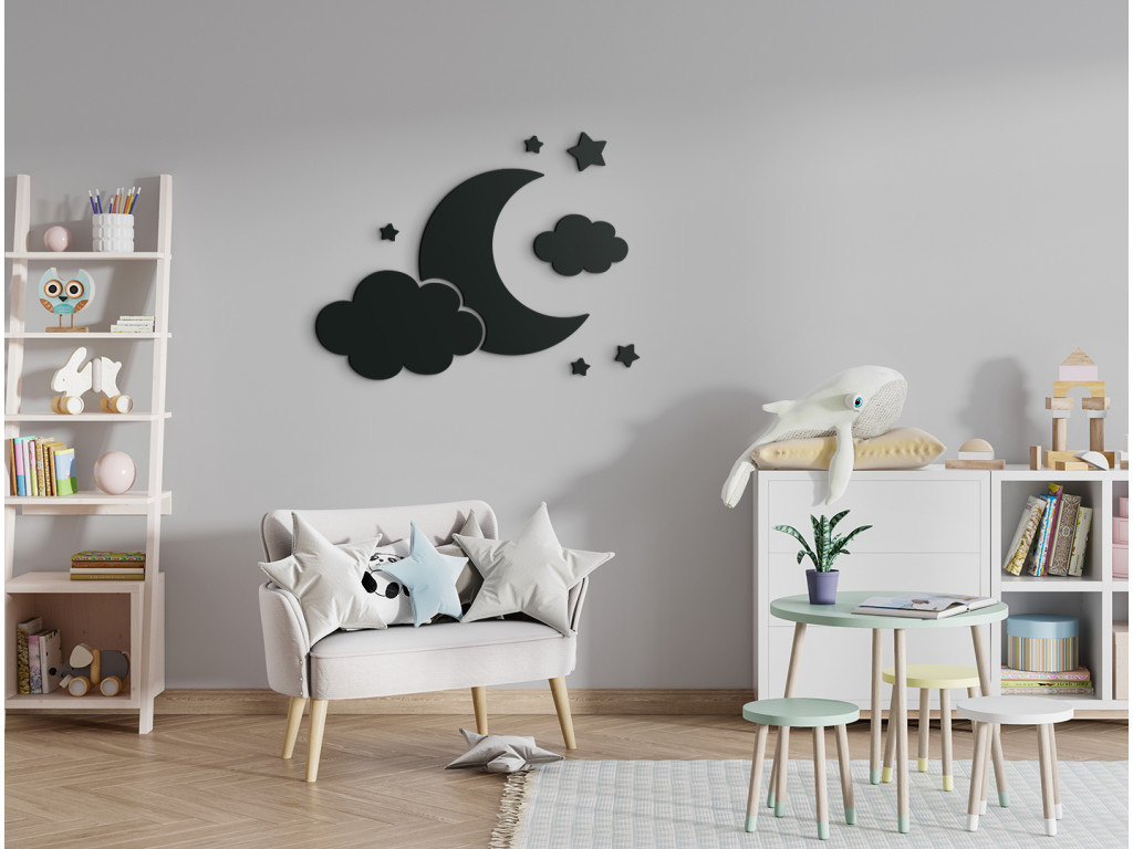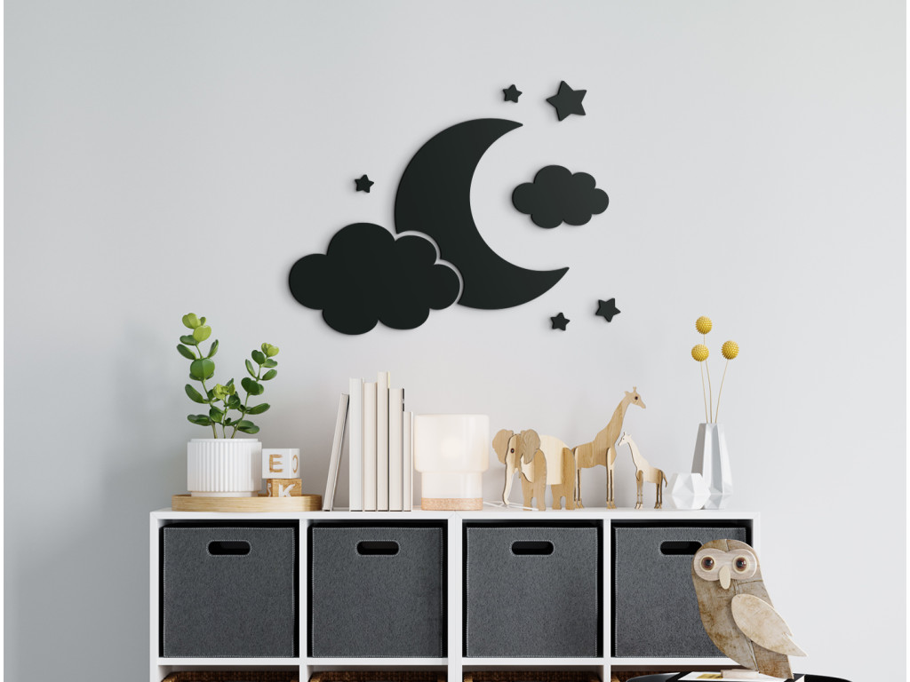Mesiačik je symbolom noci. V podobe nálepky je preto vhodný na všetky miesta v detskej izbe, najmä však nad detskou posteľou a postieľkou. Drevené obláčiky a Mesiac na stenu budú dieťatko upokojovať a pomáhať mu snívať o pekných snoch. Obláčiky môžete umiestniť nad posteľ, postieľku, komodu. Trendový dizajn dokonale skrášli interiér každého, malého i veľkého milovníka pekných doplnkov.