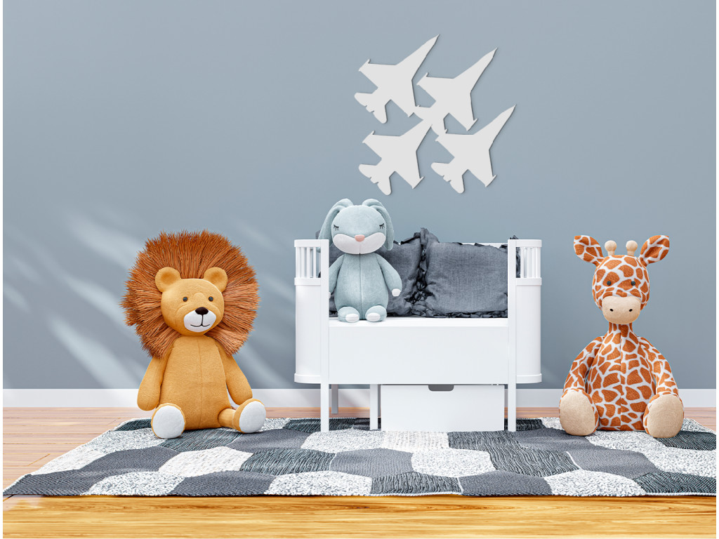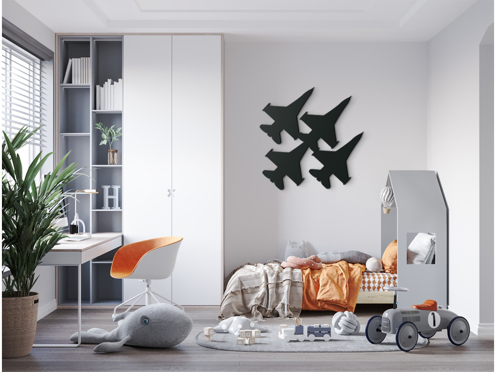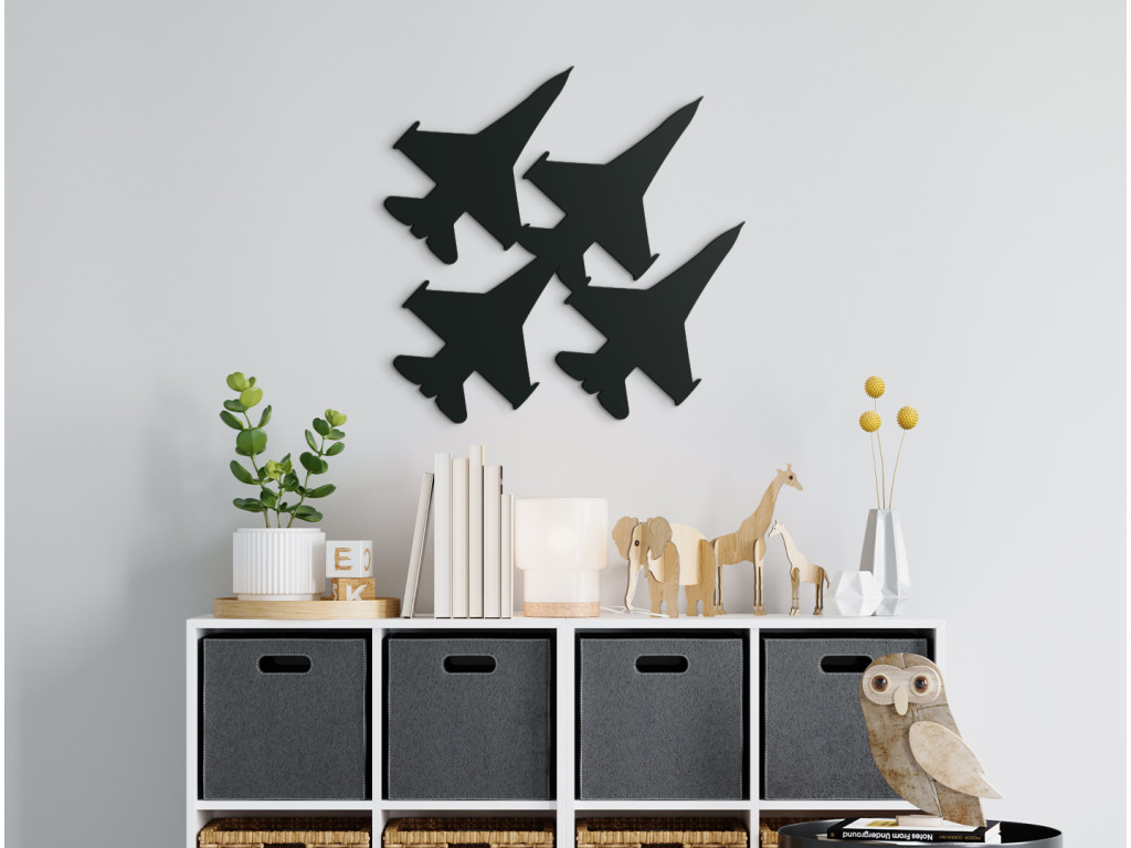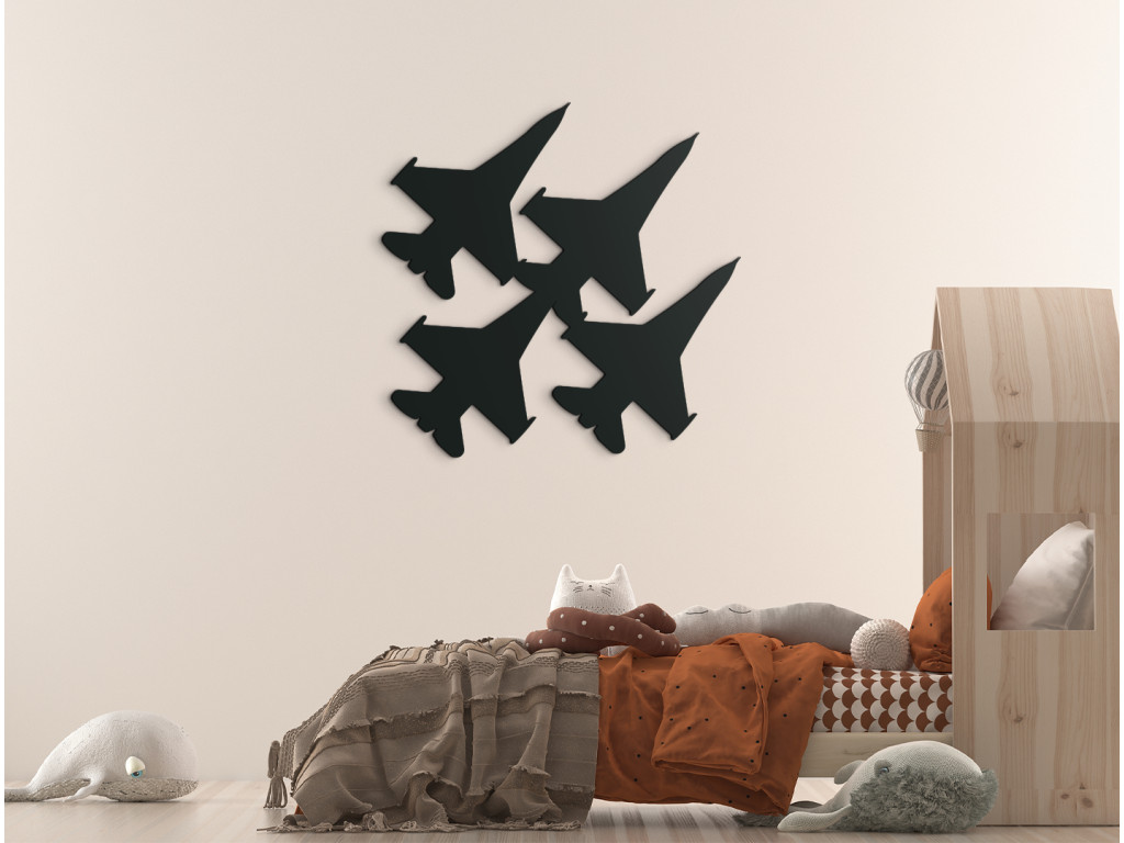 La décoration en bois en forme d'avions de chasse ravira à coup sûr tous les enfants passionnés d'avions, d'hélicoptères et d'aéronefs. Cette décoration murale avec des avions en vol est idéale pour une surface vide au-dessus du lit d'enfant, du bureau ou de la commode.