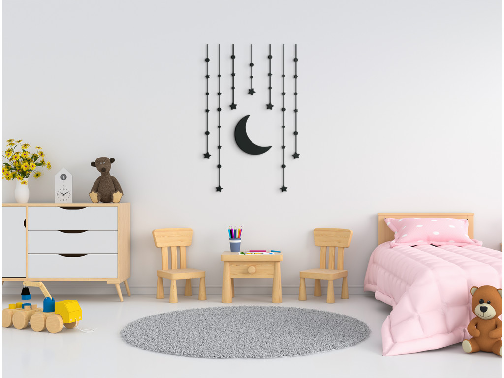 Les étoiles suspendues avec une petite lune sont une décoration idéale pour toute chambre d'enfant moderne. Placez-les au-dessus du lit, de la table à langer ou du bureau afin que votre enfant puisse les admirer chaque jour.