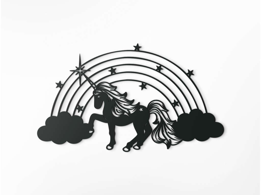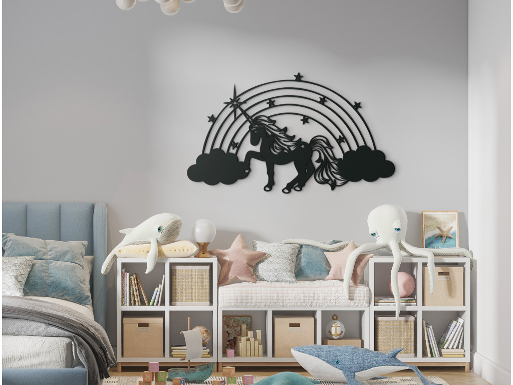 Drevená nálepka do detskej izby s motívom jednorožca zaujme každú malú slečnu. Ústrednou postavou dekorácie je nádherný jednorožec so zvlnenou hrivou a rozviatym chvostom, hrabúci kopýtkom medzi oblakmi. Z obláčikov sa na pozadí dvíha dúha, ktorá je vyšperkovaná hviezdičkami.