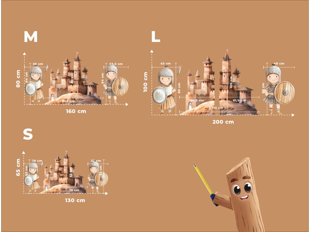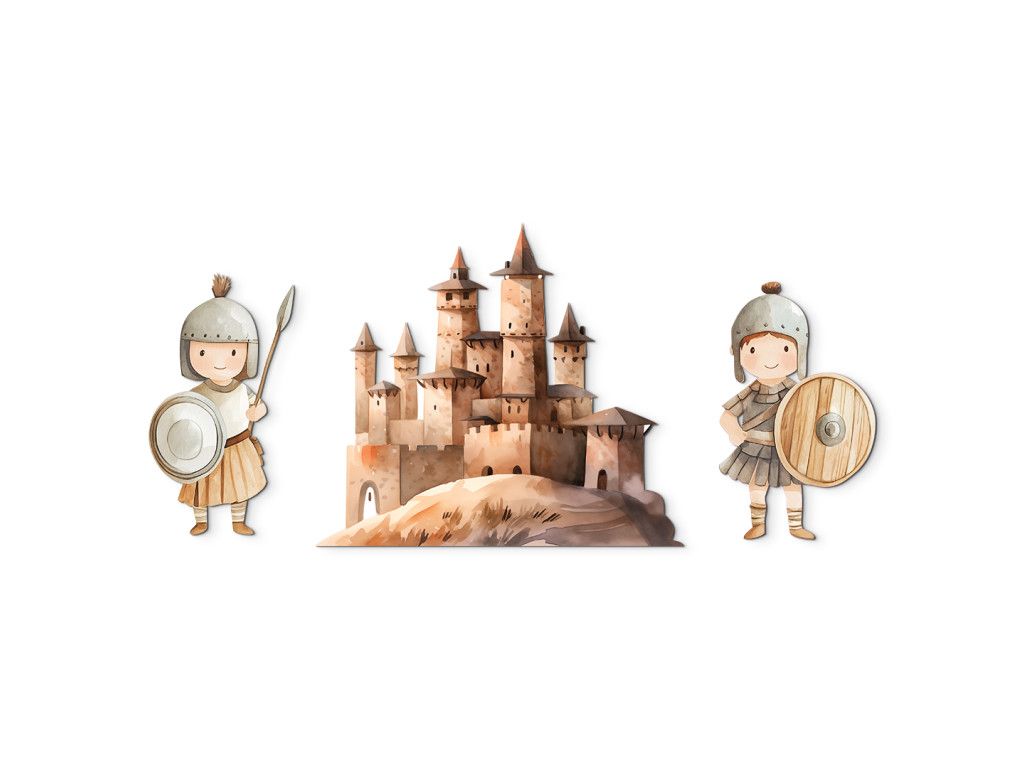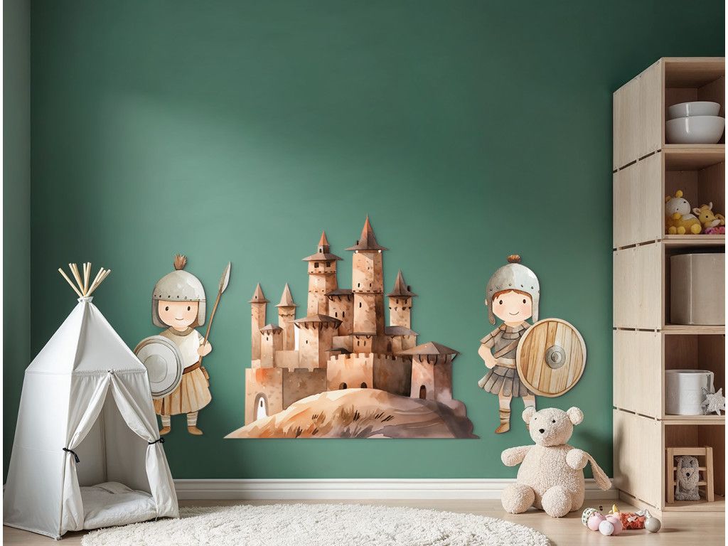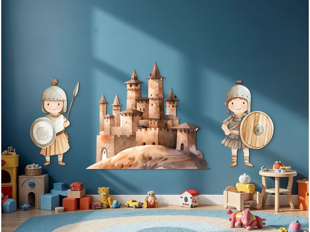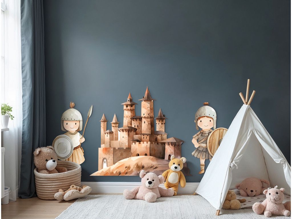 Un château dessiné avec des tourelles comme au temps des princesses est gardé par deux soldats souriants en uniformes anciens. L'ensemble de l'image a un aspect féérique et ludique, comme une scène tirée d'un livre pour enfants rempli de princesses, de chevaliers et d'aventures. Le complément idéal à la chambre des petits rêveurs.