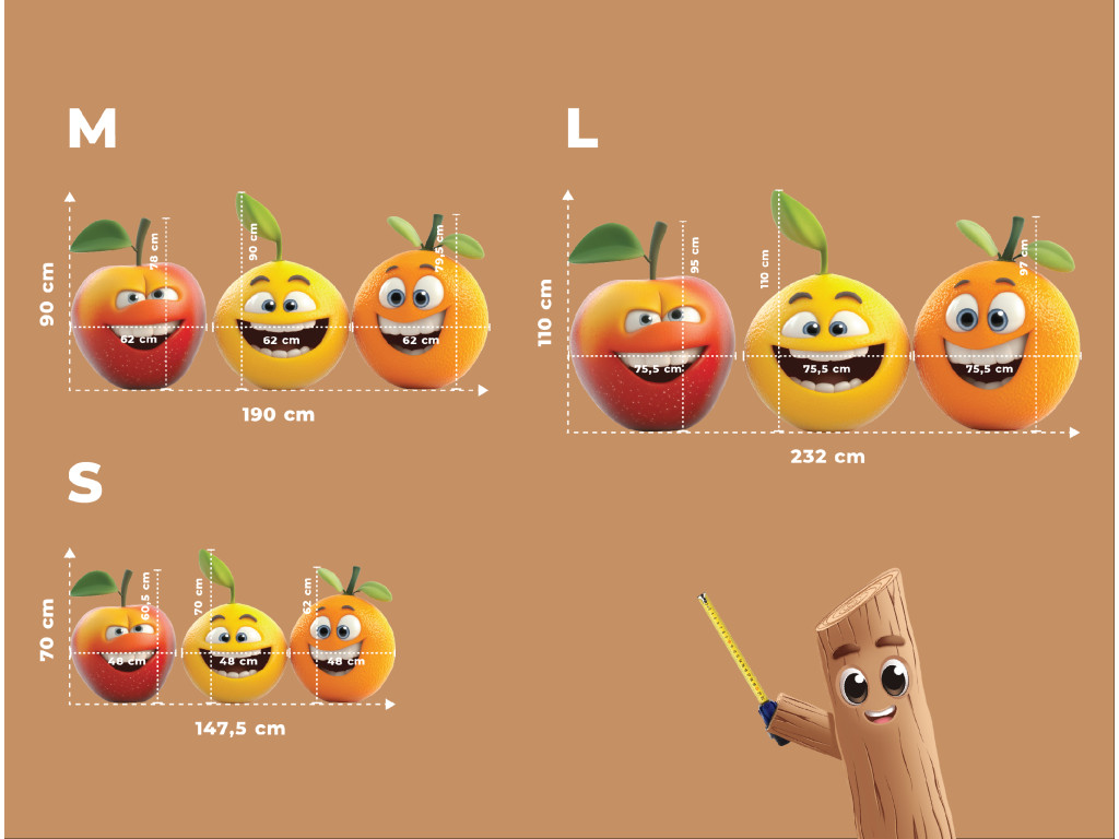 Des amis fruités souriants qui égayeront n'importe quel espace – parfaits pour les petits gourmands et les grands souriants ! Ces adorables personnages apportent de la couleur, de la joie et une énergie positive à la pièce. Idéales comme décoration dans une chambre d'enfant, une crèche ou un coin cuisine.