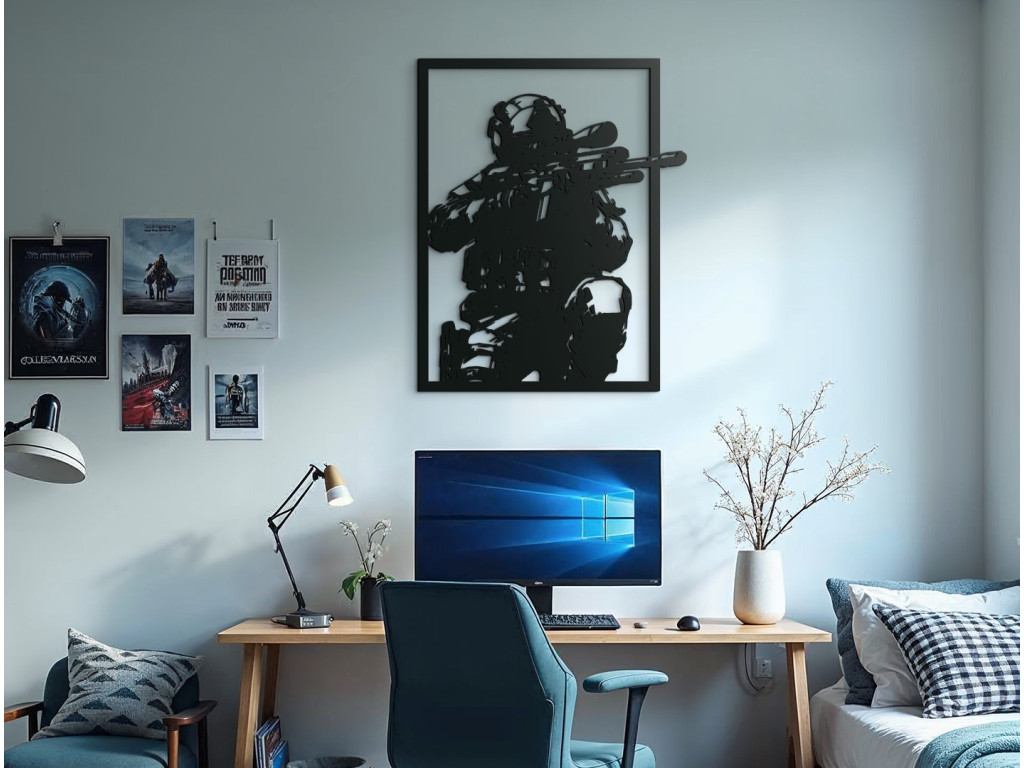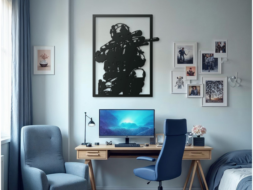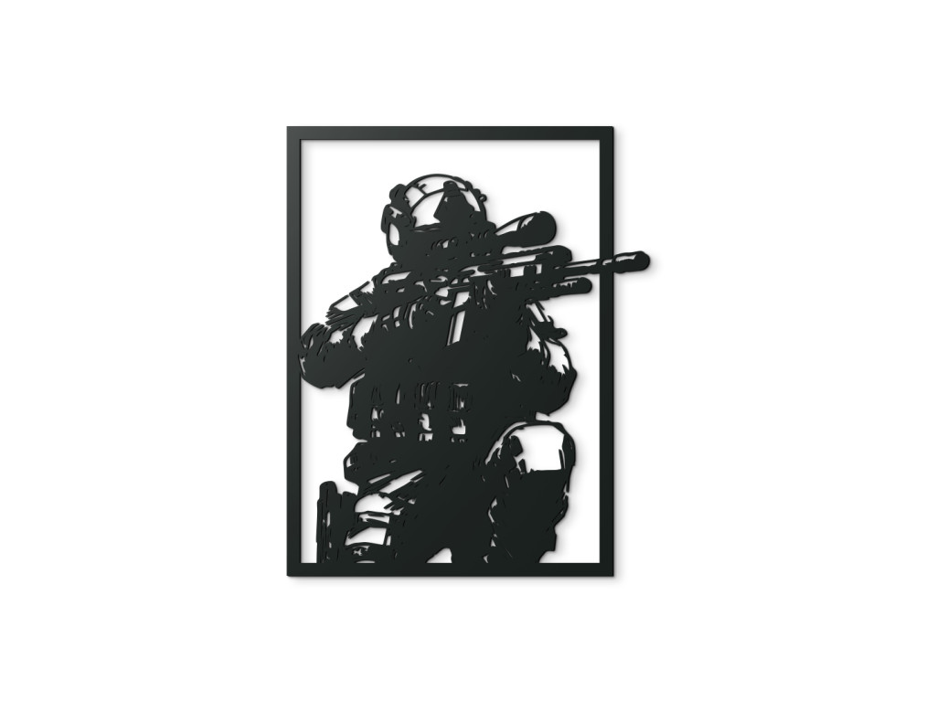 Obraz vojaka zachytáva moment plný napätia a pripravenosti. Detailné spracovanie dreveného materiálu zdôrazňuje každý aspekt postavy, od prilby až po držanie samopalu, čo dodáva dielu realistický a zároveň umelecký vzhľad. Tento dekoratívny prvok je ideálny pre tých, ktorí oceňujú jedinečné a dramatické umelecké diela, ktoré vyvolávajú silné emócie a podnecujú predstavivosť. Ostreľovač sa dokonale hodí do moderných aj industriálnych interiérov, kde bude pôsobiť ako centrálny bod, ktorý zaujme každého návštevníka.