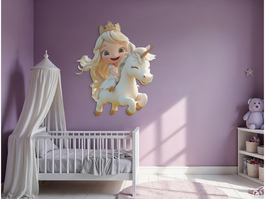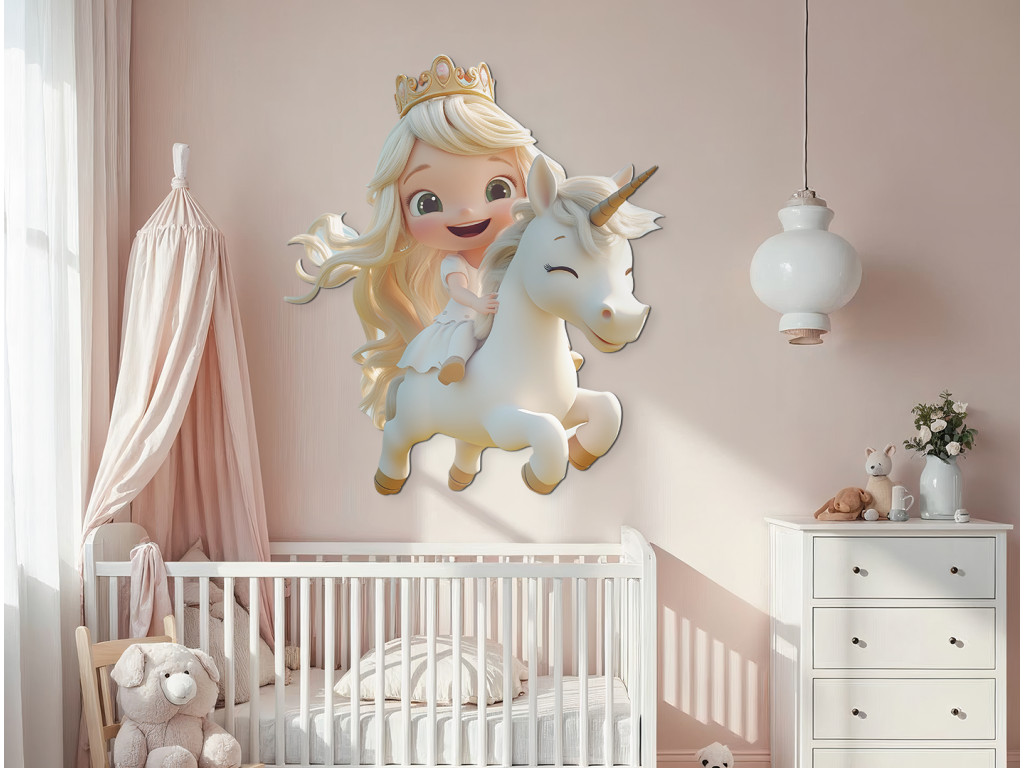 Blondel avec un sourire galope à travers le pays des rêves sur sa licorne blanche. Cette image incarne la joie, la magie de l'enfance et la beauté des contes de fées – un complément idéal pour une chambre de petite fille.
