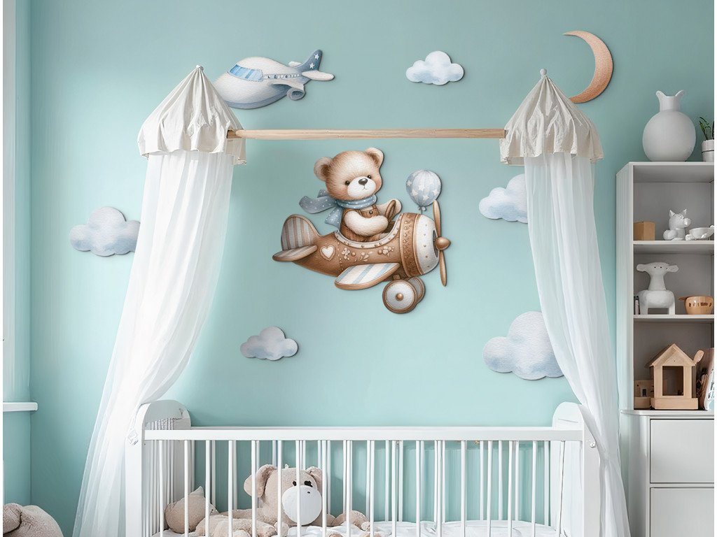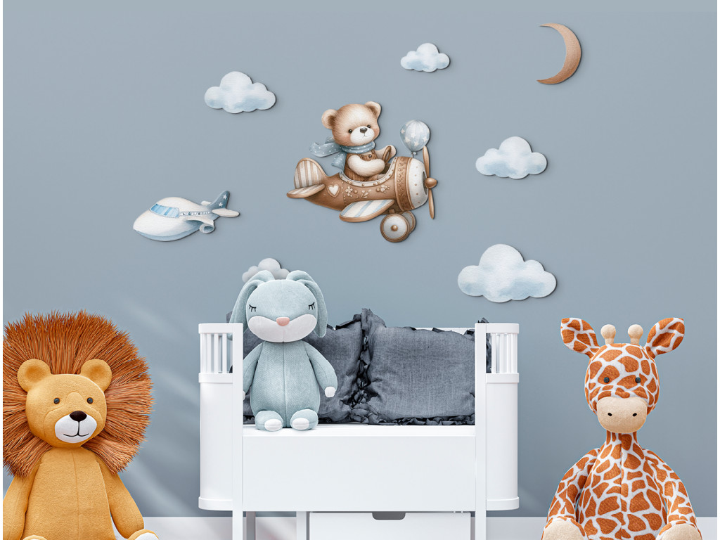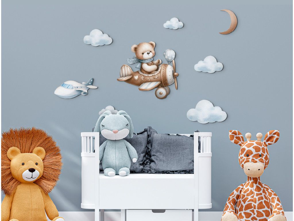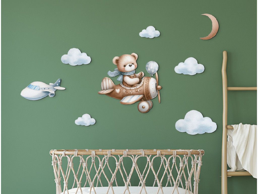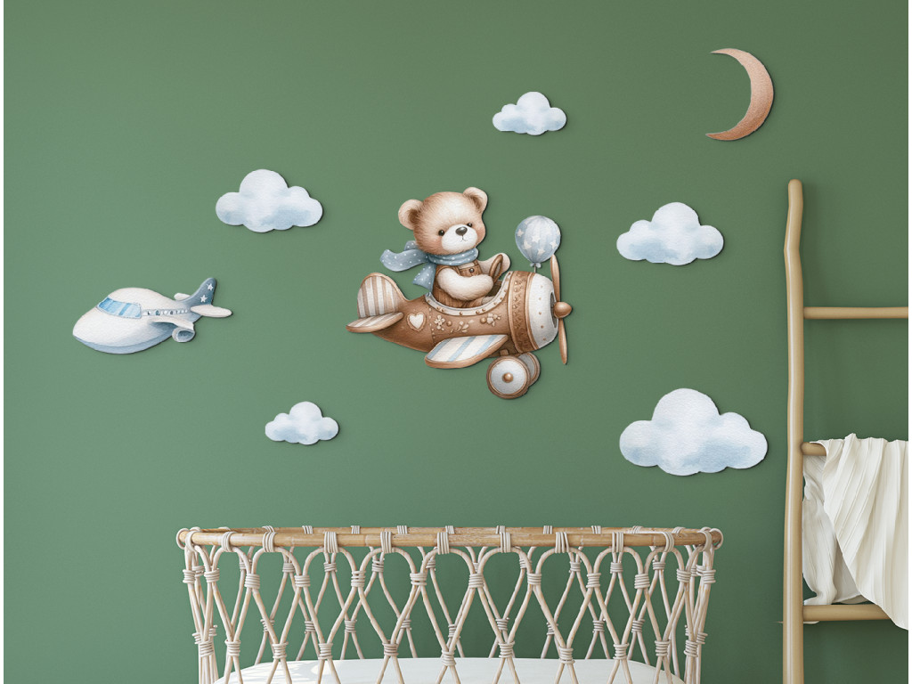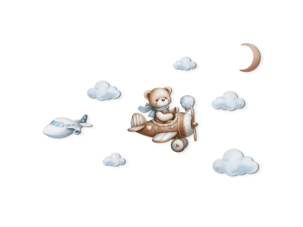 Ourson pilote vole parmi les nuages, avec la lune au-dessus de lui et un autre avion au loin. Une image adorable pour la chambre d'enfant des petits rêveurs et aventuriers.