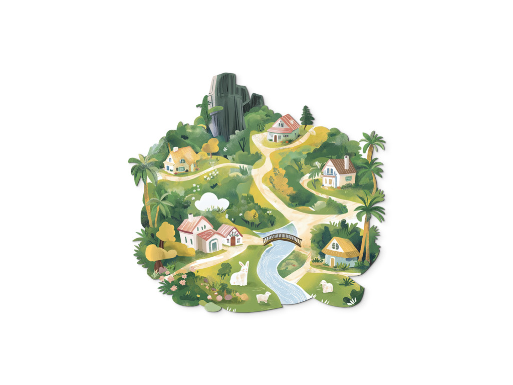 Dans ce paysage paisible, une rivière coule, des moutons paissent et un chemin mène, par des ponts, à des maisons situées sur une colline. Découvrez un paysage où la nature, les animaux et les aventures tranquilles vivent en harmonie.
