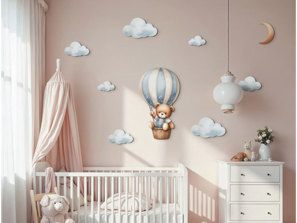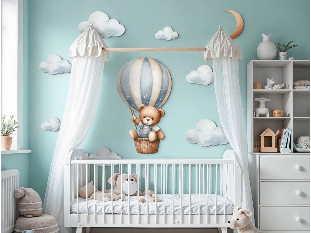 Un adorable ourson flotte dans une montgolfière au-dessus des nuages. Cette illustration délicate apporte calme, douceur et magie dans la chambre d'enfant. Un tableau ou un sticker idéal pour les petits rêveurs.