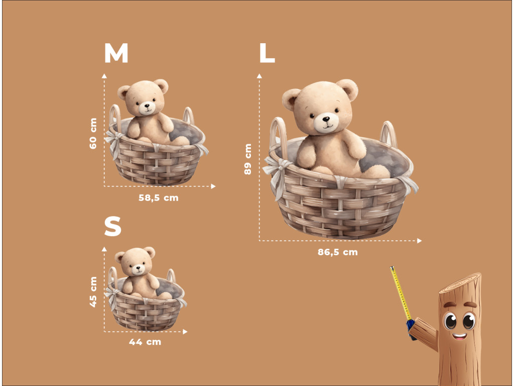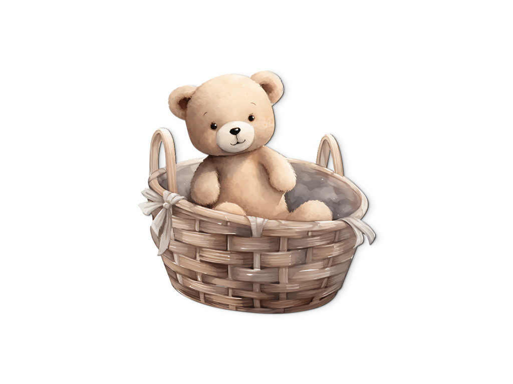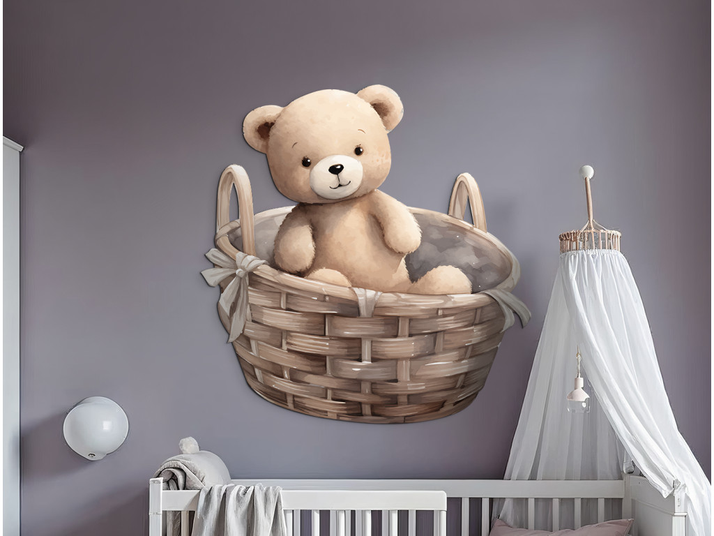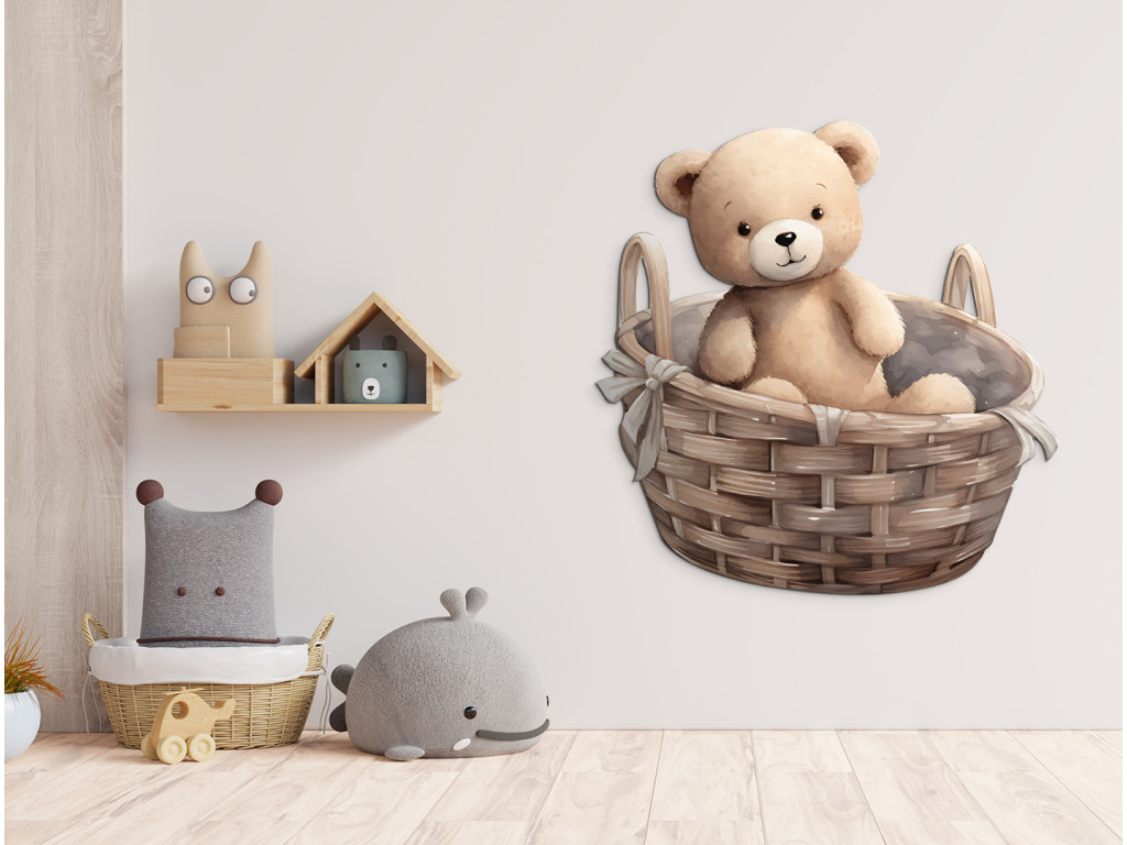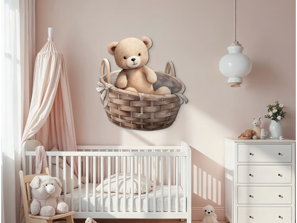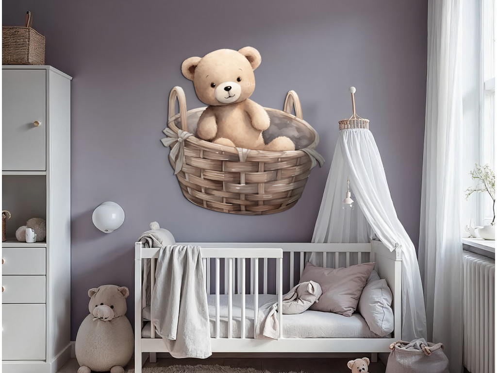 L'ours en peluche s'est installé dans un panier en osier – un joli détail qui illuminera tous les murs d'une chambre d'enfant. Cette illustration délicate apporte calme et chaleur à la pièce.