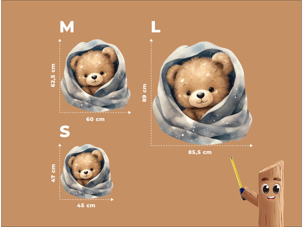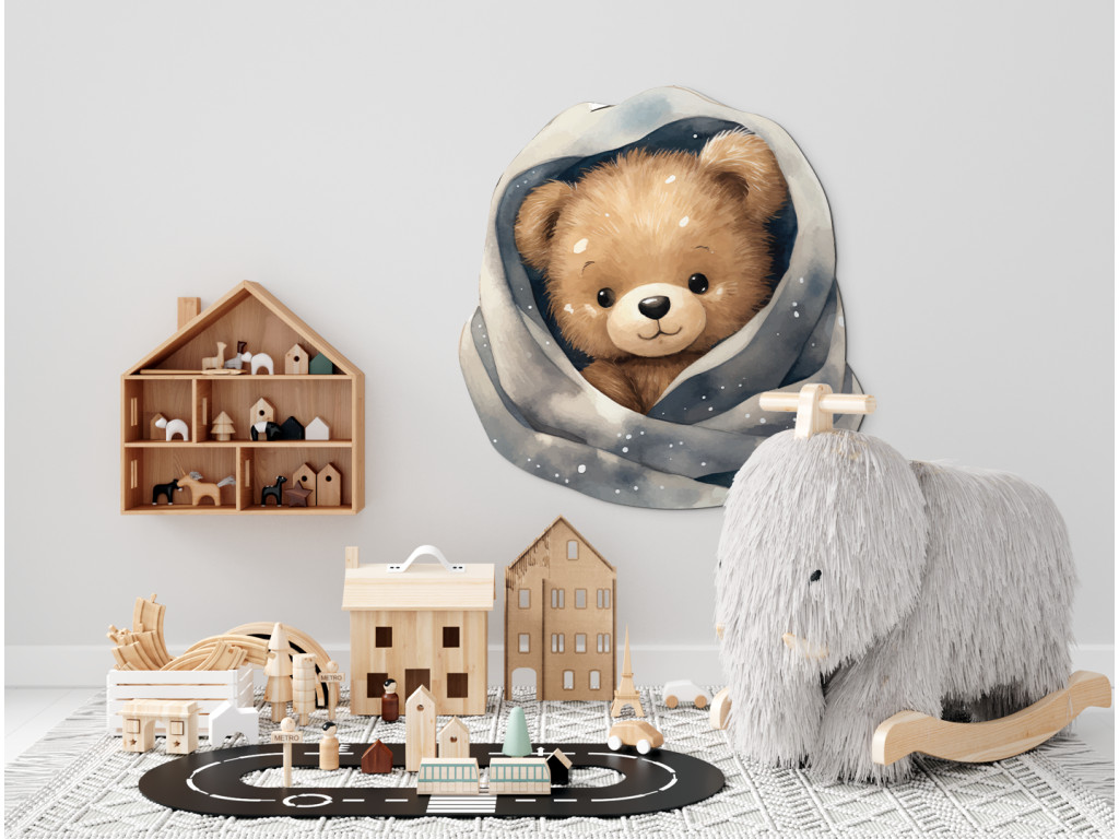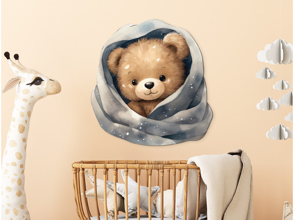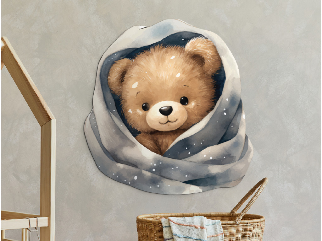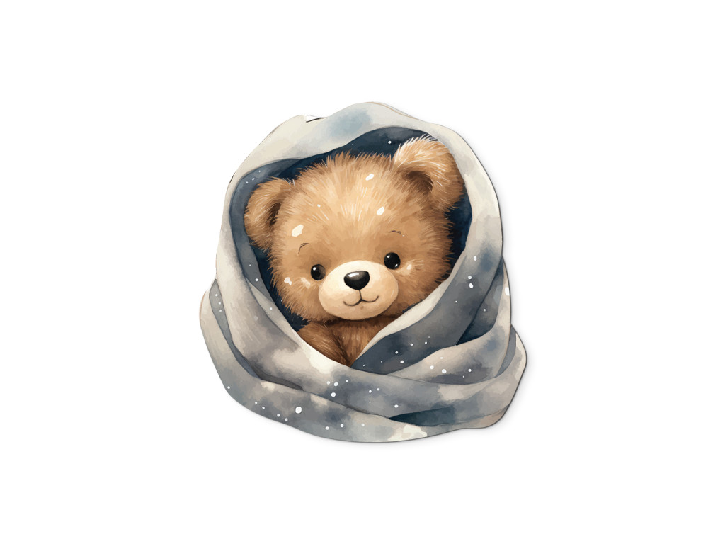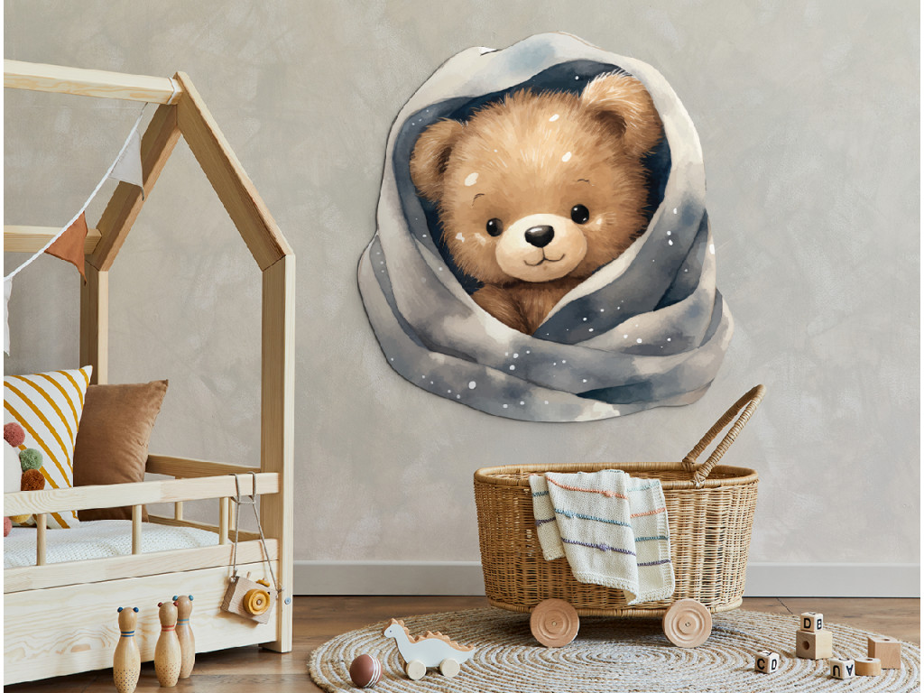 Un ours en peluche blotti dans une couverture toute douce parsemée d'étoiles et de flocons… comme dans un conte de fées ! Cette image apportera une atmosphère des plus douillettes à la chambre. Idéale pour le mur au-dessus du lit ou pour le petit dormeur.