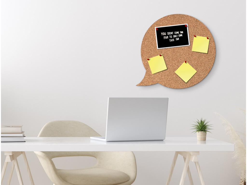 Nástenka v tvare textovej bubliny nie je len praktická, ale aj vizuálne príťažlivá. Korkový materiál jej dodáva prírodný a útulný vzhľad, ktorý sa hodí k rôznym štýlom interiéru. Môžete na ňu pripnúť dôležité správy, rozvrhy, fotografie alebo čokoľvek, čo vás inšpiruje a motivuje každý deň.