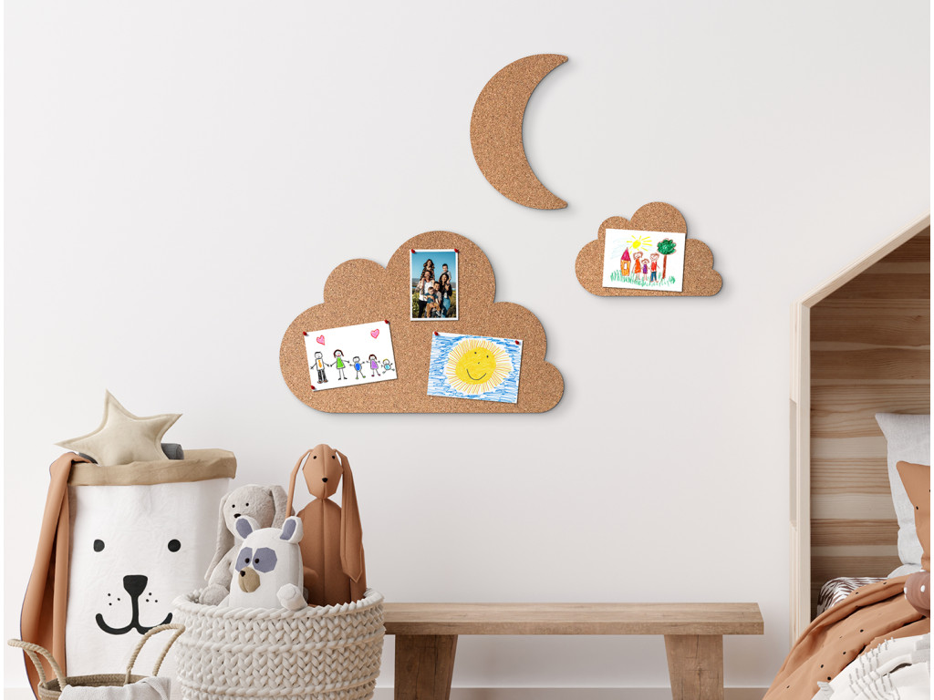 Rozkošná korková nástenka, ktorú je možné použiť na pripnutie všetkého, čo je vašim deťom blízke – od spomienok na krásne chvíle až po motivačné odkazy a rozvrhy. Táto dekorácia podporí organizáciu a zároveň poskytne vašim deťom osobný priestor na vyjadrenie svojej kreativity.