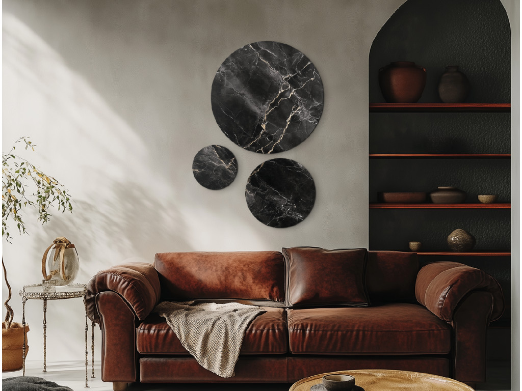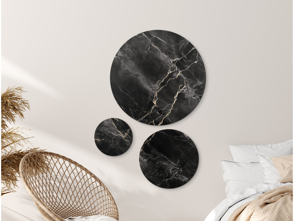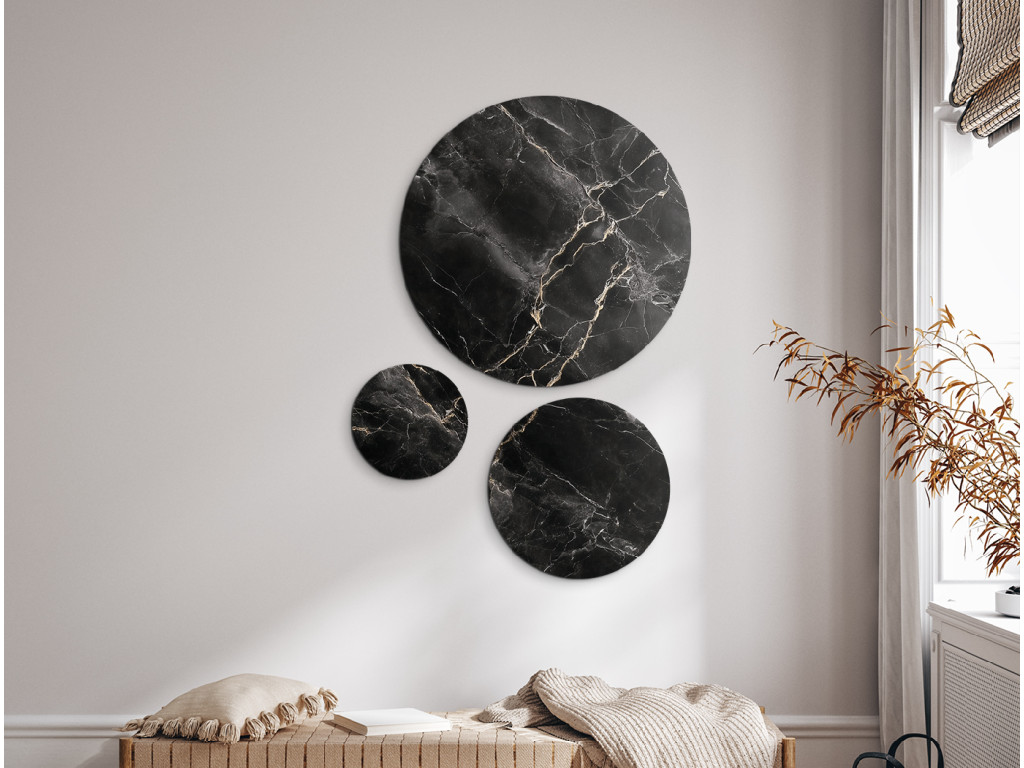 Le tableau rond en trois parties Marbre noir est un élément décoratif remarquable qui imite la structure du marbre naturel foncé. Grâce à l'impression UV sur un matériau PVC de haute qualité, elle offre un effet 3D réaliste et un design moderne. Elle est idéale pour les intérieurs où vous souhaitez créer du contraste, de l'élégance et une impression de solidité. Durable, sans entretien et visuellement impressionnante, c'est un art qui dure.