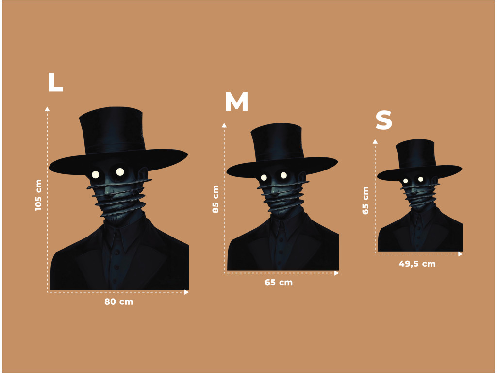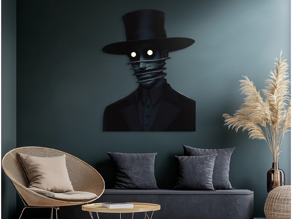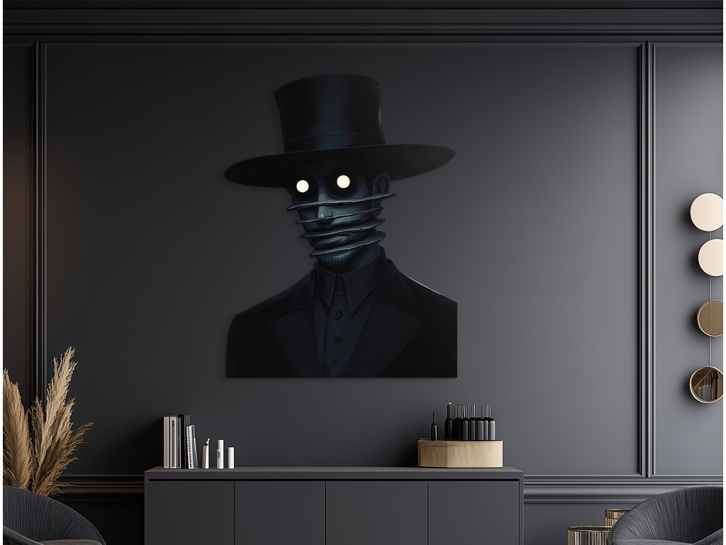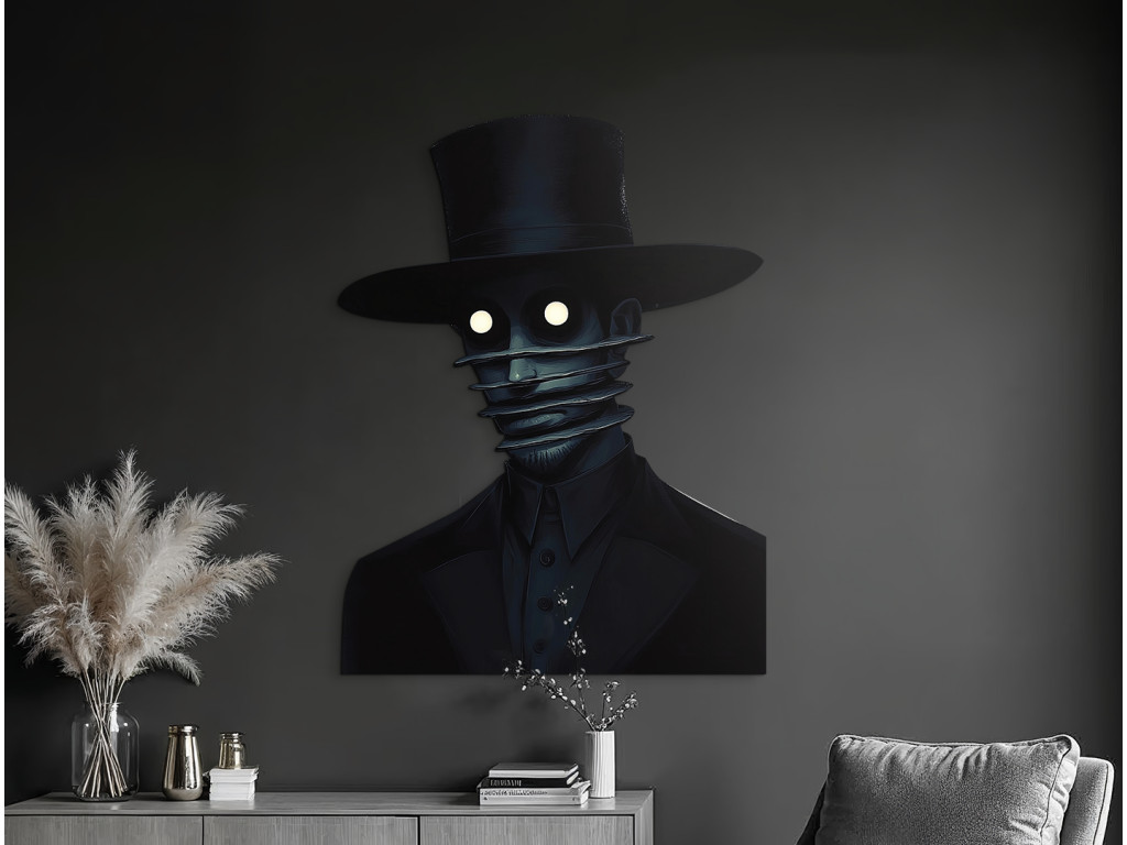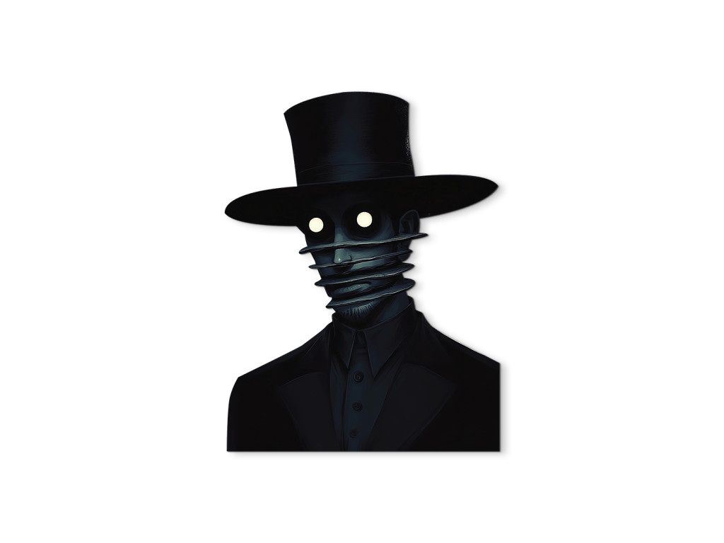 Le personnage, inquiétant et fascinant à la fois, coiffé d'un haut-de-forme noir, attire le regard dès le premier coup d'œil. Son cou segmenté comme un ressort et ses yeux brillants dans l'ombre sombre de son visage créent une atmosphère particulière de mystère et de tension. L'œuvre oscille entre surréalisme et fantaisie gothique, soulevant des questions qui restent sans réponse.