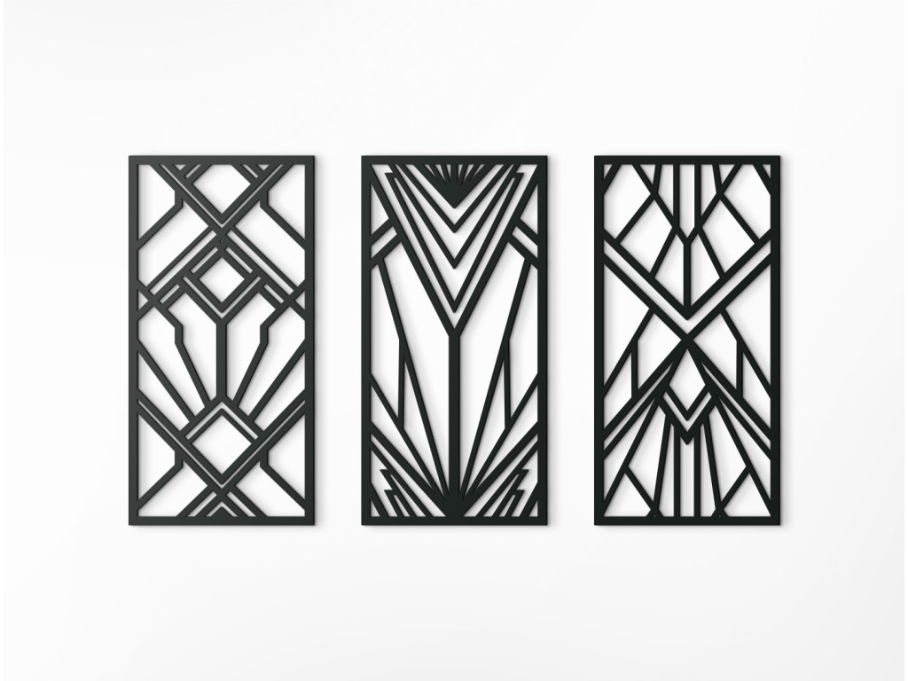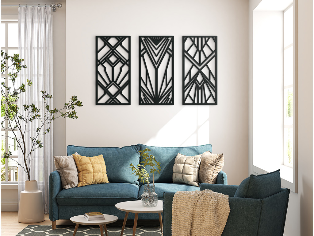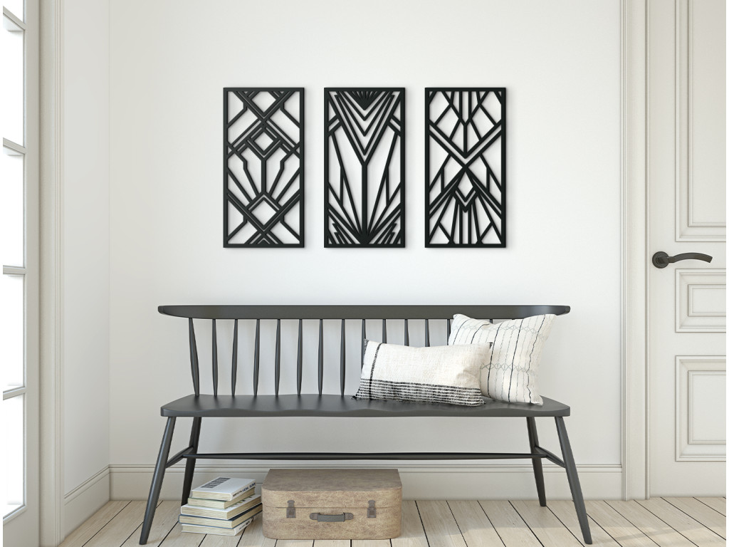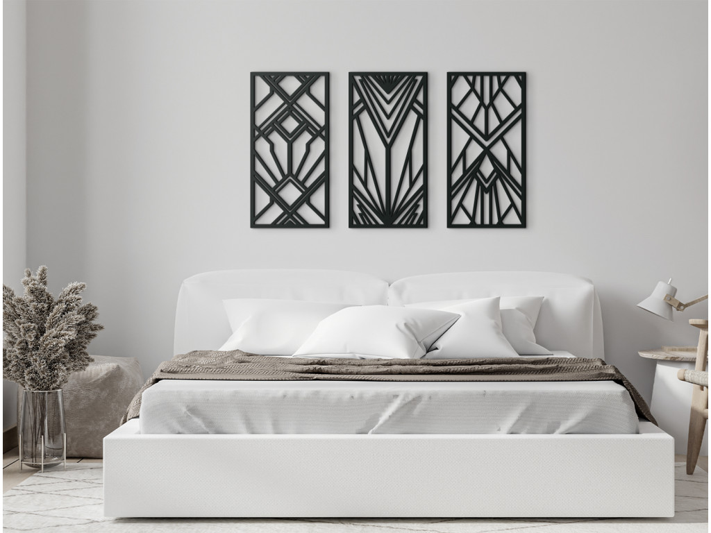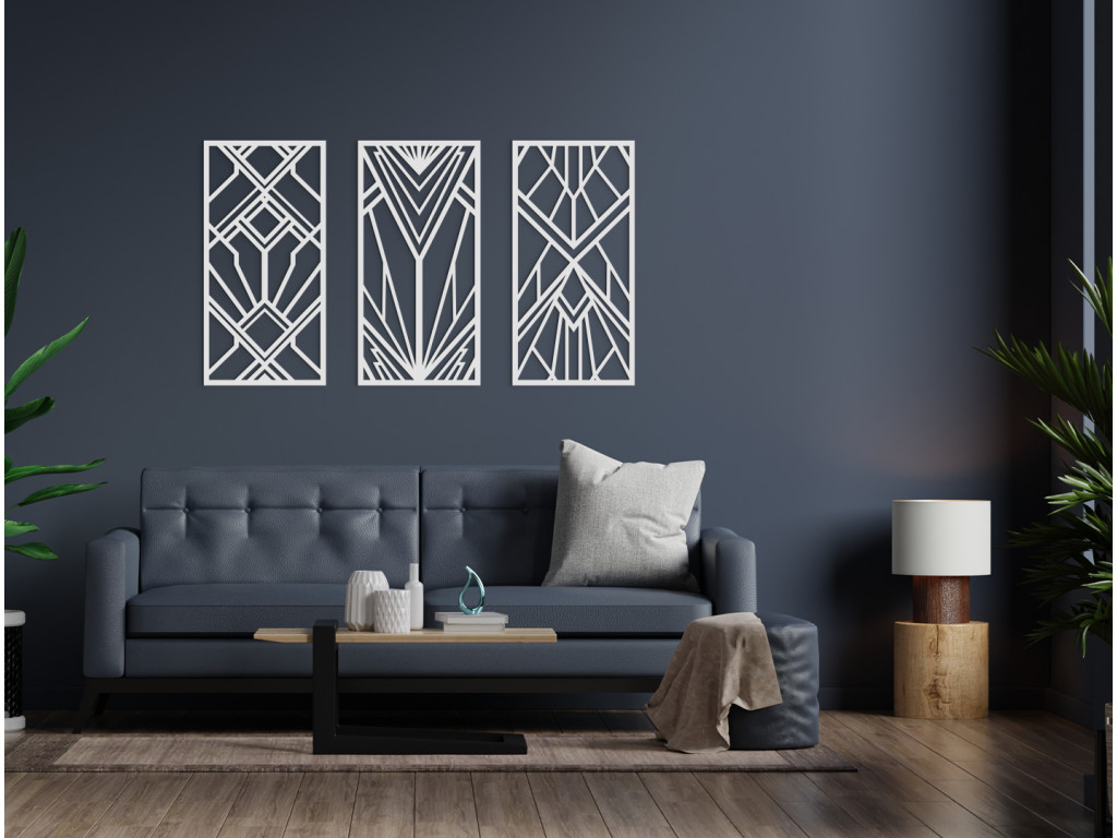 3-dielny drevený panel poteší všetkých priaznivcov pravidelných geometrických tvarov. Navzájom pospájané kosoštvorce, štvorce a trojuholníky vytvárajú krásny obraz na stenu. Trendový dizajn predurčuje dekoráciu do moderných priestorov.