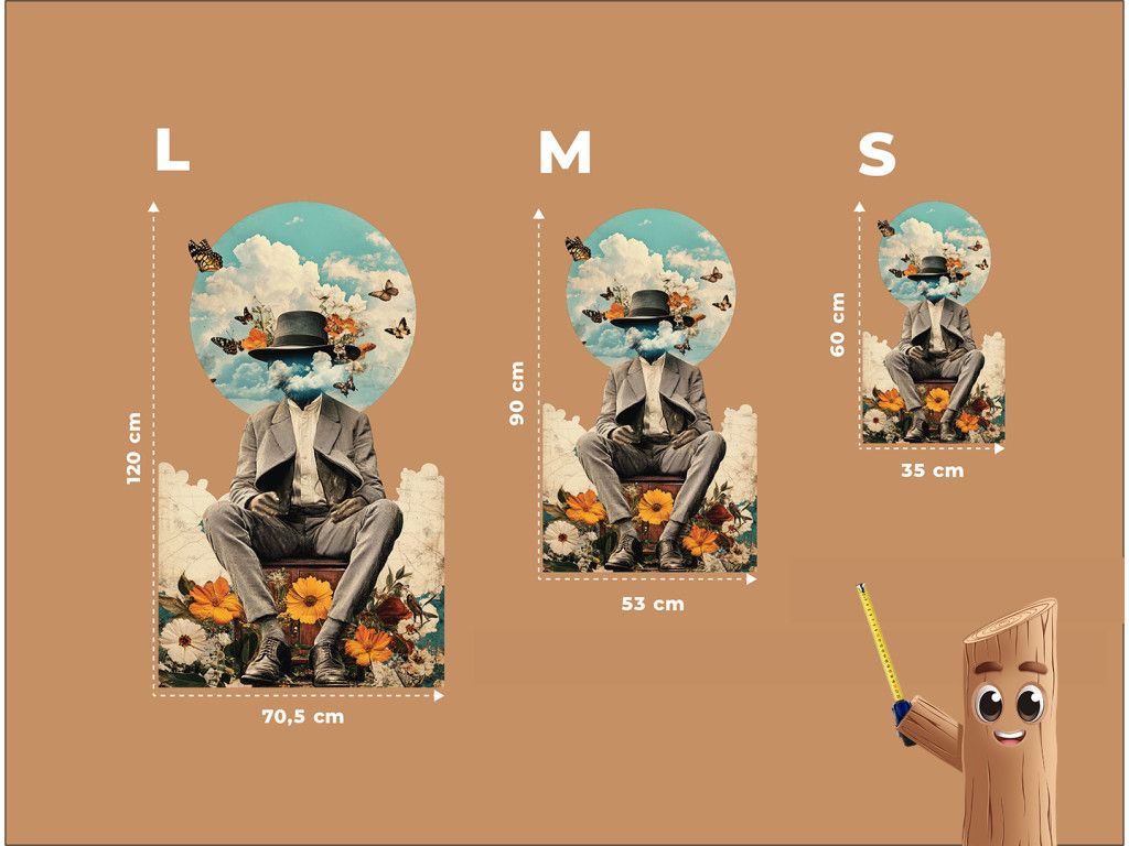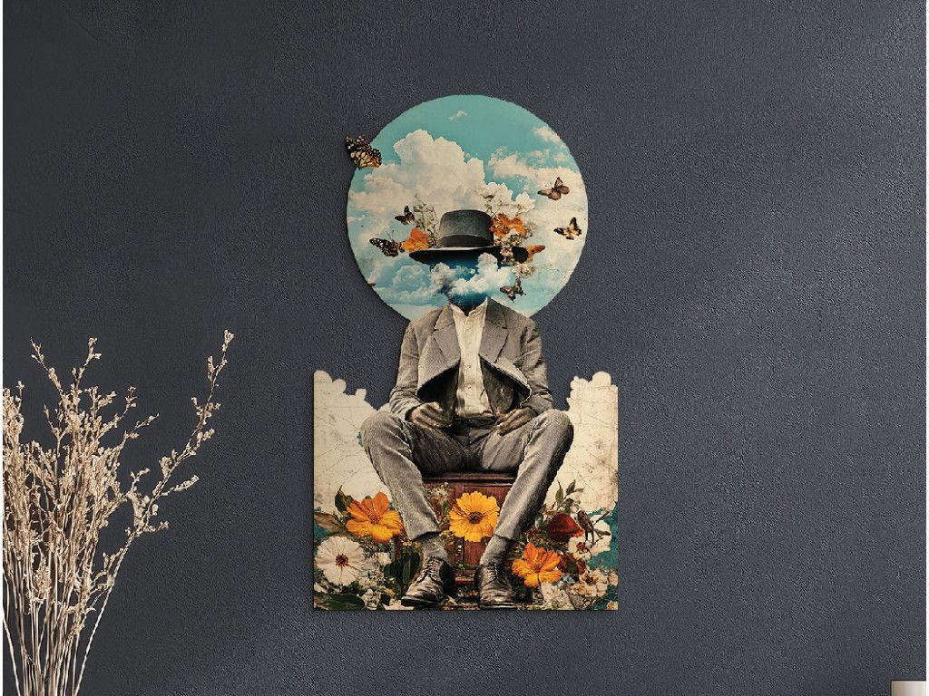 Cette œuvre onirique représente un personnage en costume élégant et chapeau, dont la tête se fond dans les nuages, comme une métaphore de la réflexion, de la liberté et du désir d'évasion. Sur fond de ciel bleu, des papillons virevoltent et, associés au socle floral aux tons chauds orange et blanc, symbolisent le printemps, le renouveau et la connexion paisible entre l'homme et la nature.
