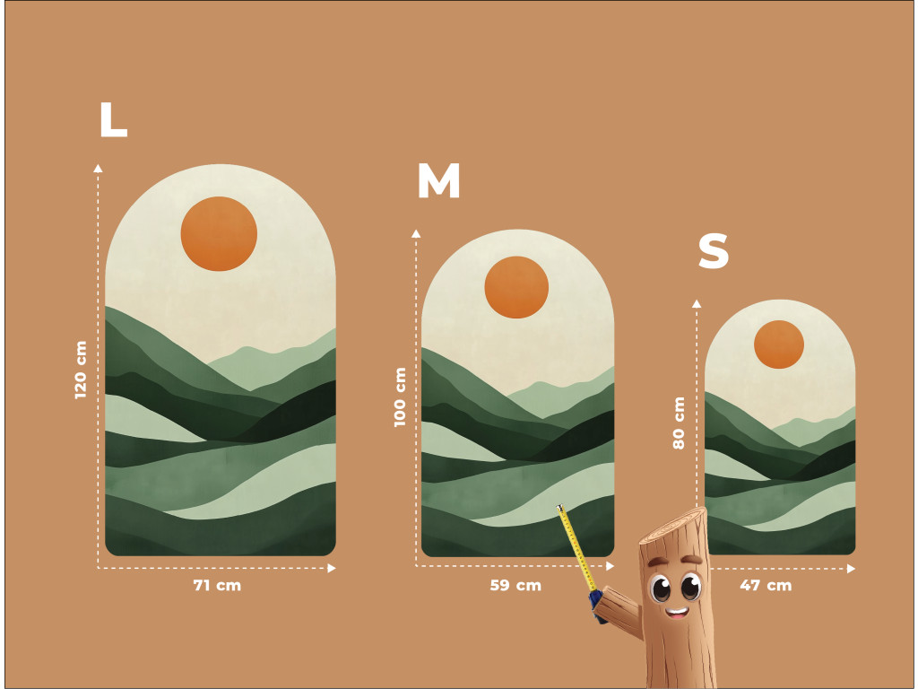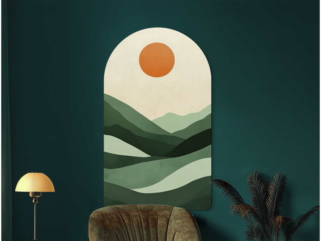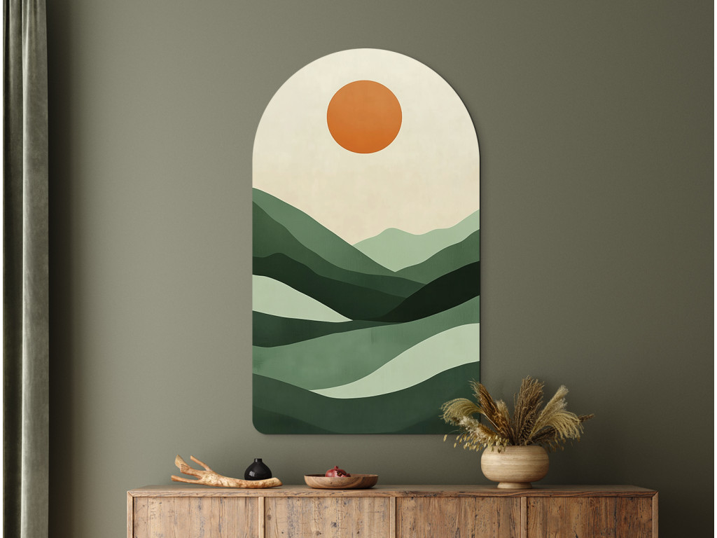 Ce tableau abstrait de style moderne représente un paysage paisible dans un style minimaliste. Les collines verdoyantes et le soleil orange créent une composition harmonieuse en forme d'arc, idéale comme décoration murale dans un intérieur moderne.