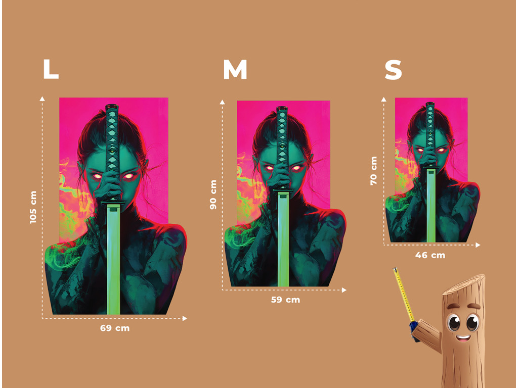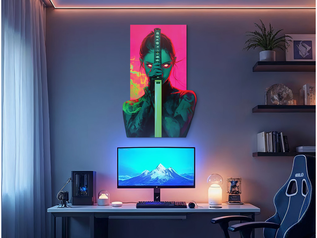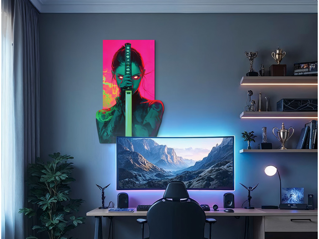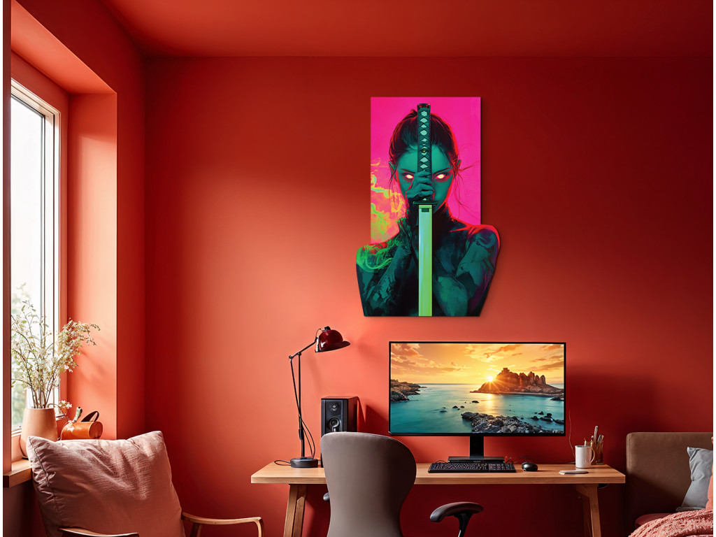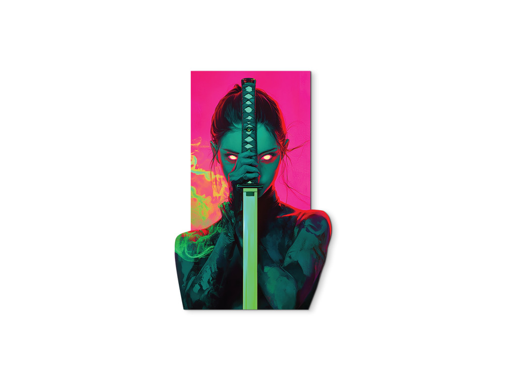 Le tableau capture une forte figure féminine – une guerrière avec un katana brandi devant son visage, dont les yeux rouges brillants transpercent l'obscurité. Le fond futuriste dans des tons rose-vert contraste avec la silhouette sombre, créant ainsi un effet visuel dramatique et tendu avec une touche d'atmosphère cyberpunk.