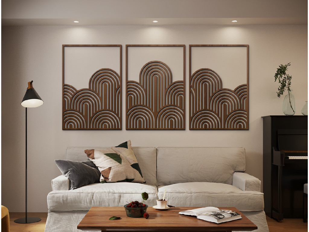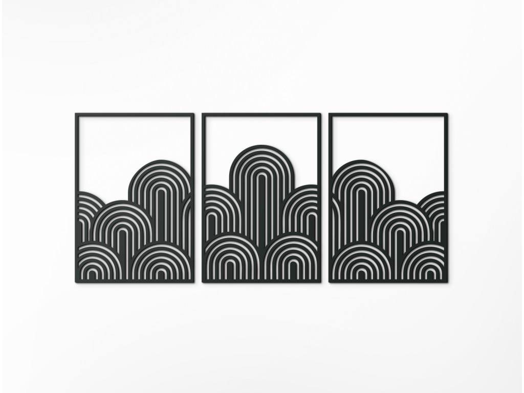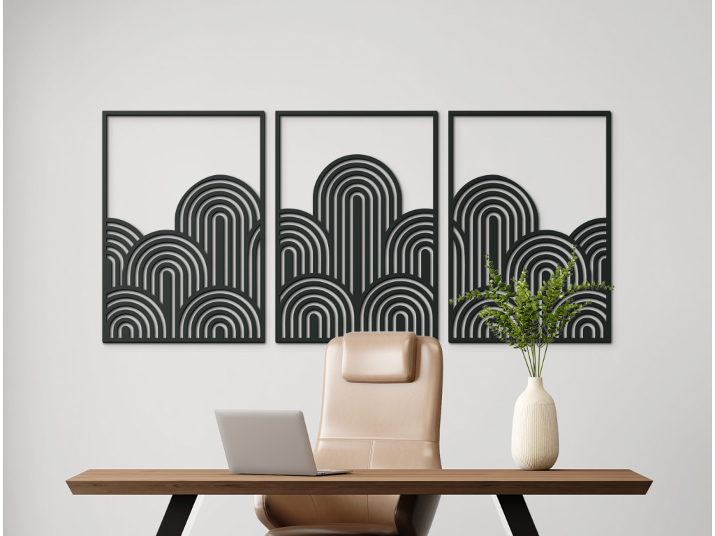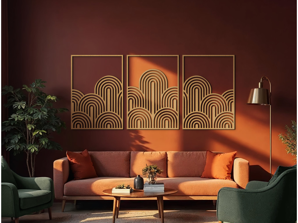 Trojdielny obraz Art Deco vlny prináša do interiéru štýl, symetriu a noblesu zlatého veku dizajnu. Kombinuje čisté línie, oblúky a rytmus geometrie, ktoré pôsobia elegantne a upokojujúco. Ideálny doplnok pre tých, ktorí milujú moderný dizajn s nádychom klasiky.
