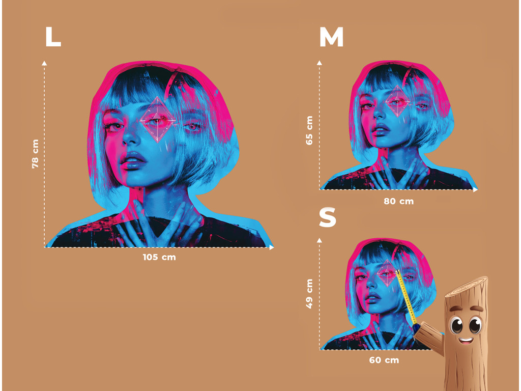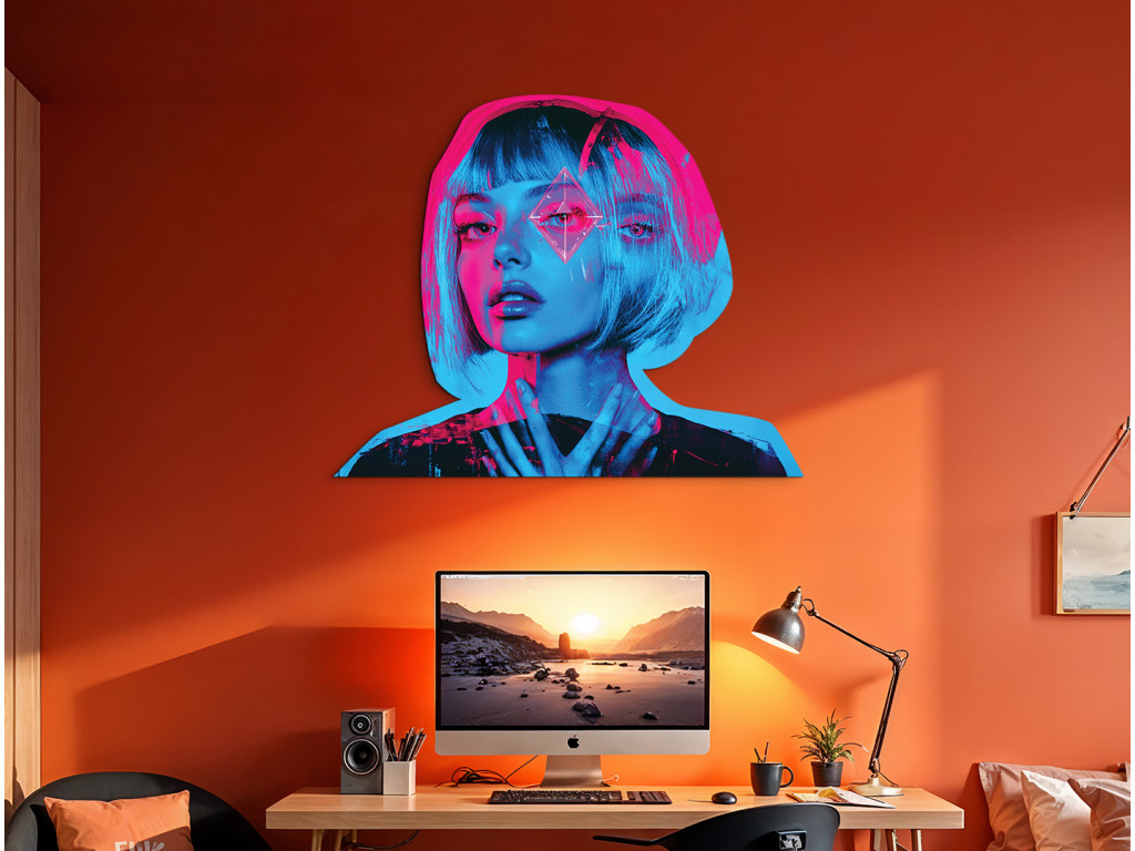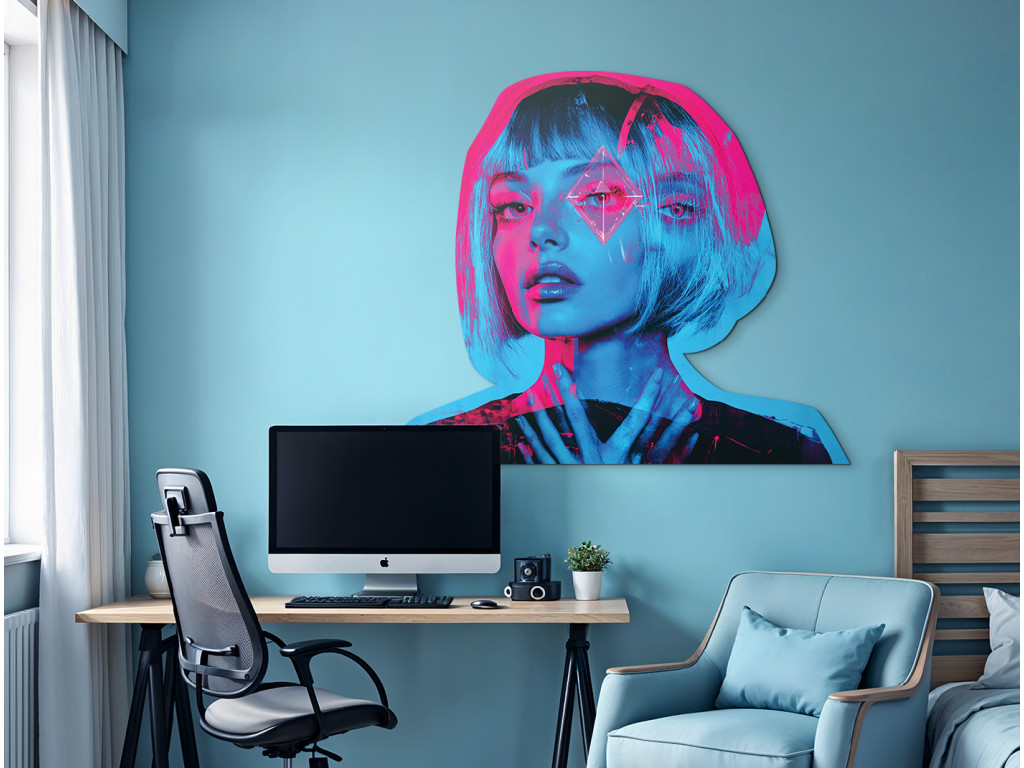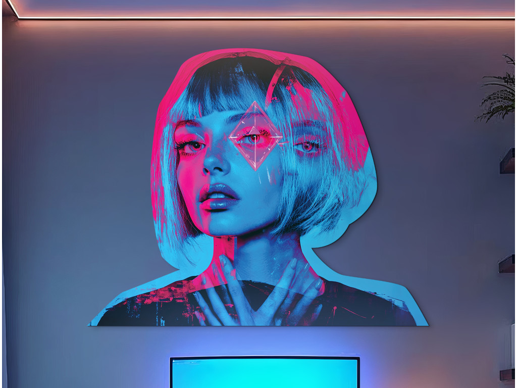 Ce portrait d'une femme aux cheveux courts allie la beauté et la froideur précise d'un monde futuriste. La lumière néon dans des tons rose et bleu projette des ombres dramatiques sur son visage, tandis que le symbole sur son front, rappelant un diamant avec des viseurs, suggère une identité numérique, une réalité augmentée ou un contrôle cybernétique. L'œuvre évoque l'esthétique cyber et les questions d'individualité dans le monde technologique.