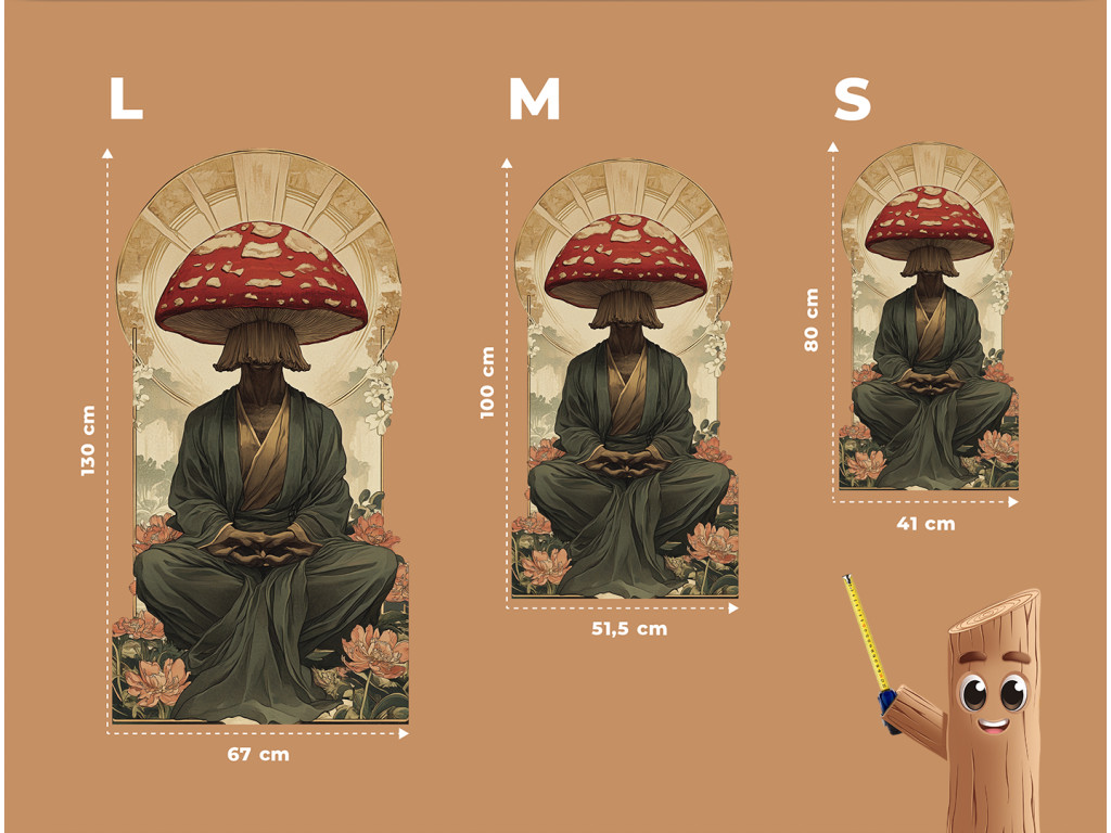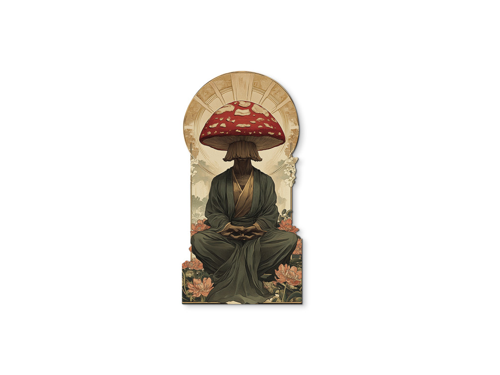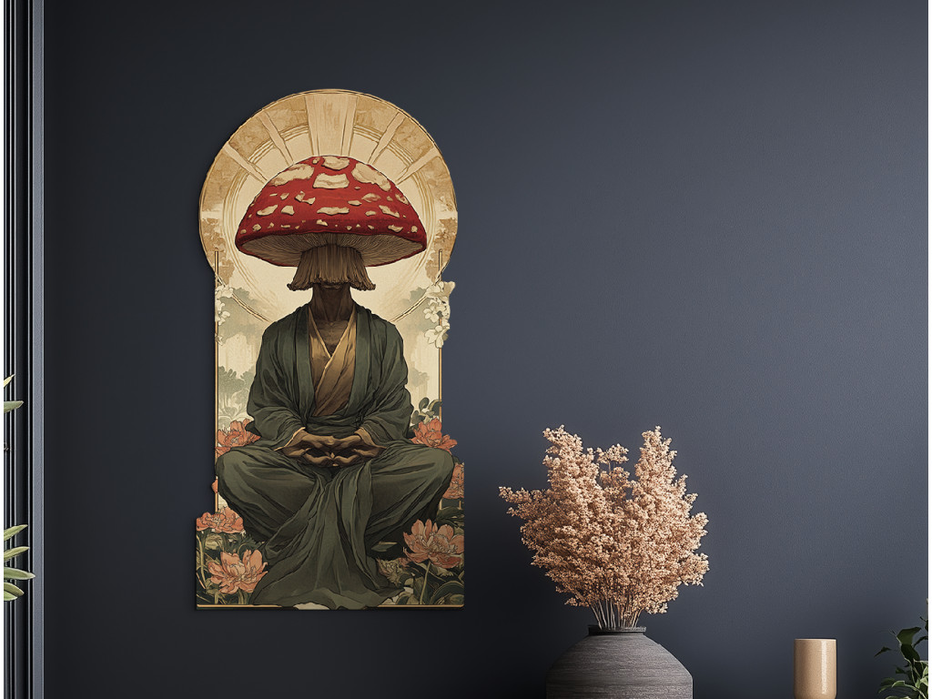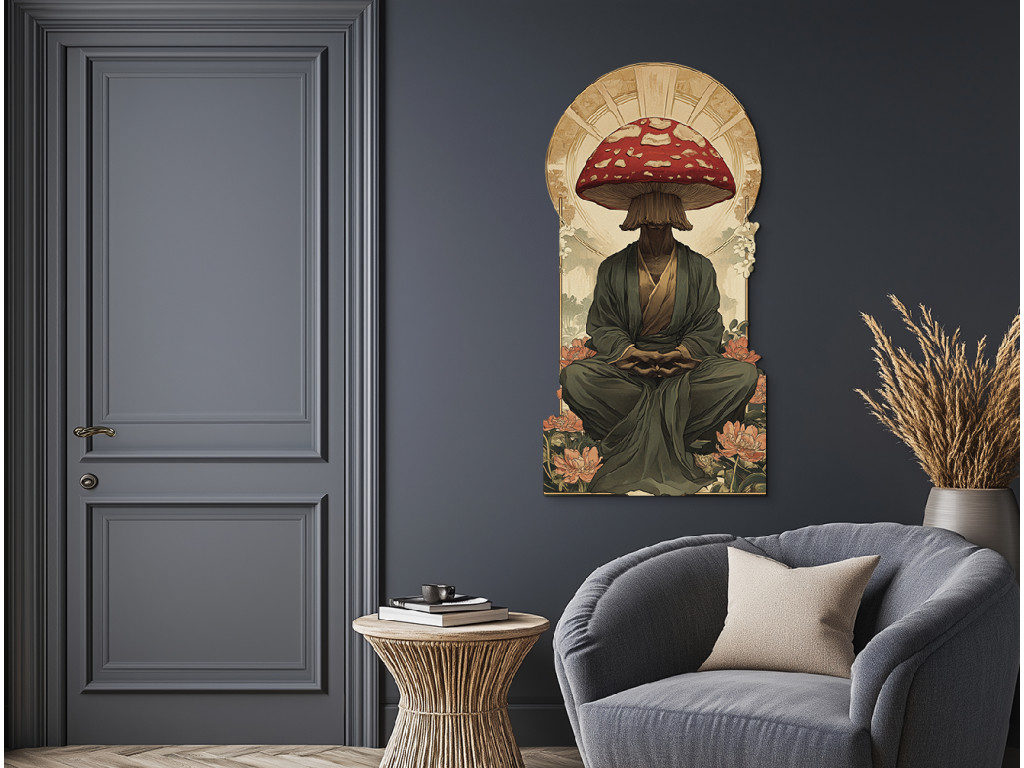 Le tableau représente un personnage assis en position de méditation, dont la tête est remplacée par un grand amanite tue-mouche rouge. La robe sombre de moine et le socle orné de fleurs créent un contraste entre la paix spirituelle et l'élément surréaliste.