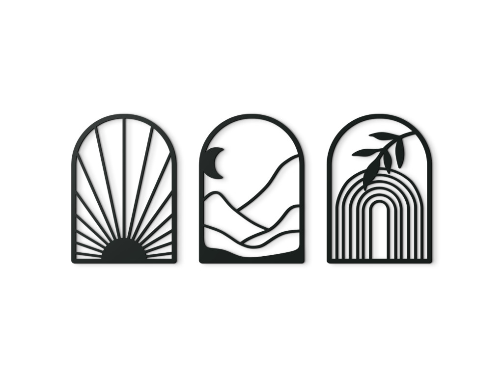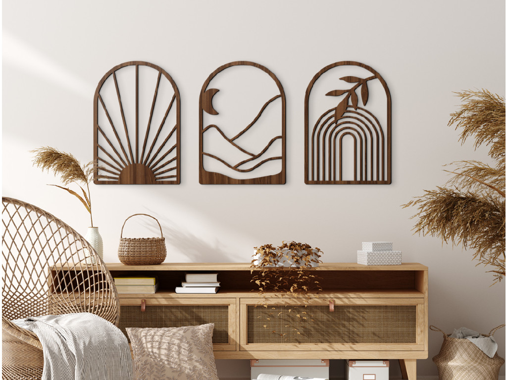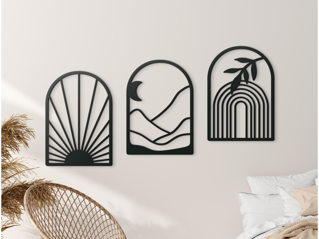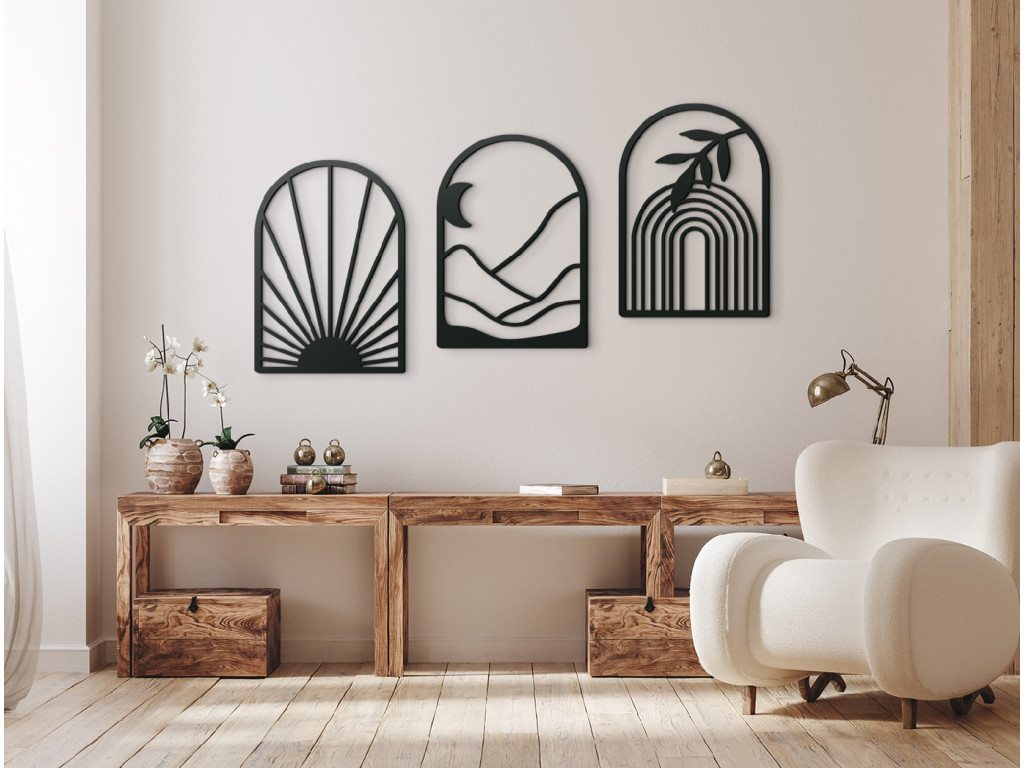 Le tableau mural en trois parties Lever du jour représente la transition entre la nuit et le jour en un seul instant. Les trois parties arquées associent les motifs du soleil, de la lune et de l’arc-en-ciel, créant ensemble une histoire harmonieuse de nature et de lumière. Les détails finement sculptés soulignent les lignes délicates et confèrent au tableau une impression de mouvement et de vie. Vous pouvez choisir parmi plusieurs variantes de couleurs pour l’assortir parfaitement à l’atmosphère de votre intérieur.