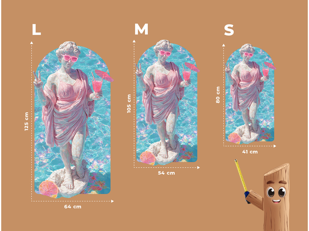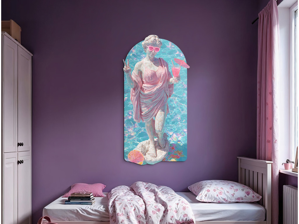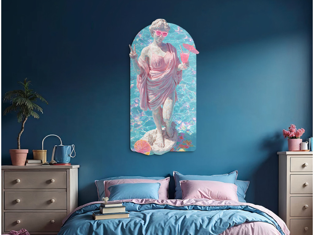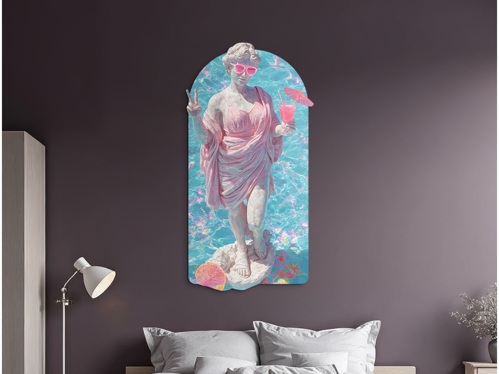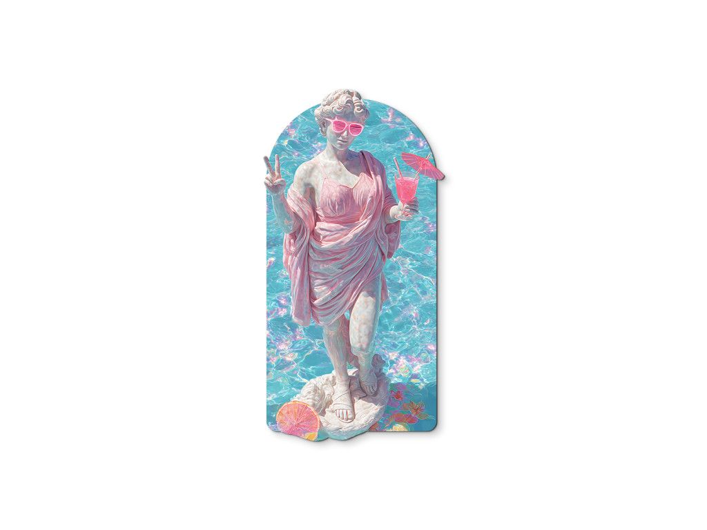 La statue de style gréco-romain est représentée dans un style estival inattendu : vêtue d'une robe rose, elle porte des lunettes de soleil et tient un verre à la main. L'ambiance estivale et les couleurs rétro créent un contraste entre le classique et la culture pop, donnant naissance à une image humoristique et stylée avec une touche de vacances des années 80.