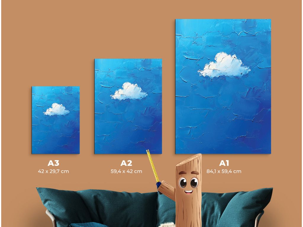 Le tableau représente un seul nuage blanc au milieu d'un fond bleu. Il est travaillé en mettant l'accent sur le volume et la texture délicate, ce qui, en contraste avec la surface bleue pure, crée une impression apaisante et minimaliste.