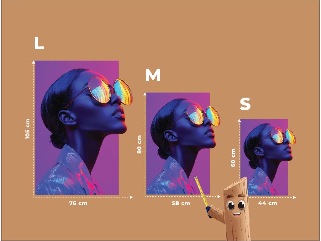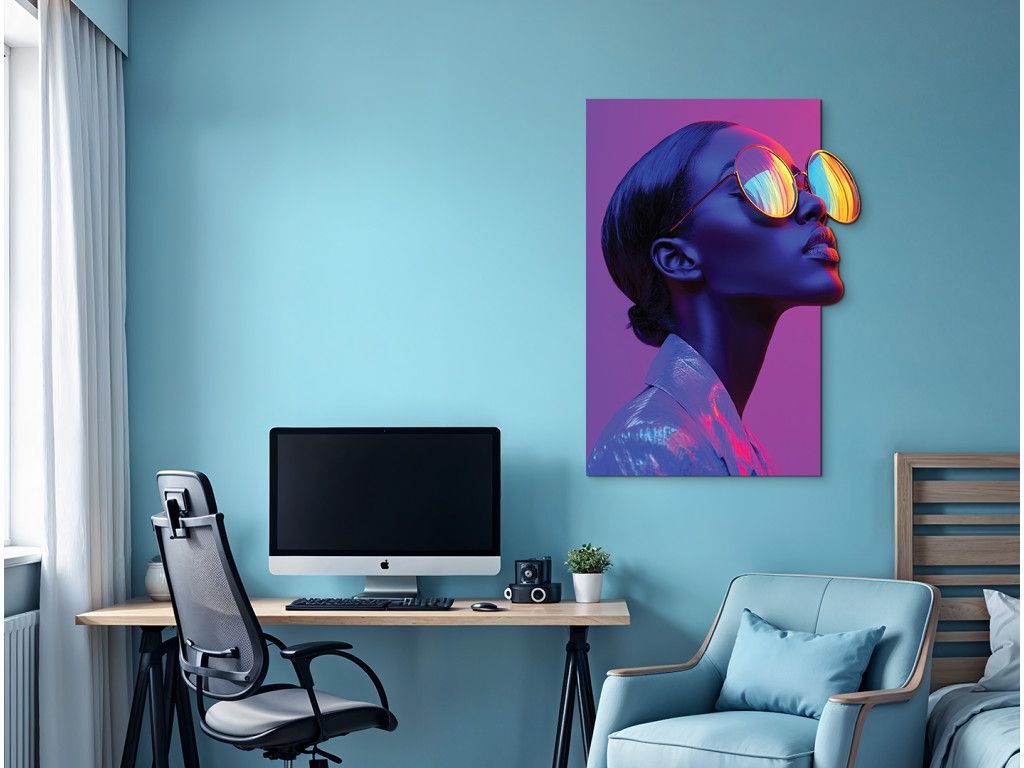 Portrait stylisé d'une femme de profil, la tête relevée, avec des lunettes expressives qui reflètent les couleurs de l'arc-en-ciel. Les tons violet-rose dominent et, associés à la brillance des lunettes, créent une impression futuriste et onirique.