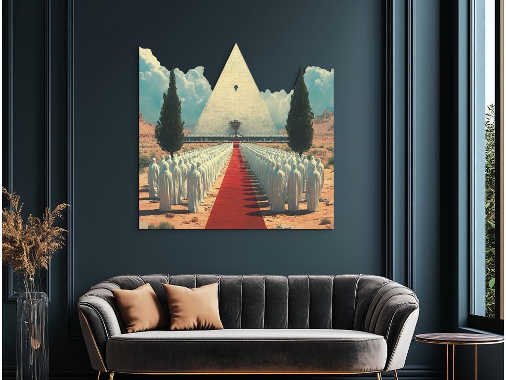 La scène mystérieuse dans le désert montre des personnages en robes blanches marchant sur un tapis rouge vers une pyramide avec un œil qui voit tout. Le symbolisme et la composition évoquent les rituels anciens, l'ésotérisme et l'initiation spirituelle.