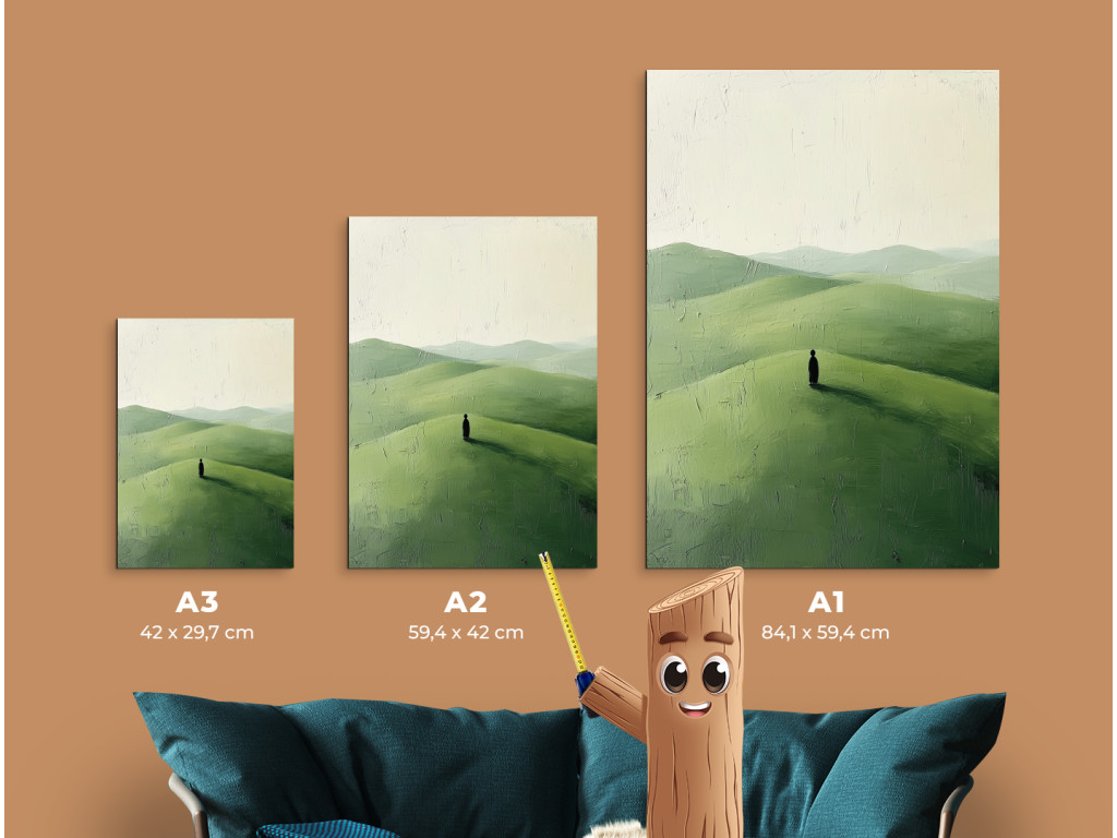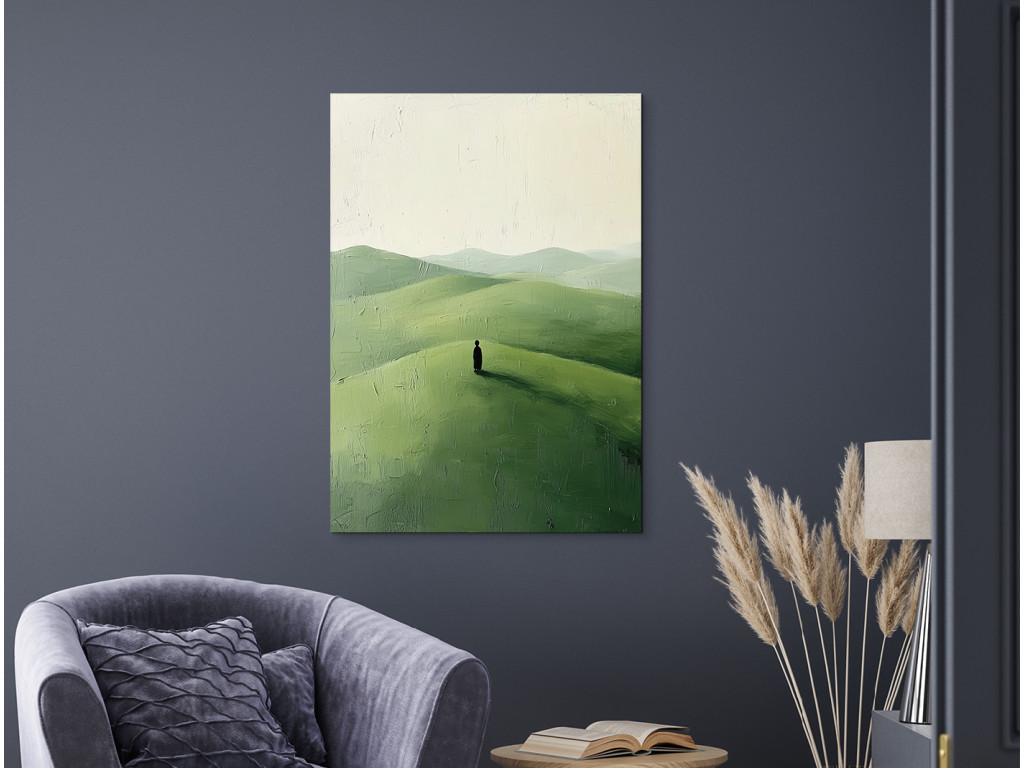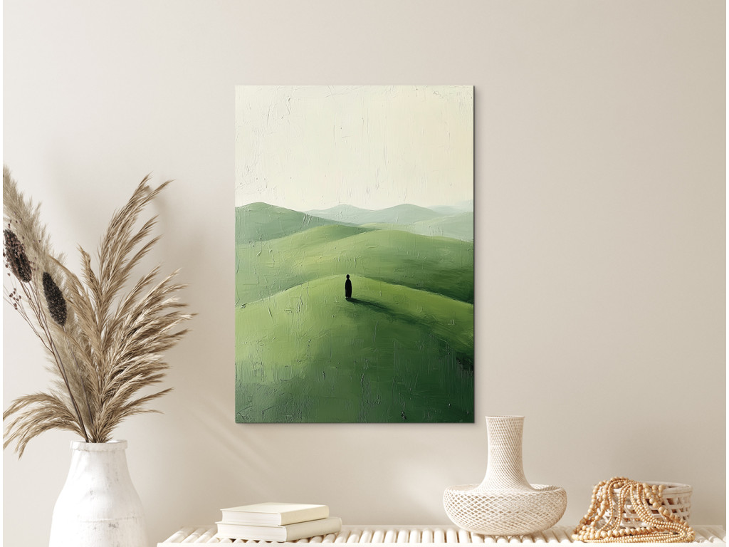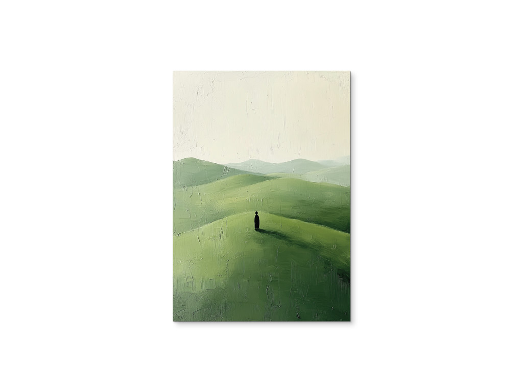 La composition minimaliste représente une silhouette solitaire debout sur une colline verdoyante, avec un paysage légèrement vallonné en arrière-plan. Le ciel clair et l'espace vide soulignent le calme, le silence et le moment d'arrêt.