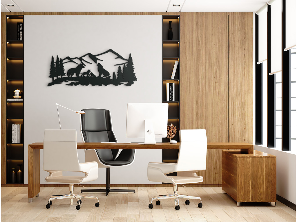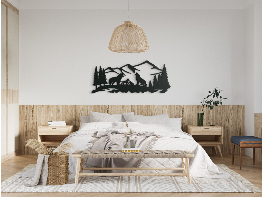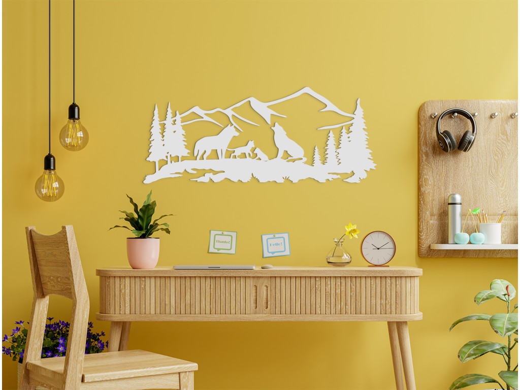 Vneste do vášho interiéru pohodovú atmosféru. Drevená dekorácia s idylickým motívom vlčej rodinky sa o to postará. 3D nálepka na stenu Vlčia rodinka ponúka pohľad na vlka a vlčicu uprostred lesnej čistinky, ako pozorujú svoje dve hrajúce sa vĺčatká. Za nimi do výšky čnejú vysoké štíty hôr.
