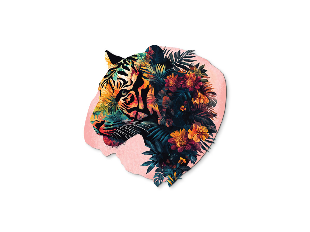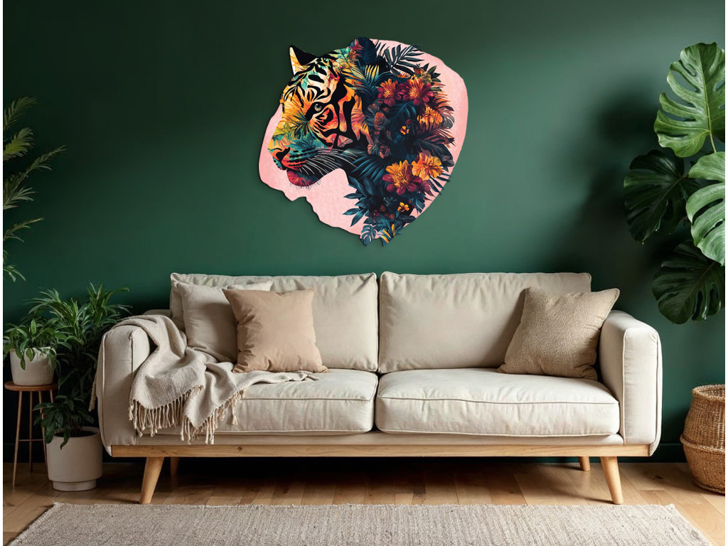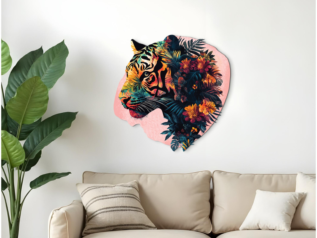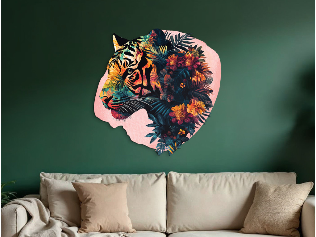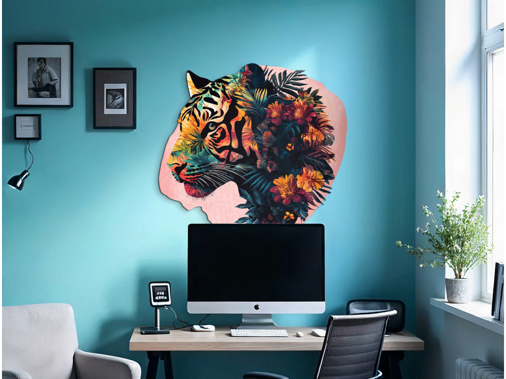Ce tableau associe la force et la sauvagerie du tigre à la douceur de motifs végétaux et floraux. Il symbolise l'équilibre entre la férocité et la beauté de la nature. Un élément visuel marquant pour un intérieur qui souhaite exprimer à la fois énergie et sérénité.