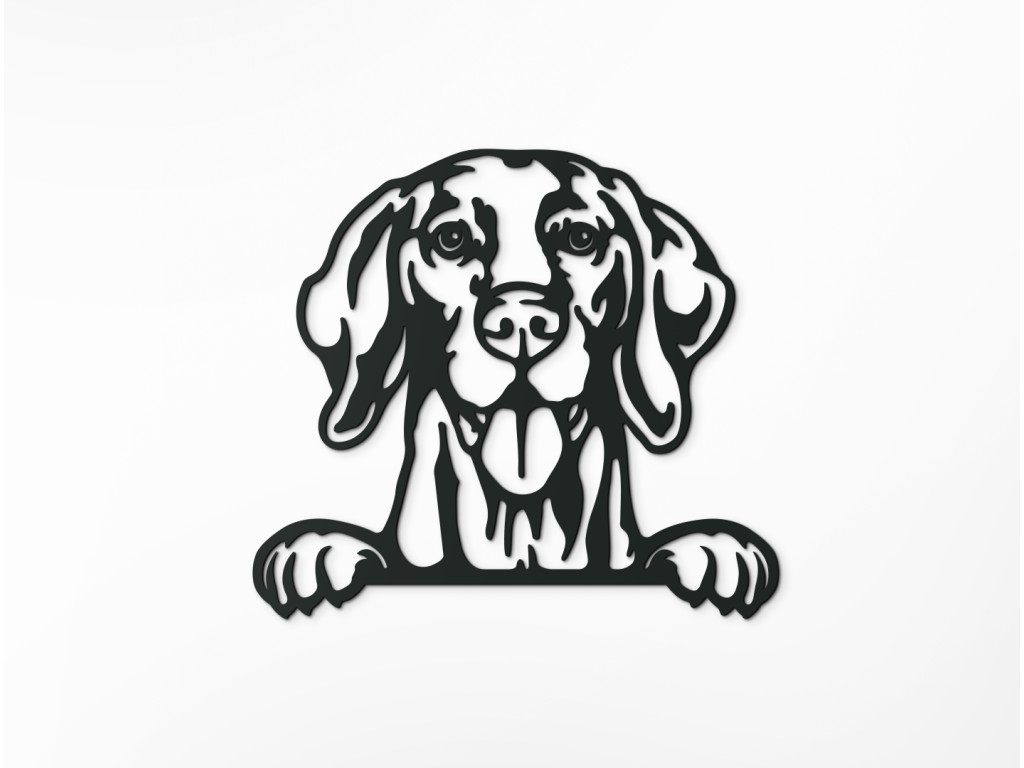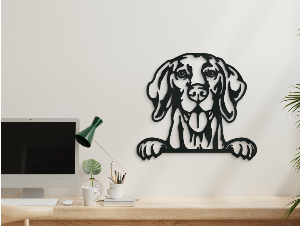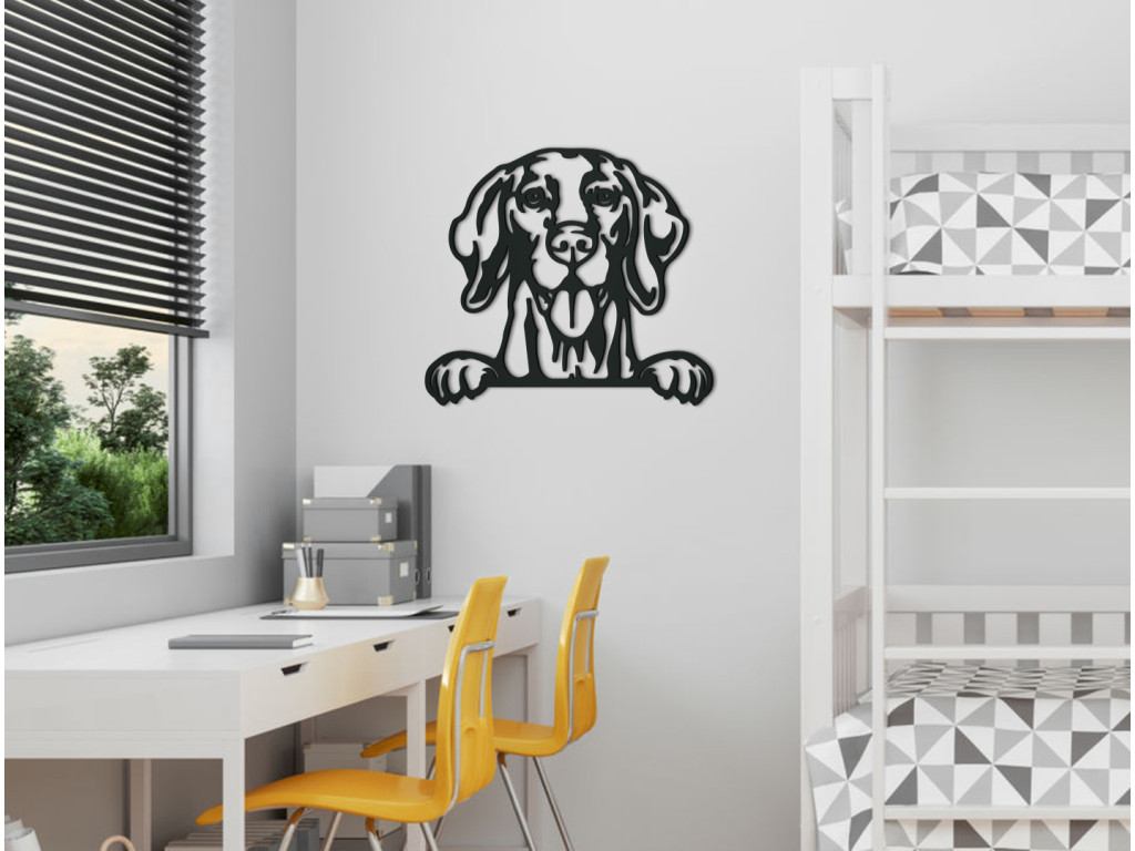 Distingvovaný pes stredne veľkého vzrastu so štíhlou línou zaujme na prvý pohľad nielen v realite, ale aj na obraze. Portrét zobrazuje Weimara, s pôvodným názvom Weimaraner, s vyplazeným jazykom a zdvihnutými prednými labami. 3D nálepku na stenu si môžete zvoliť vo viacerých odtieňoch dekoru podľa farby srsti vášho domáceho maznáčika alebo štýlu interiéru. Kategoricky ho zaraďujeme medzi poľovné psy, ktoré boli a sú využívané pri tichom love zvery vďaka výbornému čuchu, ostražitosti a sledovacím schopnostiam. Vďaka typickým črtám stavača sa drevenej nálepky potešia aj majitelia plemena maďarský stavač, vyžla a ďalších z príbuznej genetickej skupiny.
