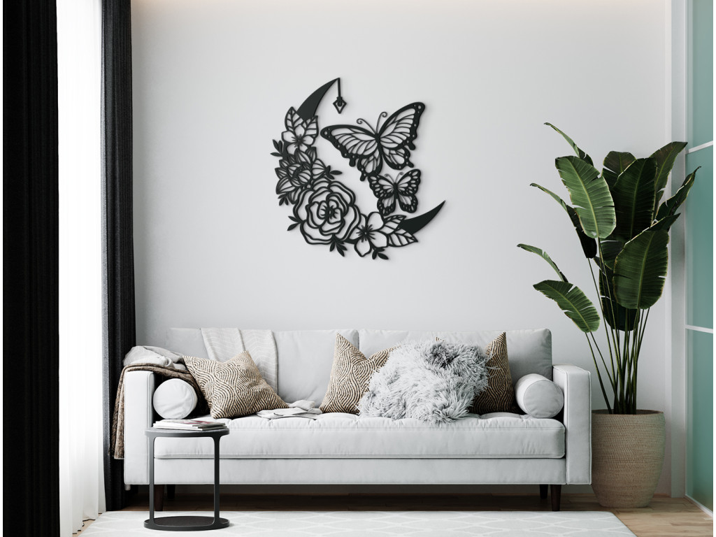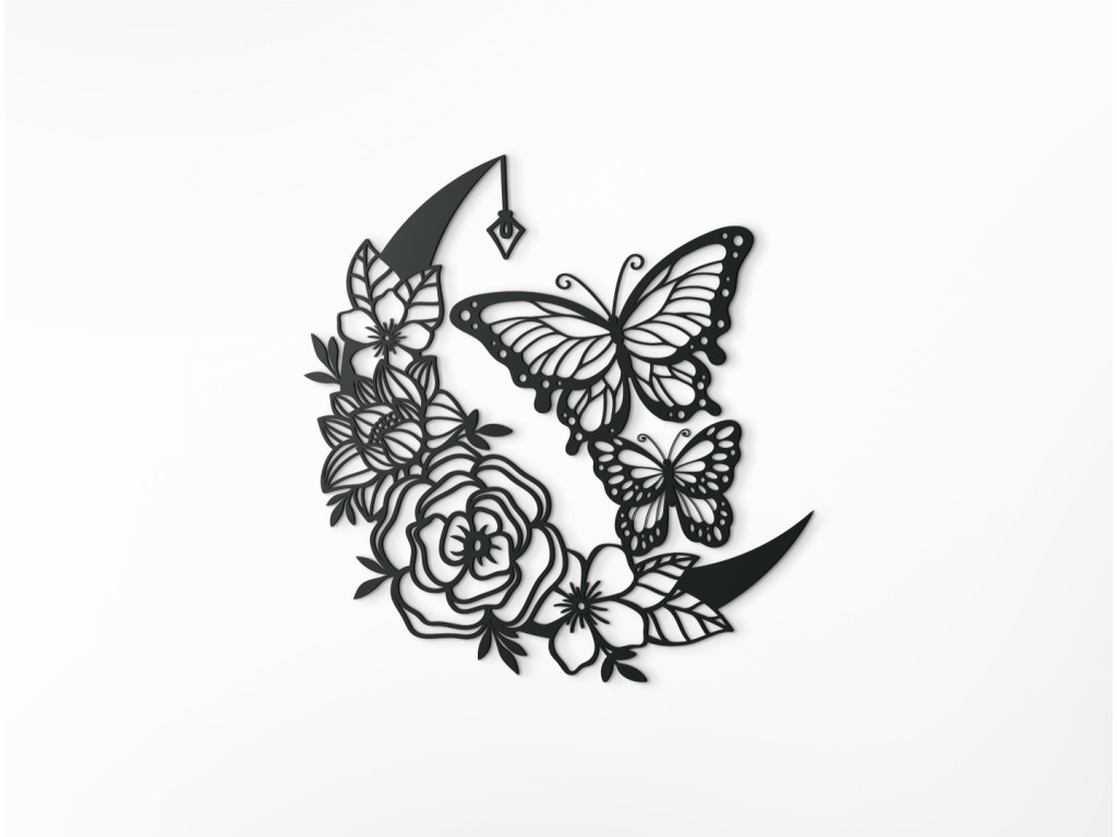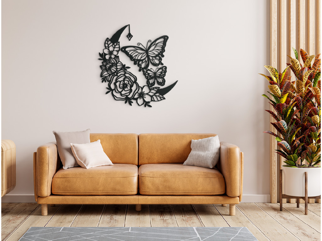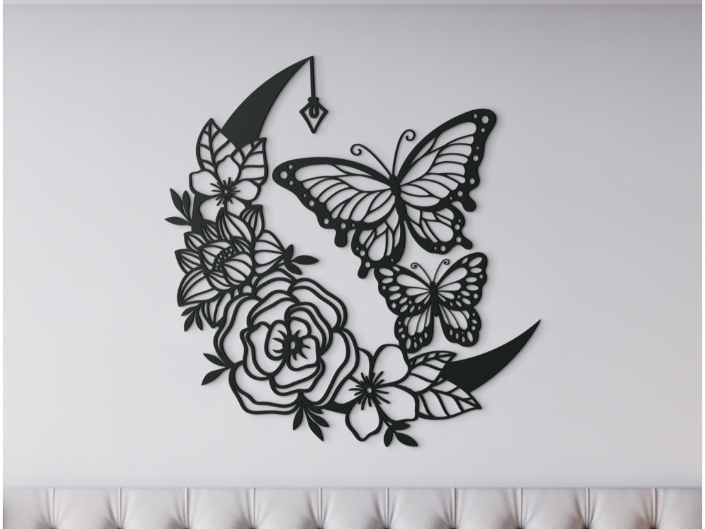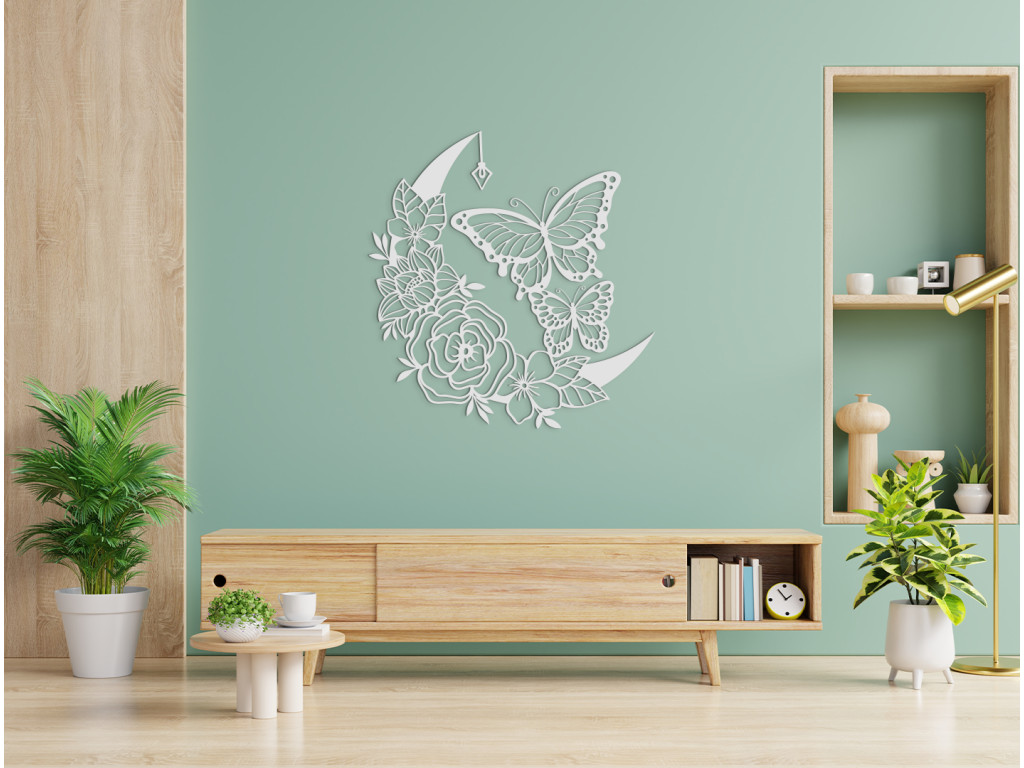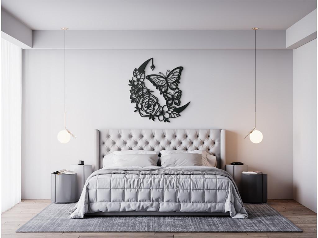 Ruže a motýle - to je nadčasová kombinácia očarujúcej dvojice, ako stvorená do spálne, obývačky alebo predsiene. Efektná drevená nálepka s rozkvitnutými ružami, polmesiacom, lampášikom a dvoma poletujúcimi motýľmi však ukážkovo skrášli ktorúkoľvek zvolenú stenu v miestnosti.
