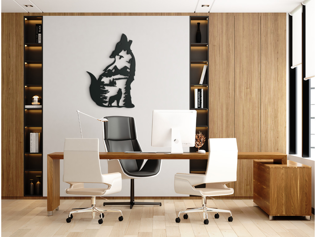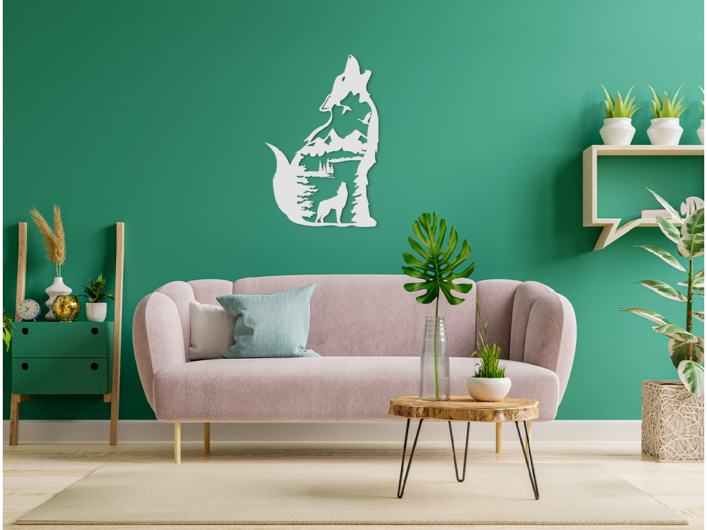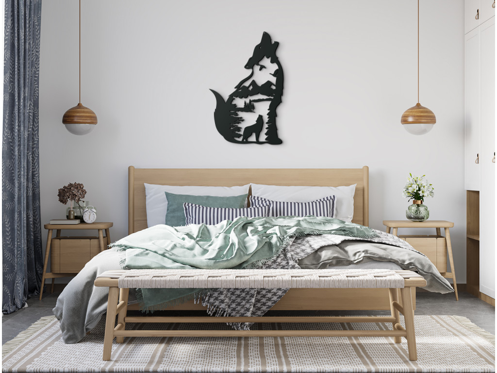 Dodajte svojej spálni, pracovni alebo obývačke tajomnú atmosféru vďaka obrazu s magickým vlčím motívom. Drevená nálepka s vyobrazením zavýjajúceho vlka si získa okamžitú pozornosť každého, kto vstúpi do miestnosti. Umelecké stvárnenie siluety vlka sediaceho a so zdvihnutou hlavou zvolávajúceho svorku v sebe ukrýva obraz horskej krajiny s ďalším, tentoraz stojacim a vyjúcim vlkom.