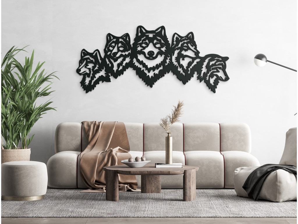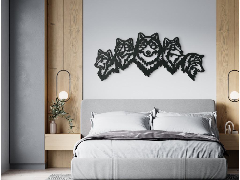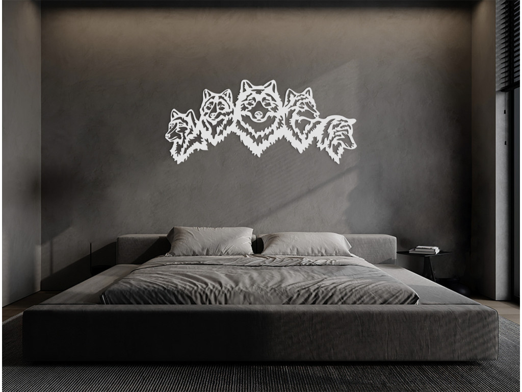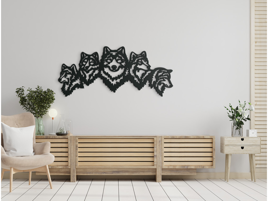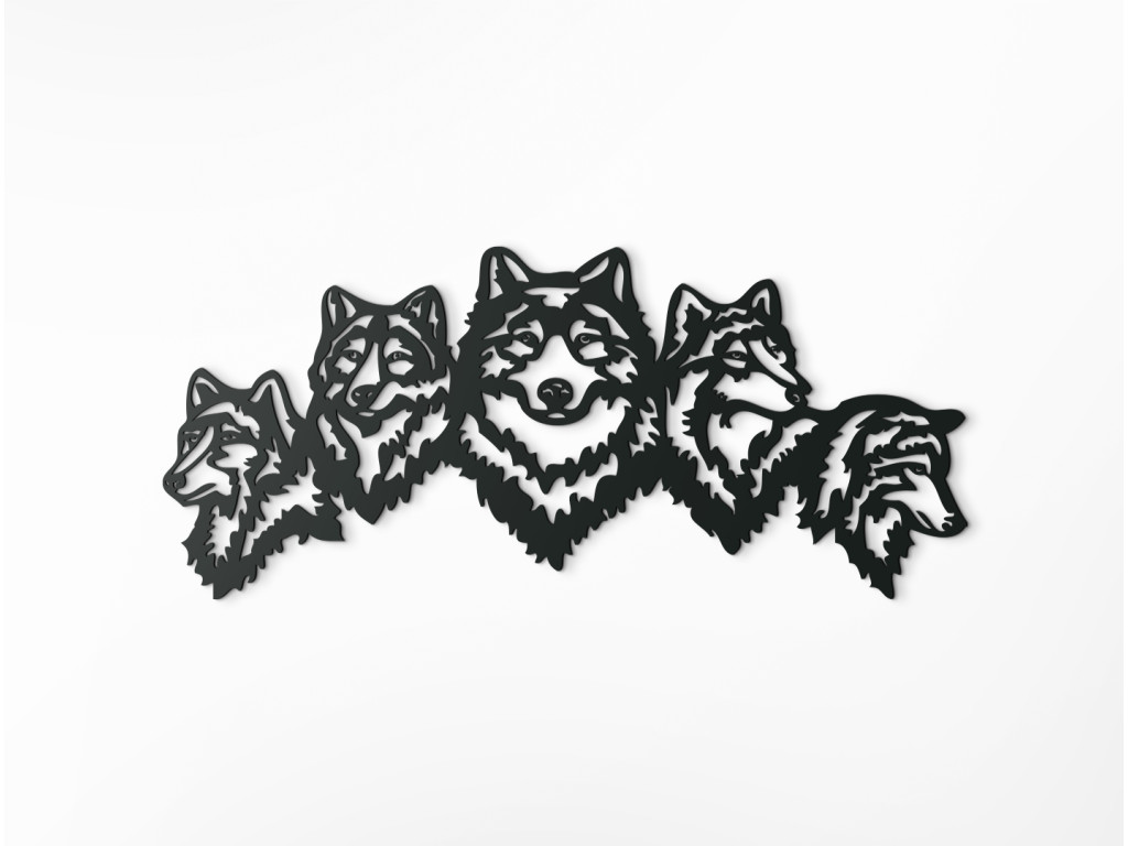 Nalepte si na stenu výraznú drevenú nálepku, ktorá dá vašej spálni, obývačke alebo kancelárii úplne nový vzhľad. 3D dekorácia znázorňuje päticu vlčích hláv s ústrednou hlavou obrátenou dopredu a ostatnými štyrmi viditeľnými z profilu.