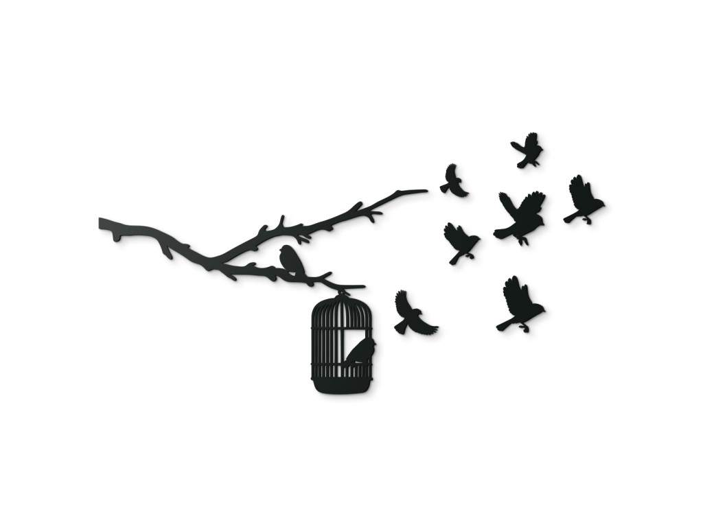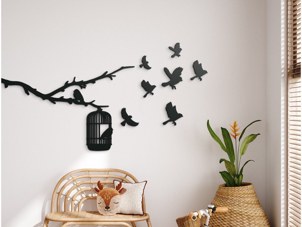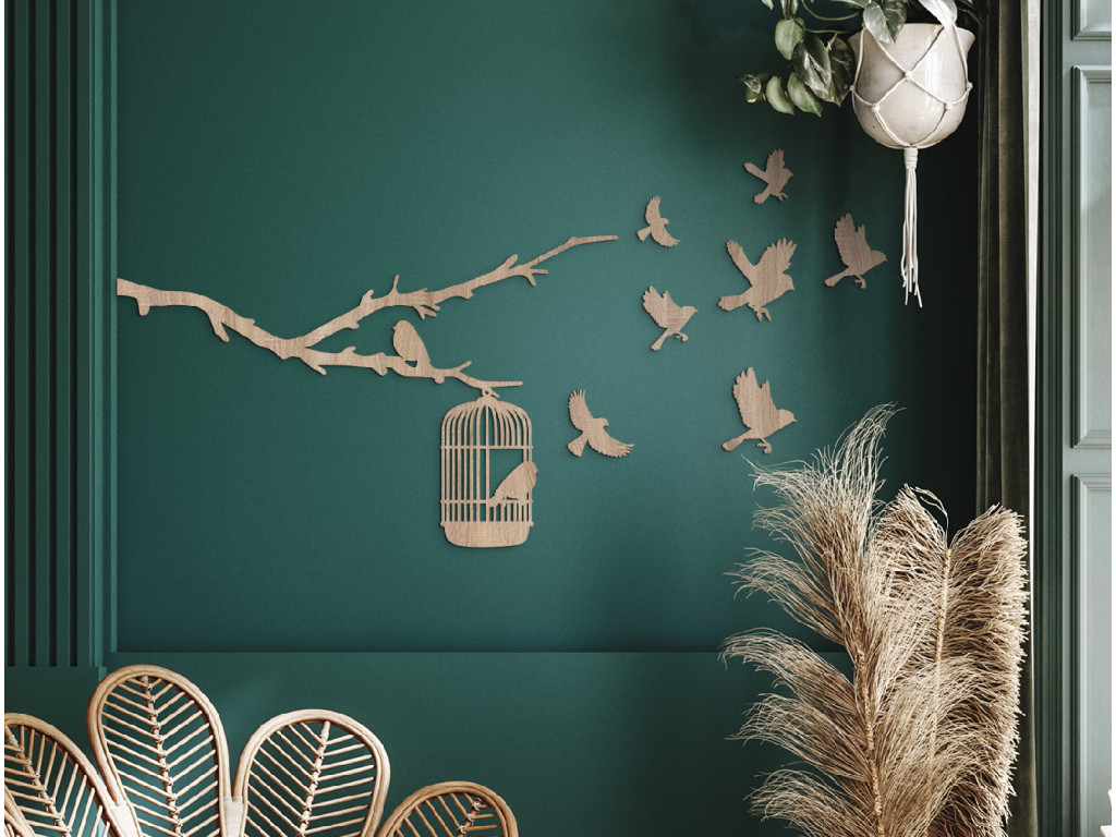 Vtáčatá na slobode symbolizujú únik a slobodu, keď sa vtáčatá vydávajú na svoju cestu z klietky zavesenej na konári. Precízne vyrezávanie a kvalitný drevený materiál dodávajú nálepke autentický a prírodný vzhľad, ktorý sa ľahko integruje do rôznych interiérových štýlov. Táto dekorácia je ideálna pre tých, ktorí chcú svojmu domovu alebo kancelárii priniesť pocit voľnosti a spojenie s prírodou.
