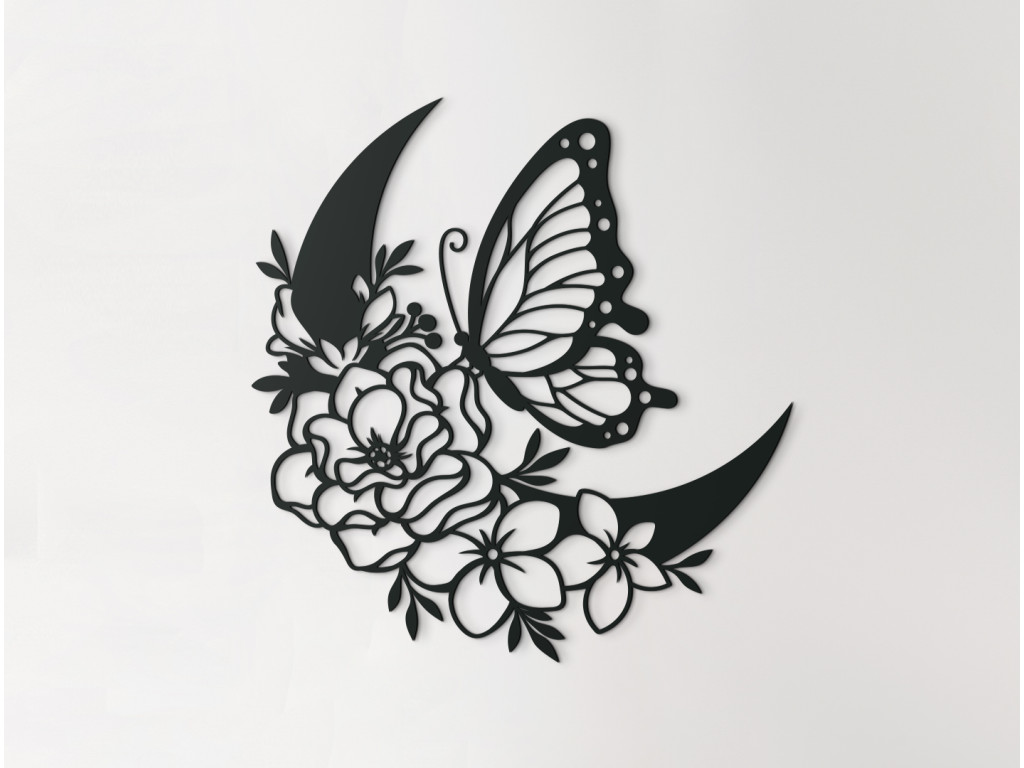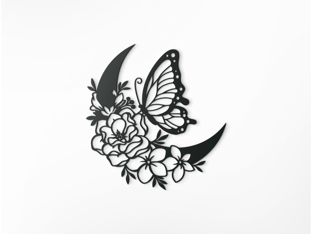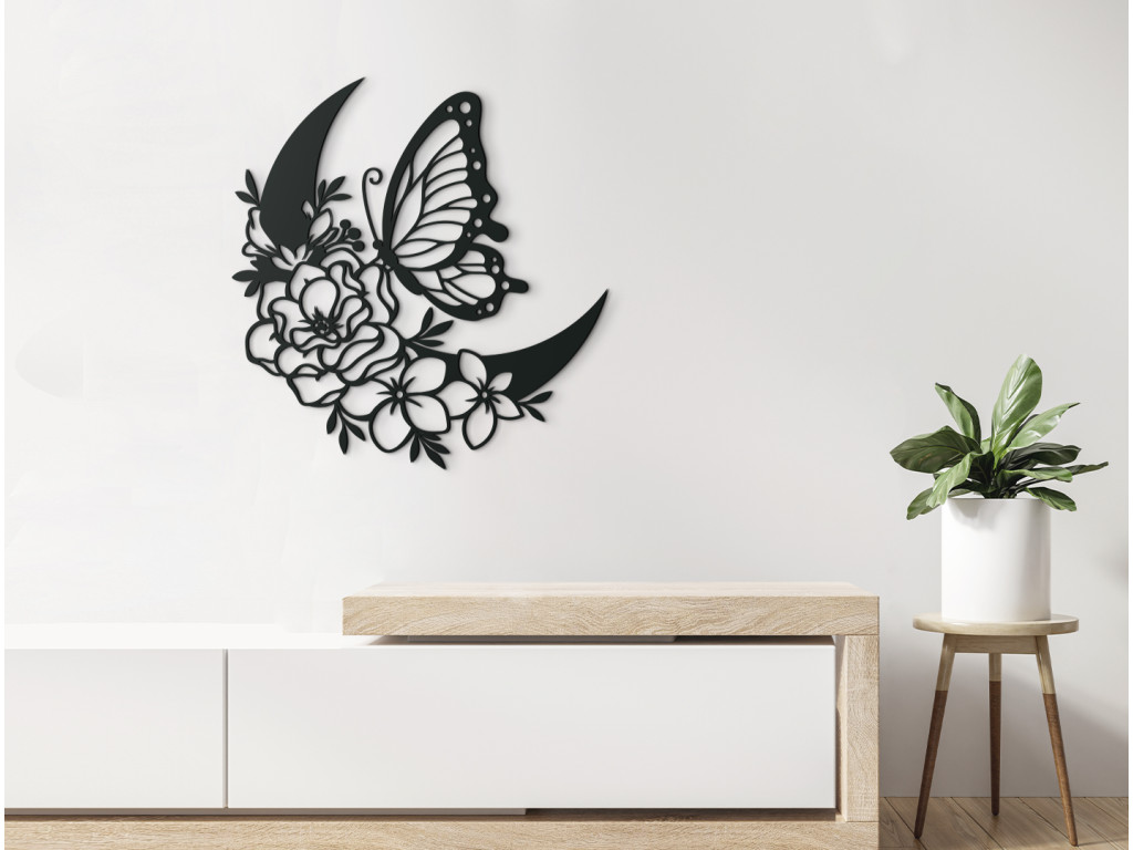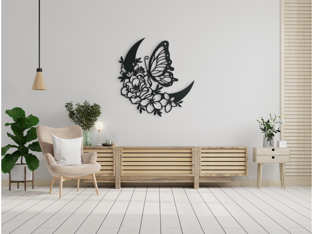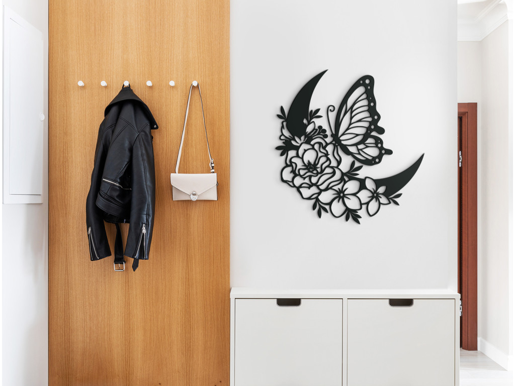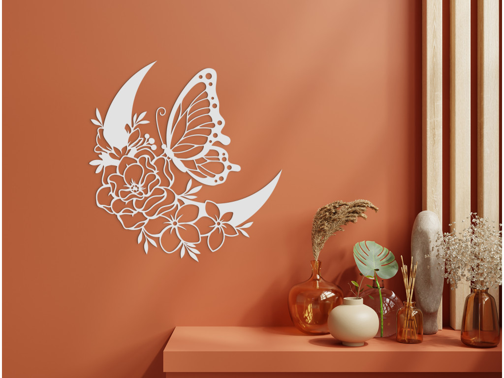 Drevená nálepka s motívom polmesiaca ozdobeného rozkvitnutými kvetinkami, nad ktorými sa vznáša motýľ, prinesie do vašej domácnosti atmosféru pokoja a harmónie. Dekorácia vynikne napríklad na stene v predsieni, nad gaučom v obývačke alebo nad stolom v kancelárii.