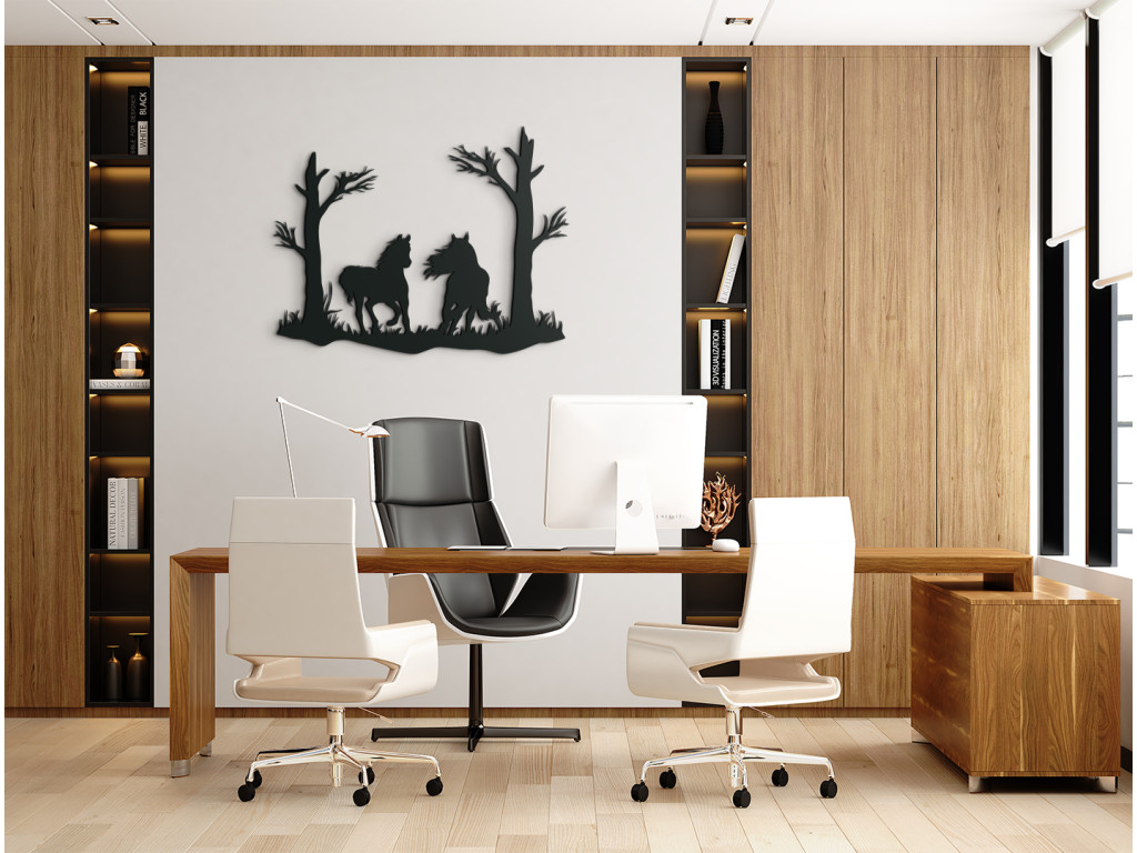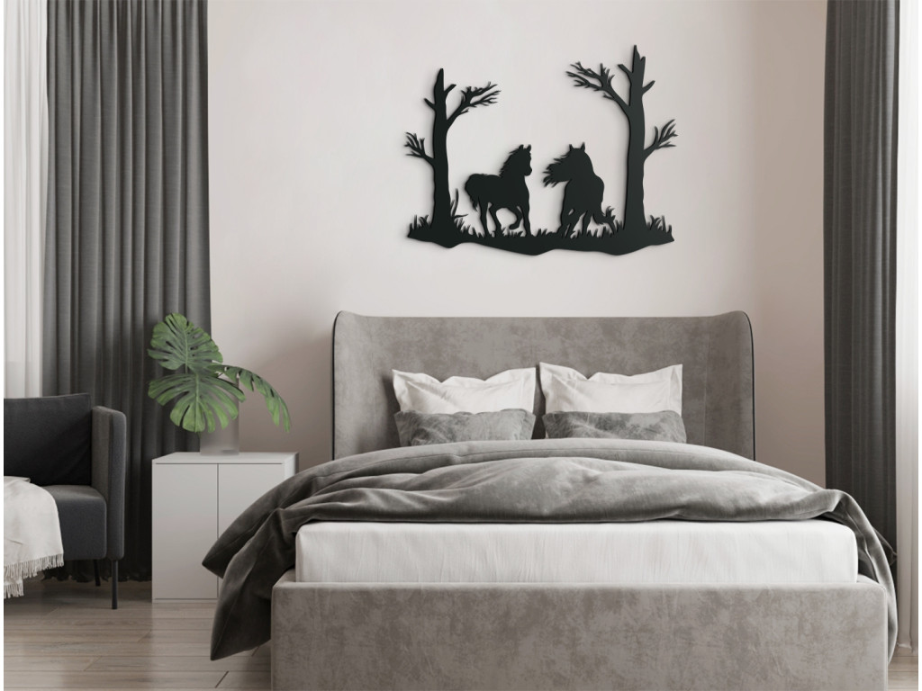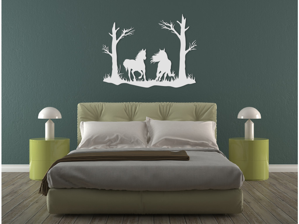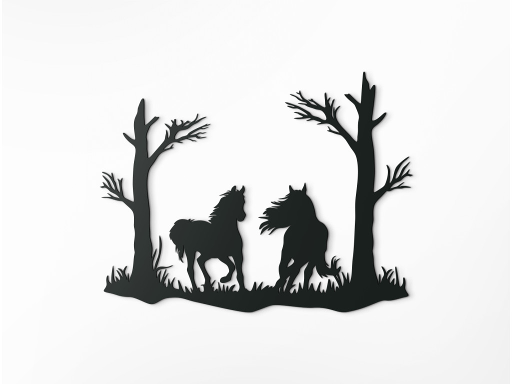 Vyrezávaná nálepka na stenu Kone pod stromami výborne vynikne v obývačke, spálni, v pracovni i v predsieni. Dekorácia znázorňuje dvojicu koní bežiacich pod stromami, pričom jeden klusá a druhý cvála, až mu veje hriva. Nálepka je mimoriadne vhodná ako darček pre milovníkov koní