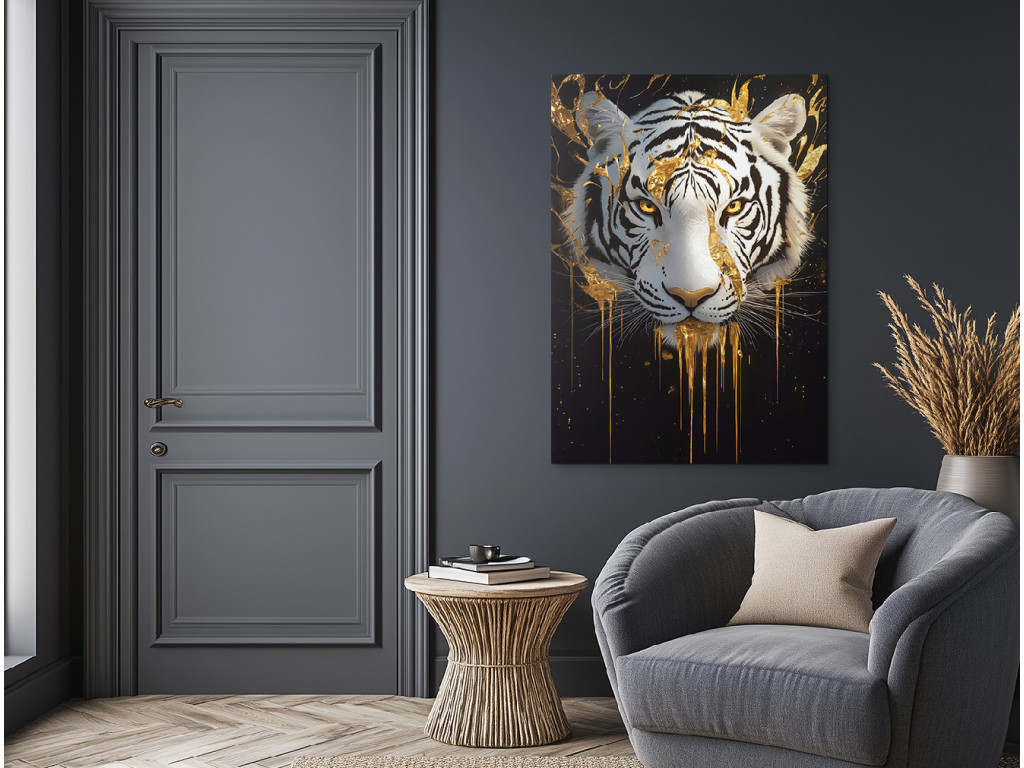À travers les yeux du tigre blanc est une image exceptionnelle qui allie sauvagerie et noblesse en une seule silhouette : la tête d'un tigre blanc. Ses yeux jaunes brillent dans l'obscurité avec une force pénétrante, tandis que les accents dorés ressemblent à du métal liquide coulant sur sa fourrure et se répandant dans le fond noir. Le contraste entre la fourrure blanche, les rayures noires et les détails métalliques crée une impression de luxe, de puissance et d'émotions immobiles en mouvement. Le tableau est le point focal idéal pour un intérieur à la recherche d'un visuel vraiment exceptionnel.