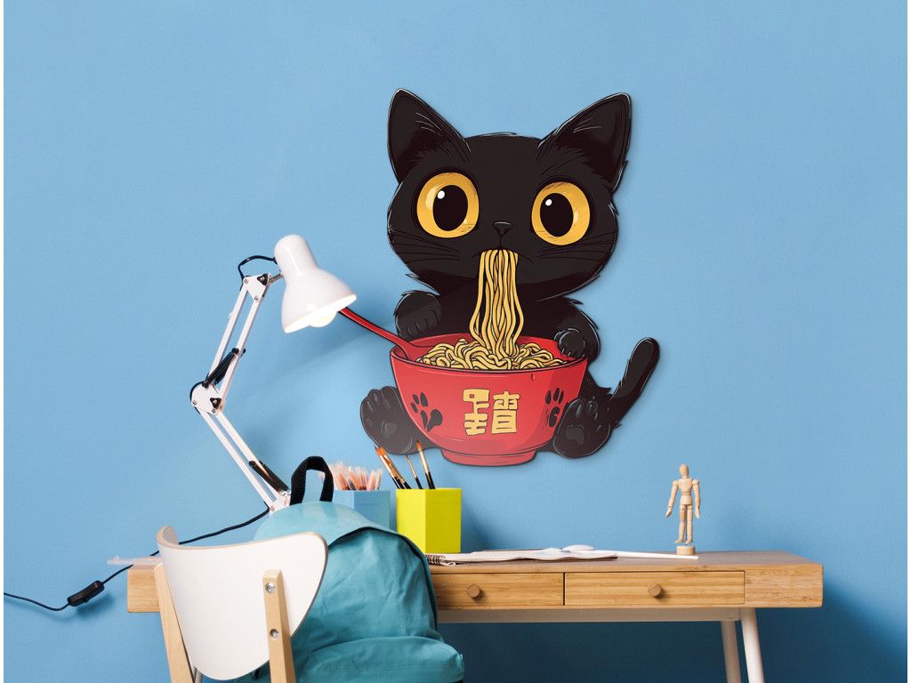 Cette adorable petite chatte noire savoure tranquillement son bol de ramen, les yeux ouverts de bonheur et la patte prête à prendre une autre bouchée. L'illustration associe la culture japonaise au charme espiègle des chats et fera certainement sourire tous les amateurs de chats et de cuisine asiatique.