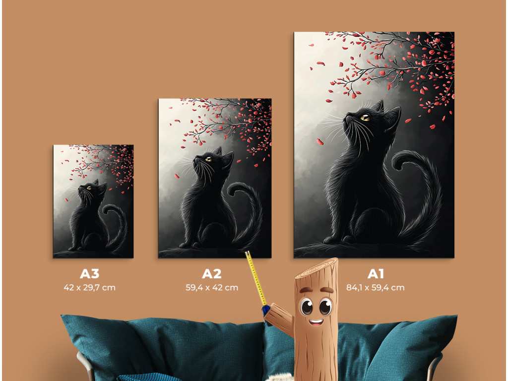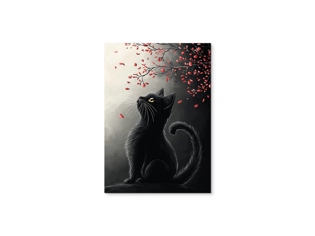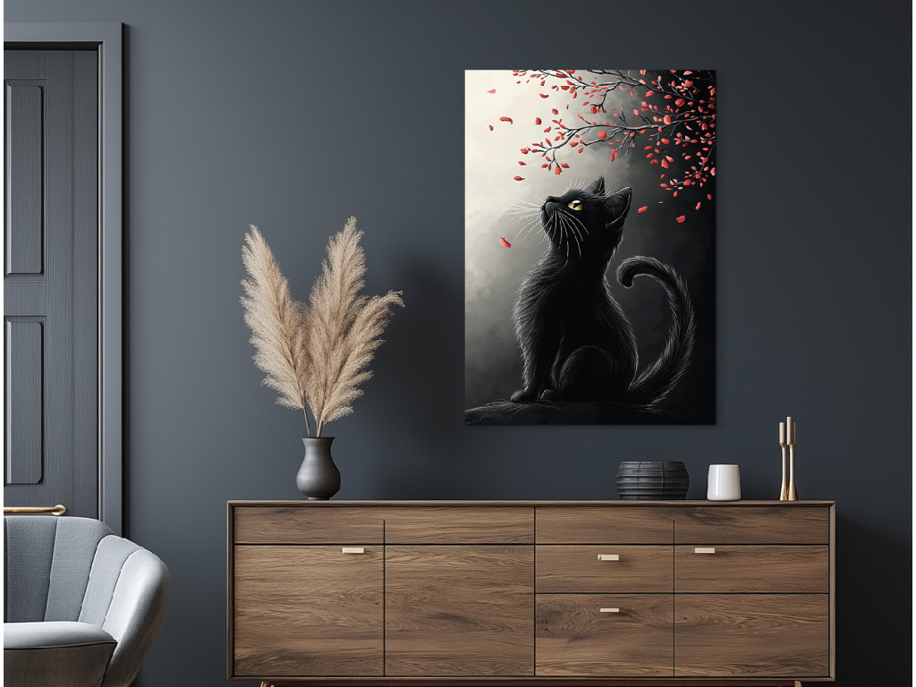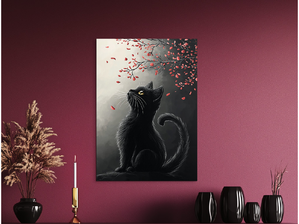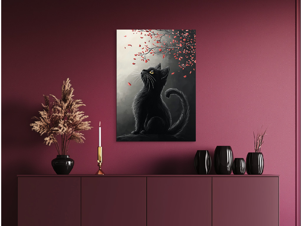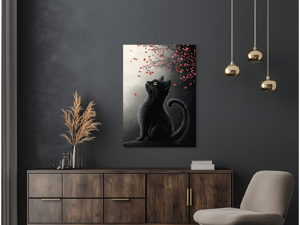 Chat sous un buisson rouge est un tableau minimaliste et suggestif qui capture un petit chat noir de profil, caché sous un buisson rouge vif. L'ensemble de la toile est décliné dans des tons sombres de noir, ce qui permet de faire ressortir la silhouette du chat et la couronne rouge vif de la plante au-dessus de lui. Silence, solitude et symbolisme : le tableau dégage une impression d'introspection, de calme et, en même temps, de douceur mystérieuse.