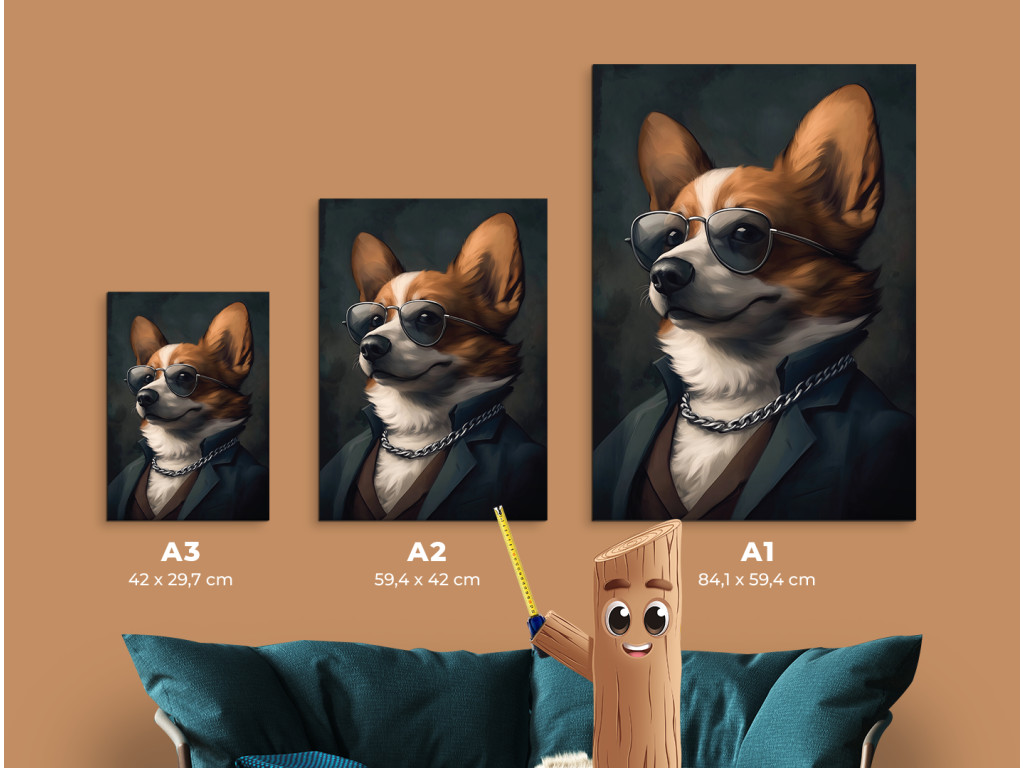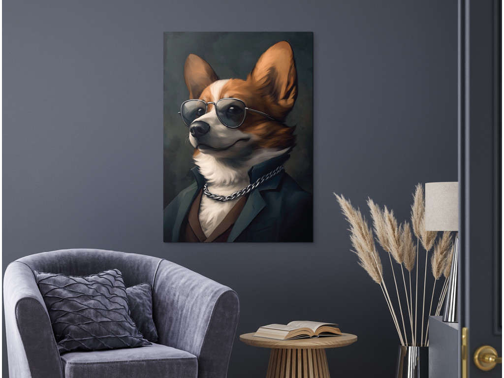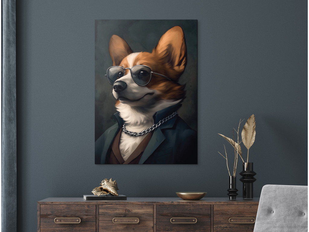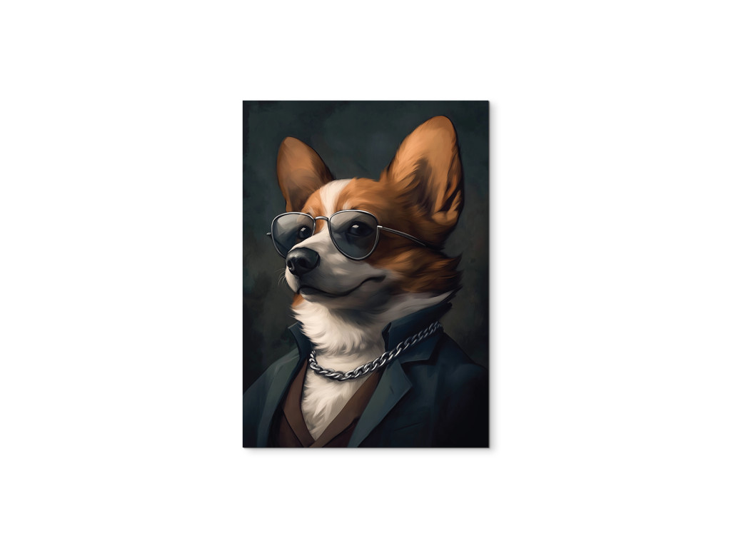 Corgi avec respect est un portrait original d'un chien de race Welsh Corgi Pembroke, représenté comme un chef avec un charme naturellement « gangster ». Vêtu d'une veste sombre, d'une chemise et d'une cravate, avec une lourde chaîne en argent autour du cou et des lunettes de soleil, il semble sûr de lui, élégant et un peu dangereux. Le contraste amusant entre la gentillesse typique du corgi et son « air dur » fait de cette image une pièce exceptionnelle, idéale pour un intérieur avec un sens de l'humour, du style et de l'art non conventionnel.