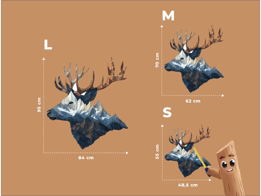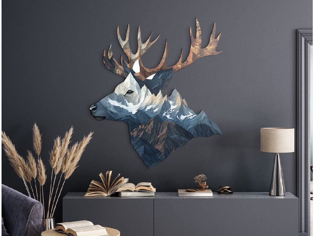 La représentation artistique de la tête d'un cerf associée à un paysage montagneux majestueux crée un symbole visuel fort de la connexion entre l'animal et la nature. Le cerf apparaît ici comme le gardien silencieux de la nature sauvage, pur, libre et digne. Cet élément décoratif incarne la paix, l'équilibre et l'élégance naturelle, qui ressortira dans n'importe quel intérieur.